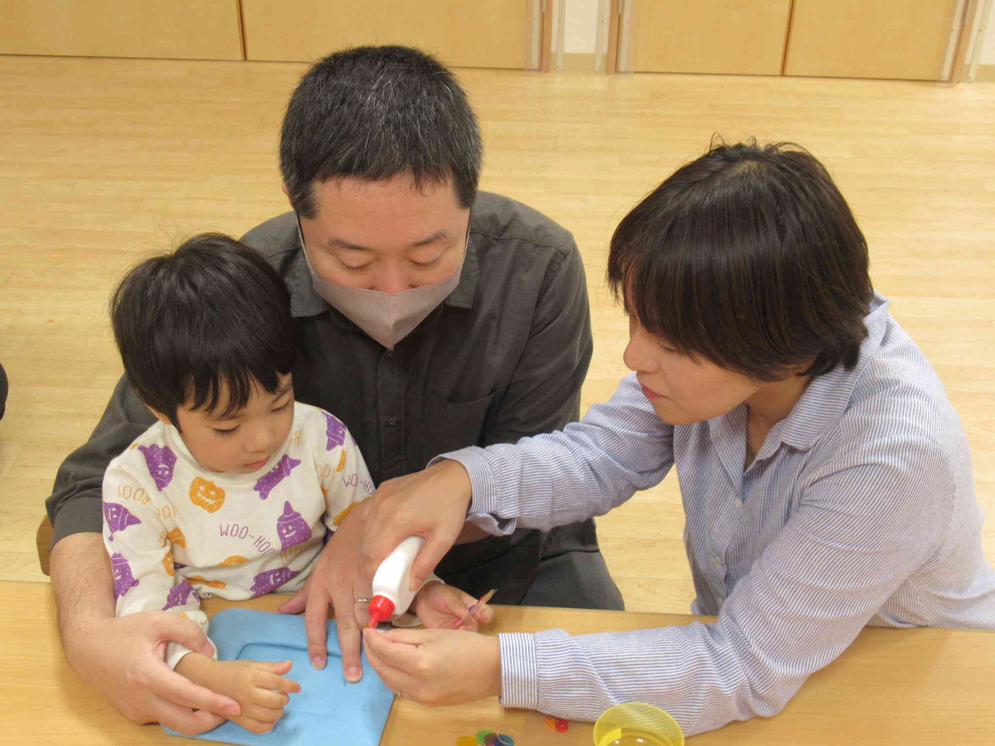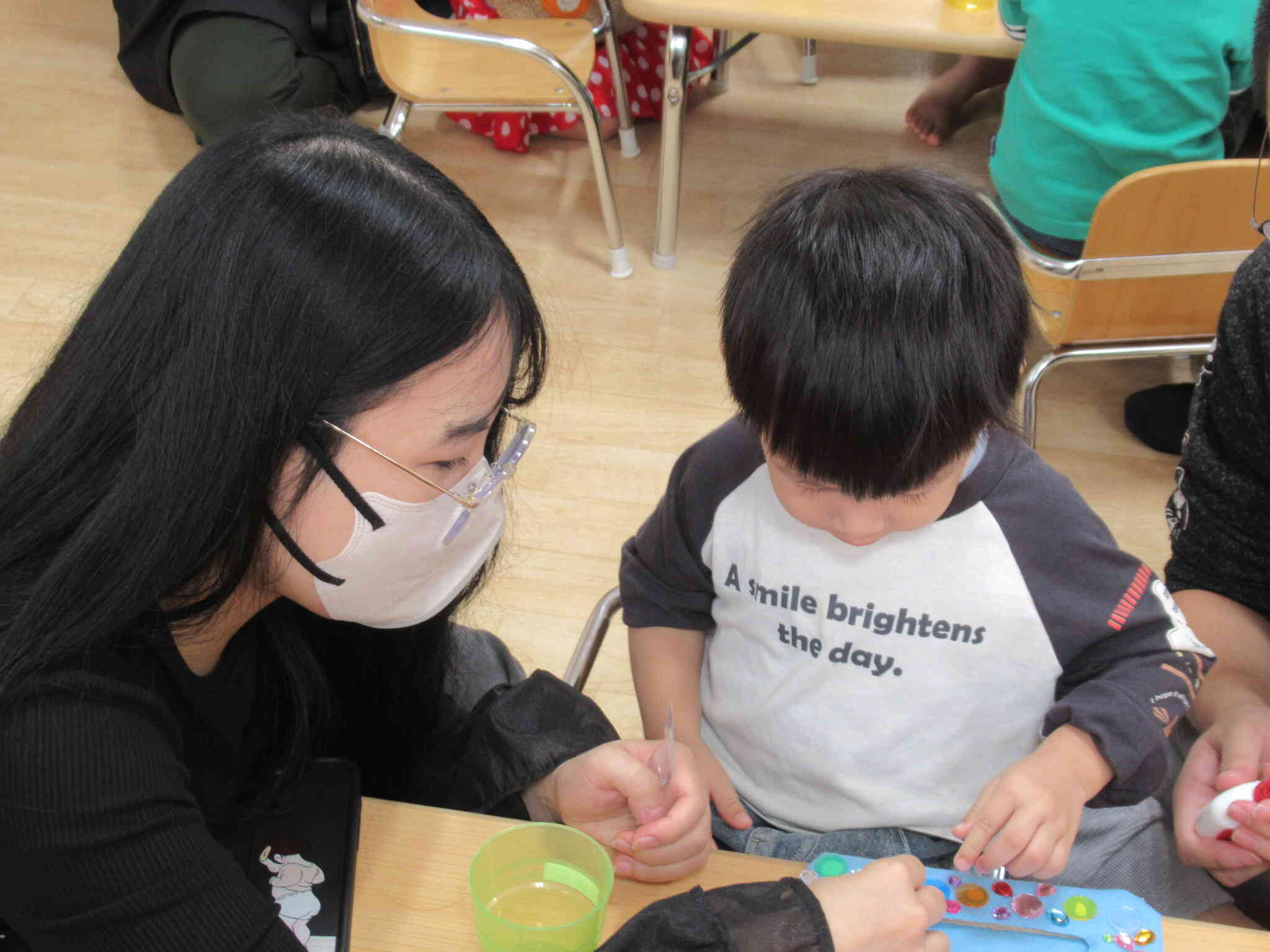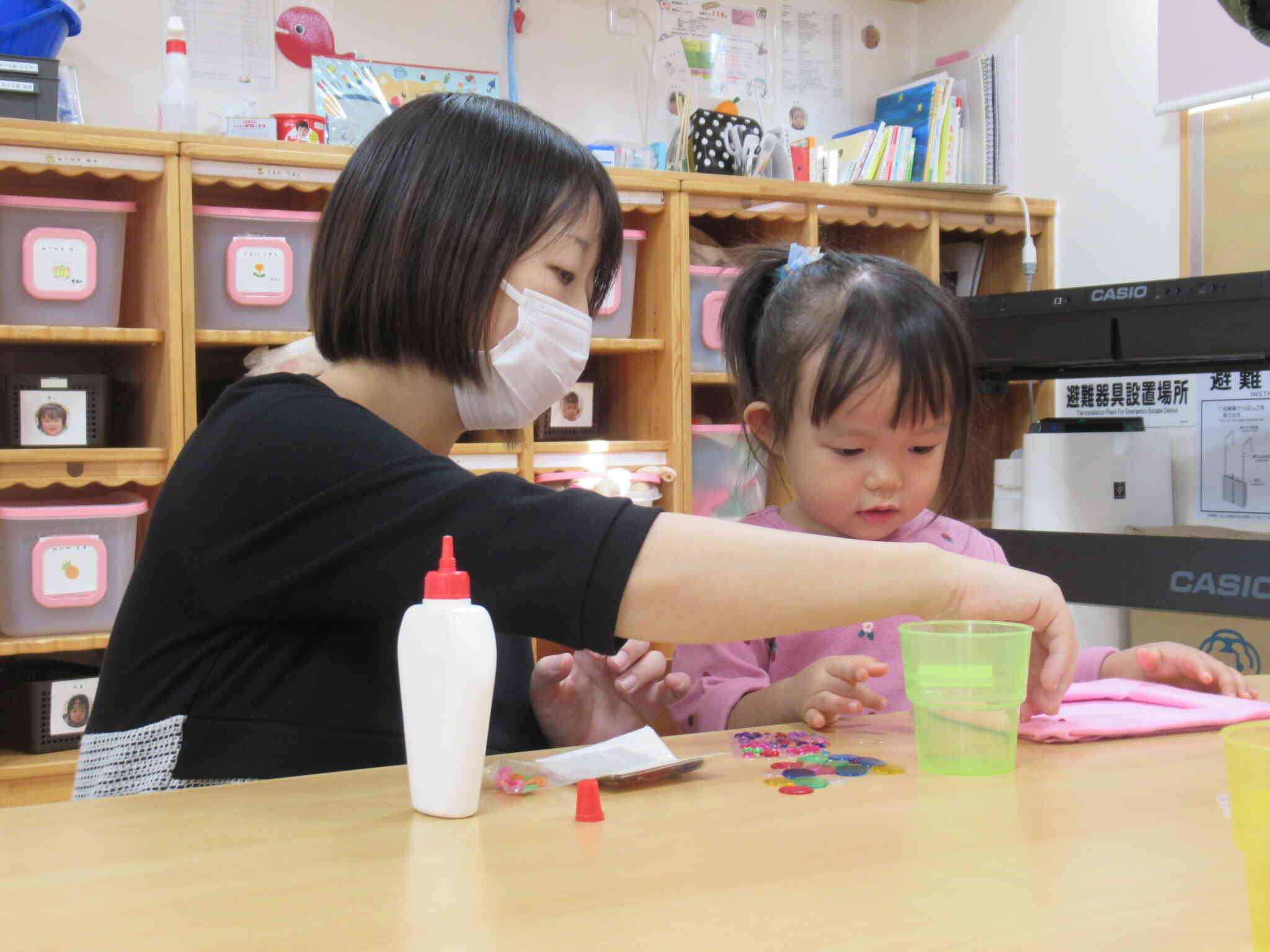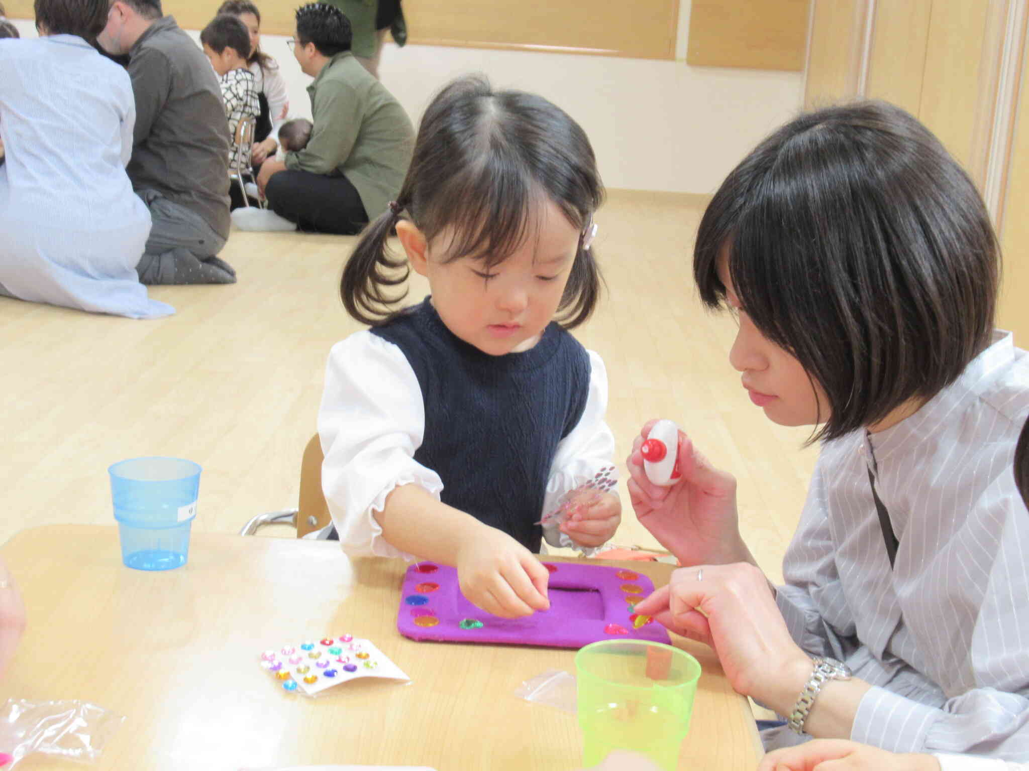0歳児のクラスのお友だちは、まだ小さいパーツを付けることが難しいので、ママたちが作っていました。