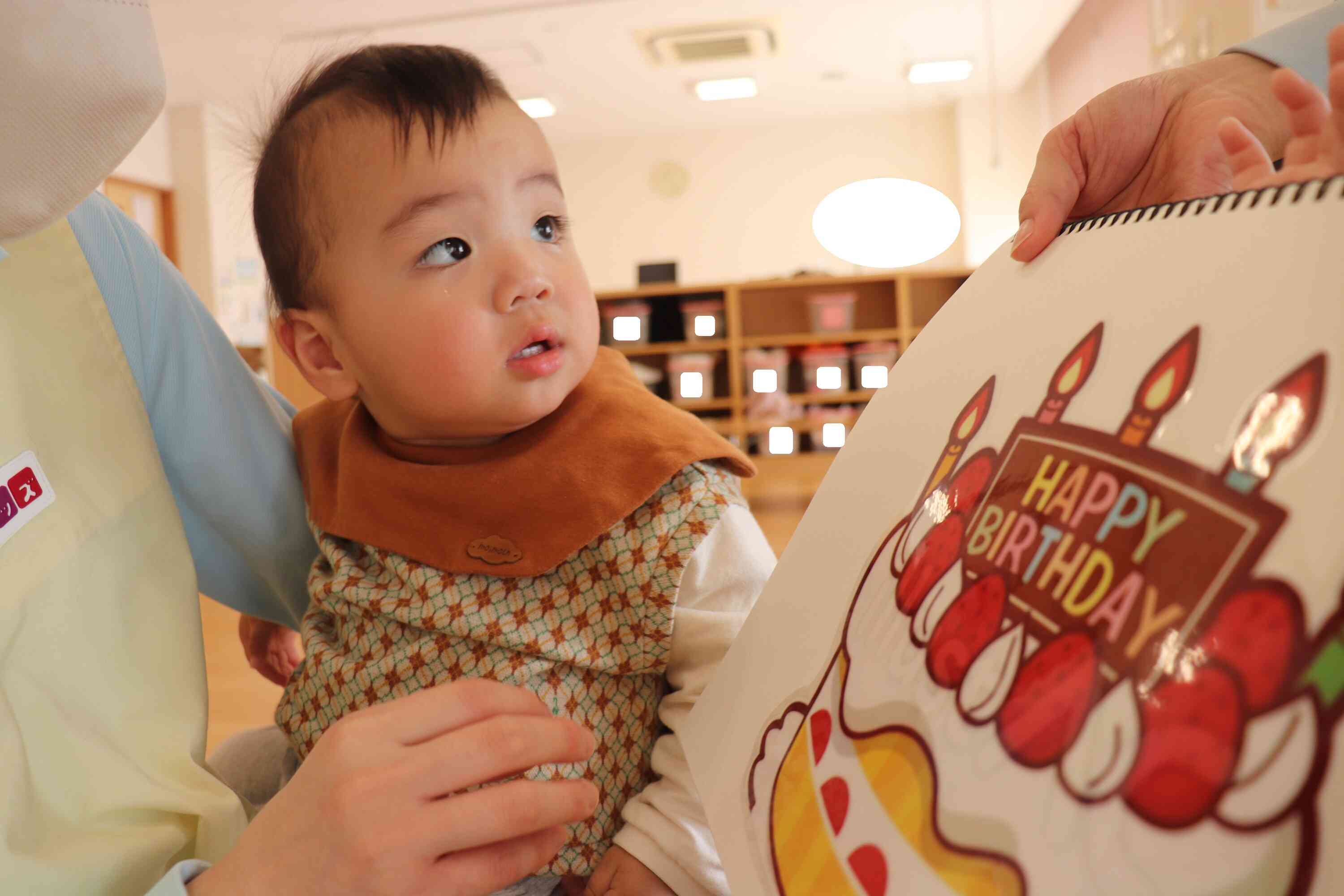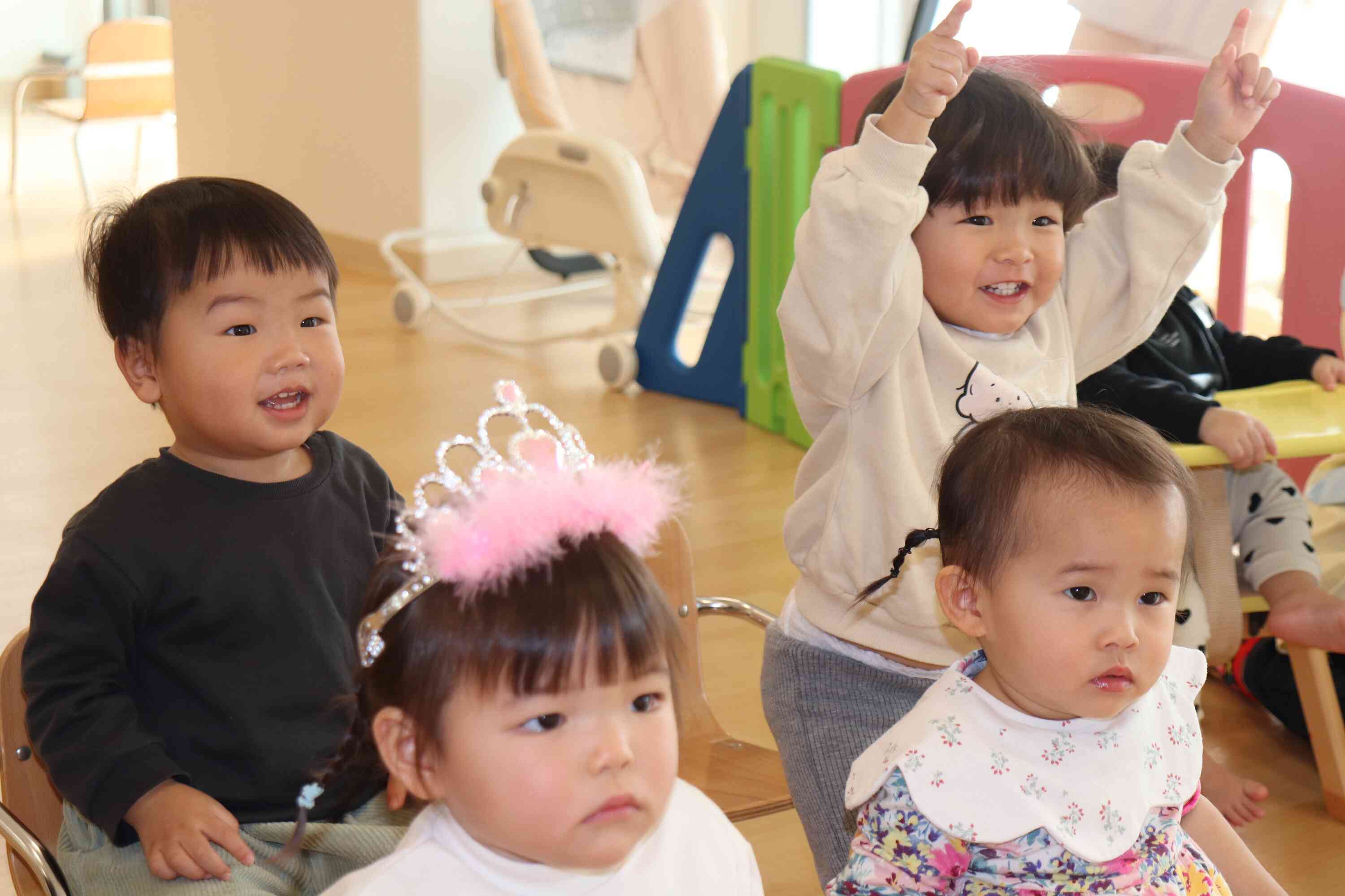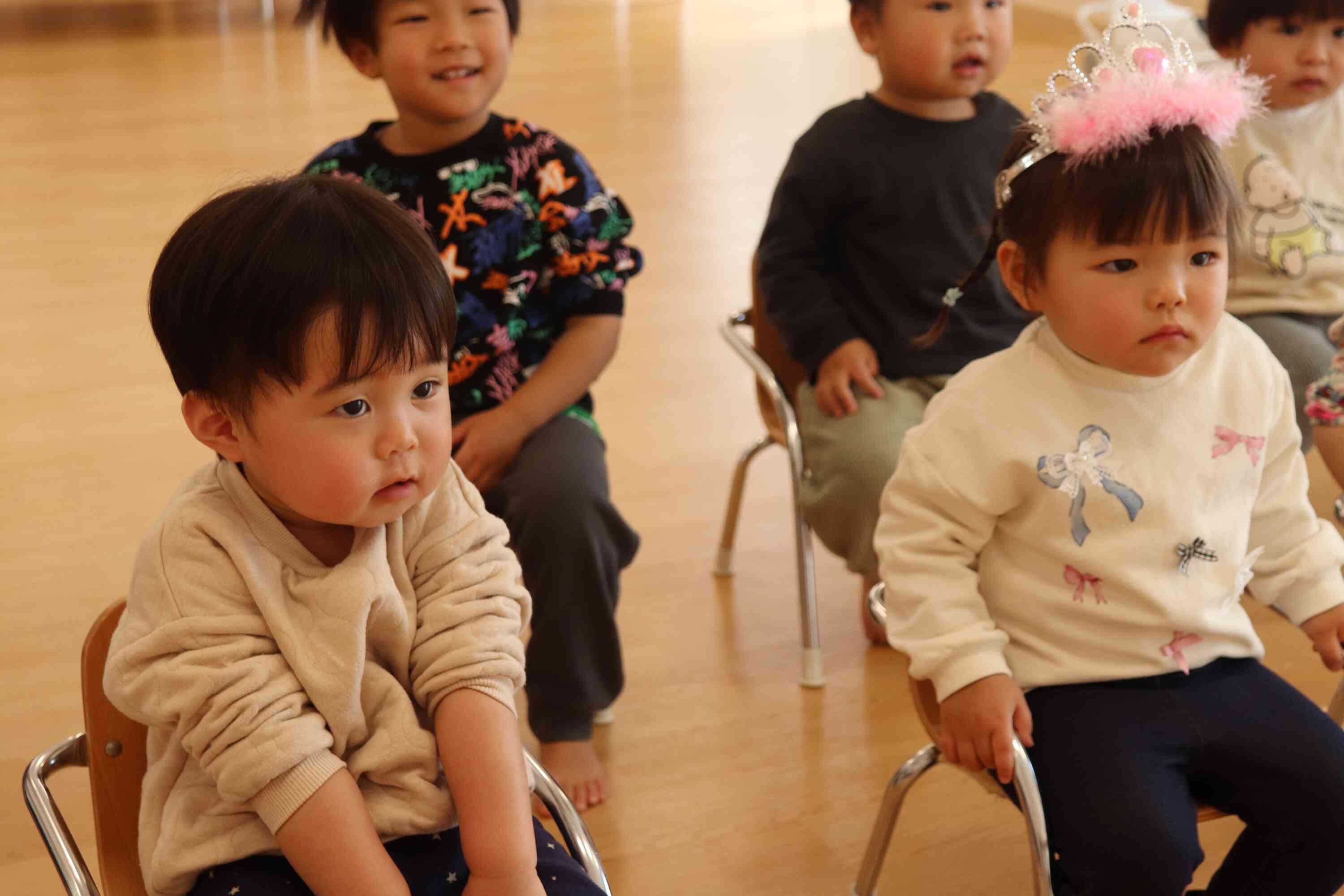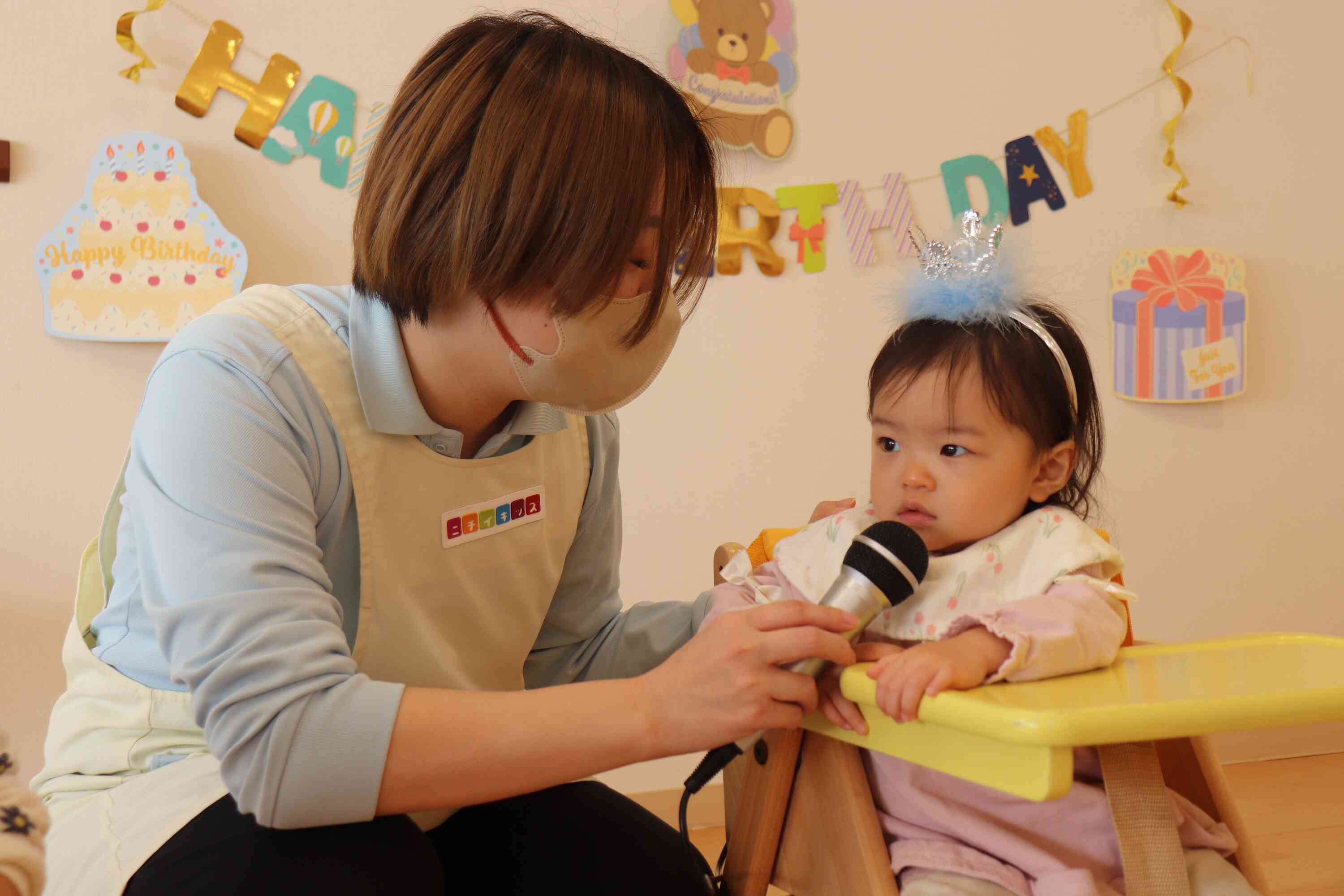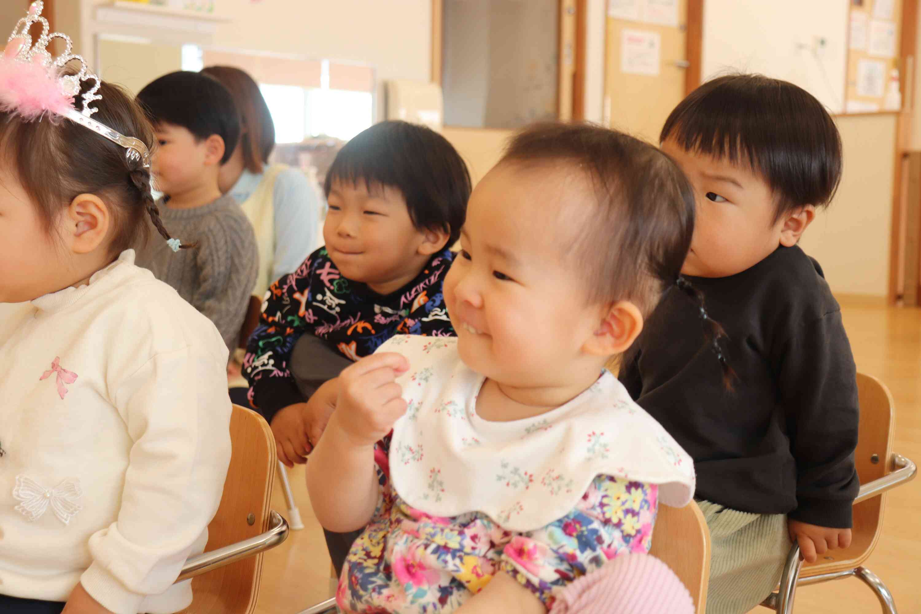 今月の誕生者は3人で、素敵な被り物をして保育者と一緒に前に出て、みんなにお祝いしてもらいました。名前を呼ばれるとにこっと笑ったりマイクを持って自分で名前を言ってみたりとそれぞれの可愛らしい反応が見られました!お友だちからは「ハッピーバースデー」の歌と「おめでとう!」とのプレゼントをもらい、あたたかい雰囲気の中で誕生日会が進みました。