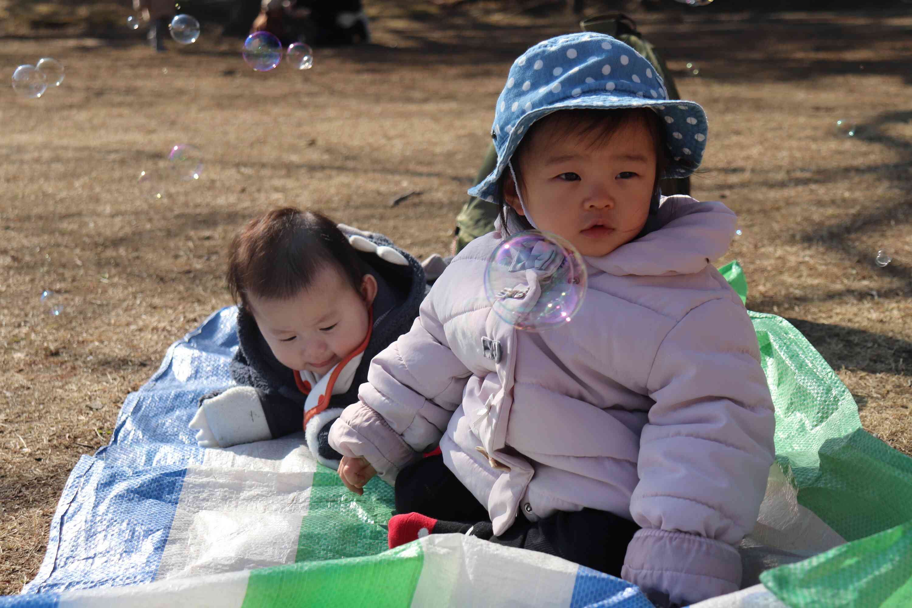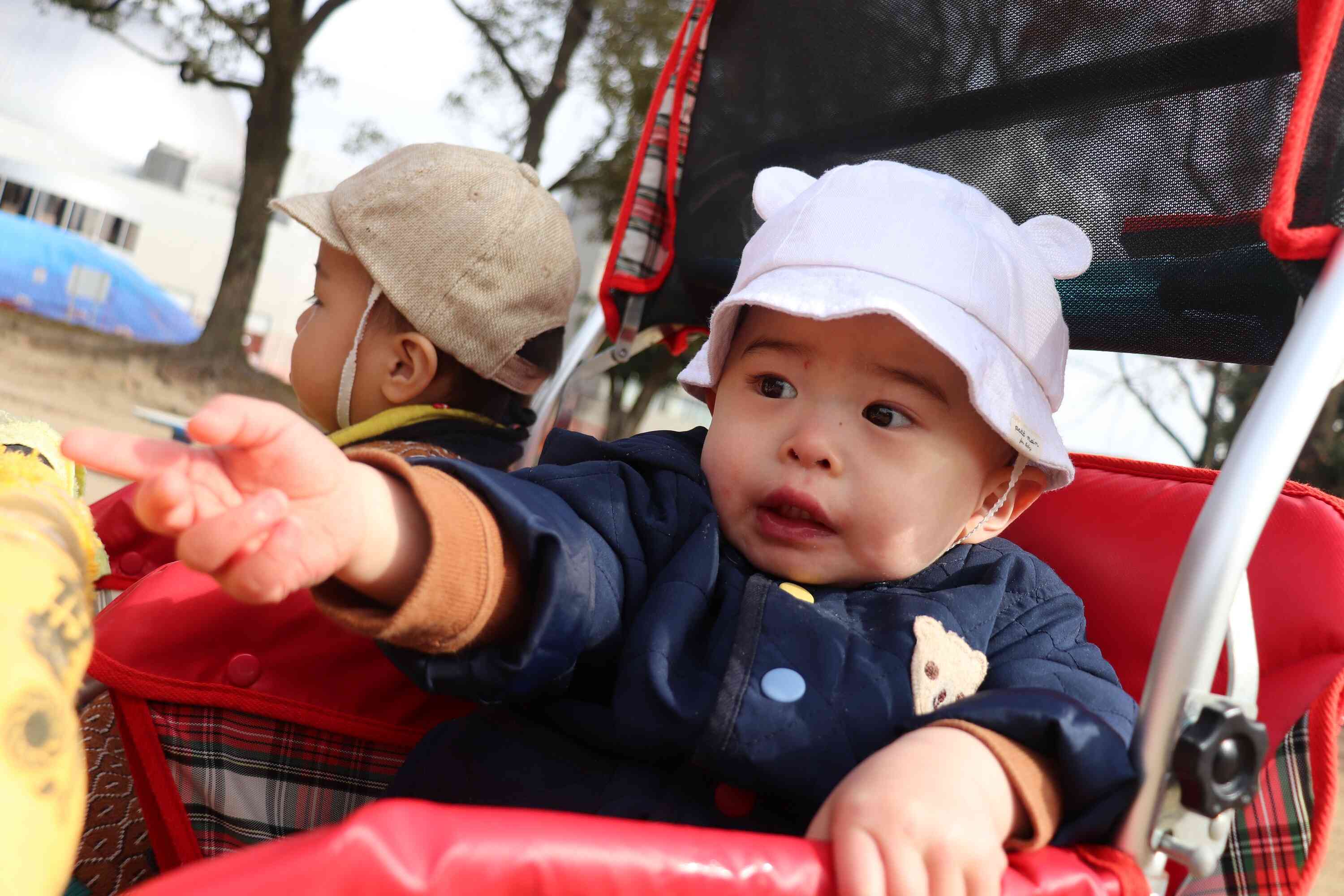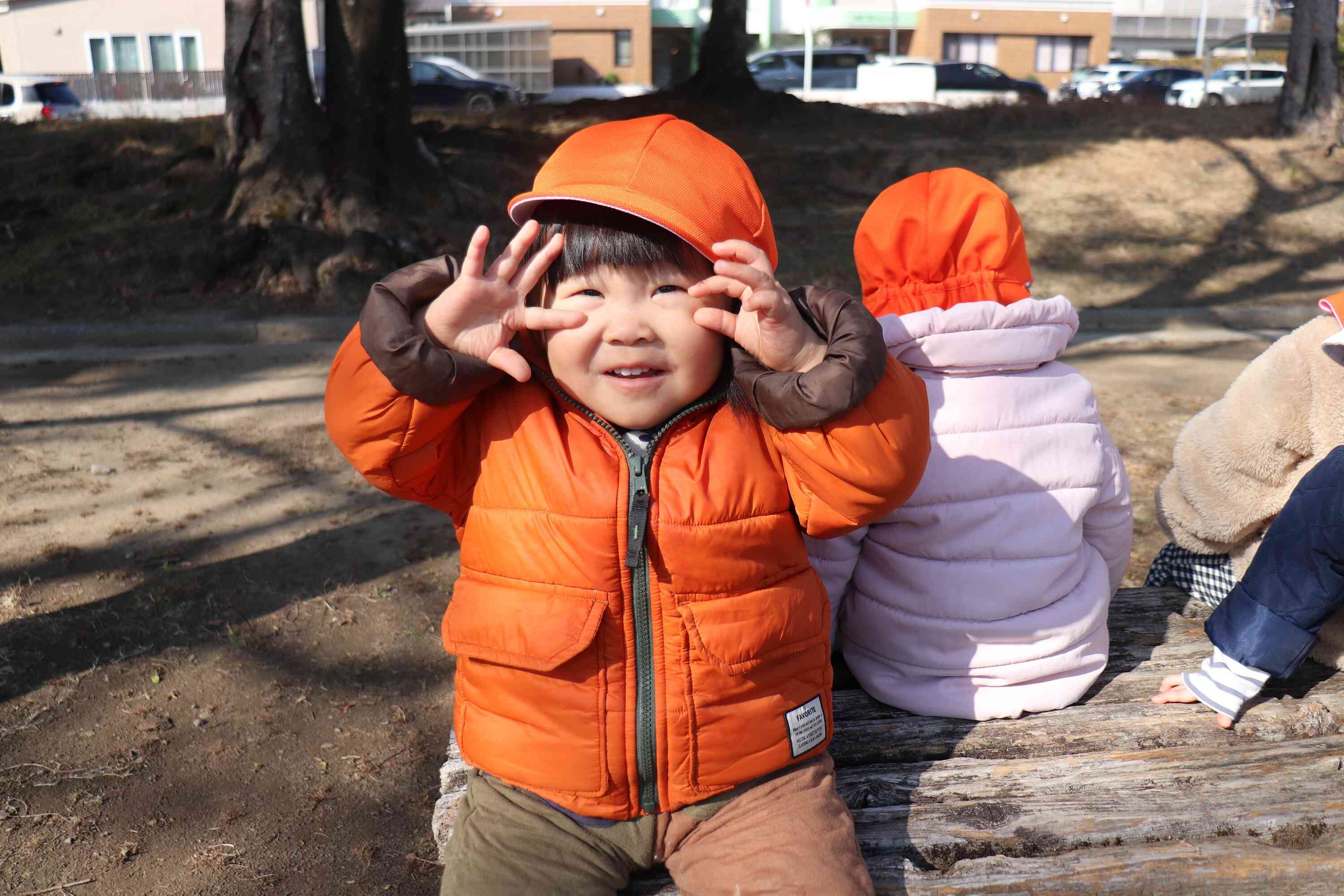 寒い日が続いていますが、お散歩が大好きな子ども達は「今日お散歩行く?」と毎日、楽しみにしています。公園では、ボール遊びをしました。保育者が転がすと、目を輝かせながら追いかけたり、両手で持って「えいっ!」と投げてみたりと遊ぶ様子がありました。途中、公園にたくさんの鳩がやってくると、子ども達はすぐに気づき「あ!」と指をさして大興奮!そっと近づいたり、元気いっぱいに追いかけたりしながら動物への興味を広げていました。