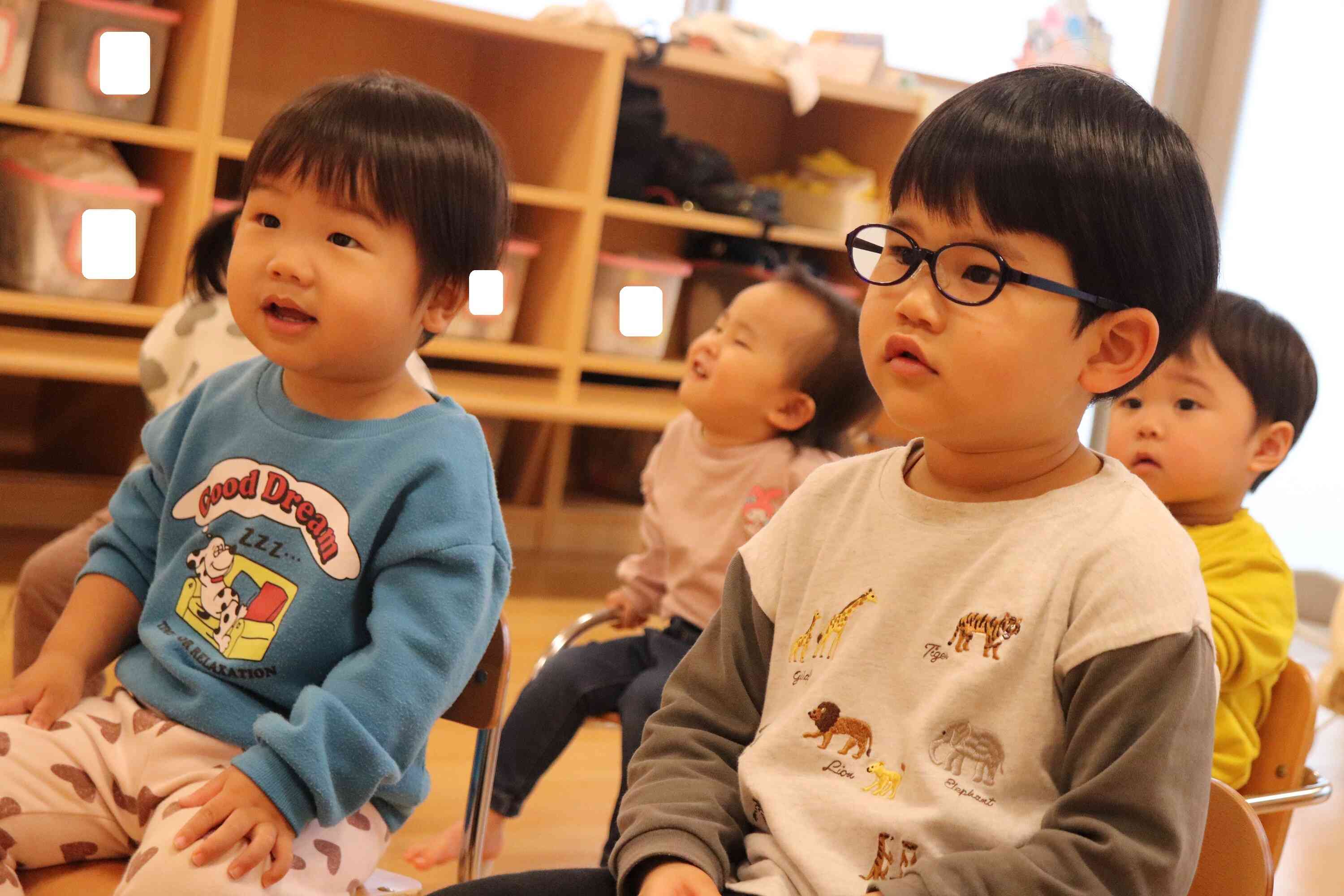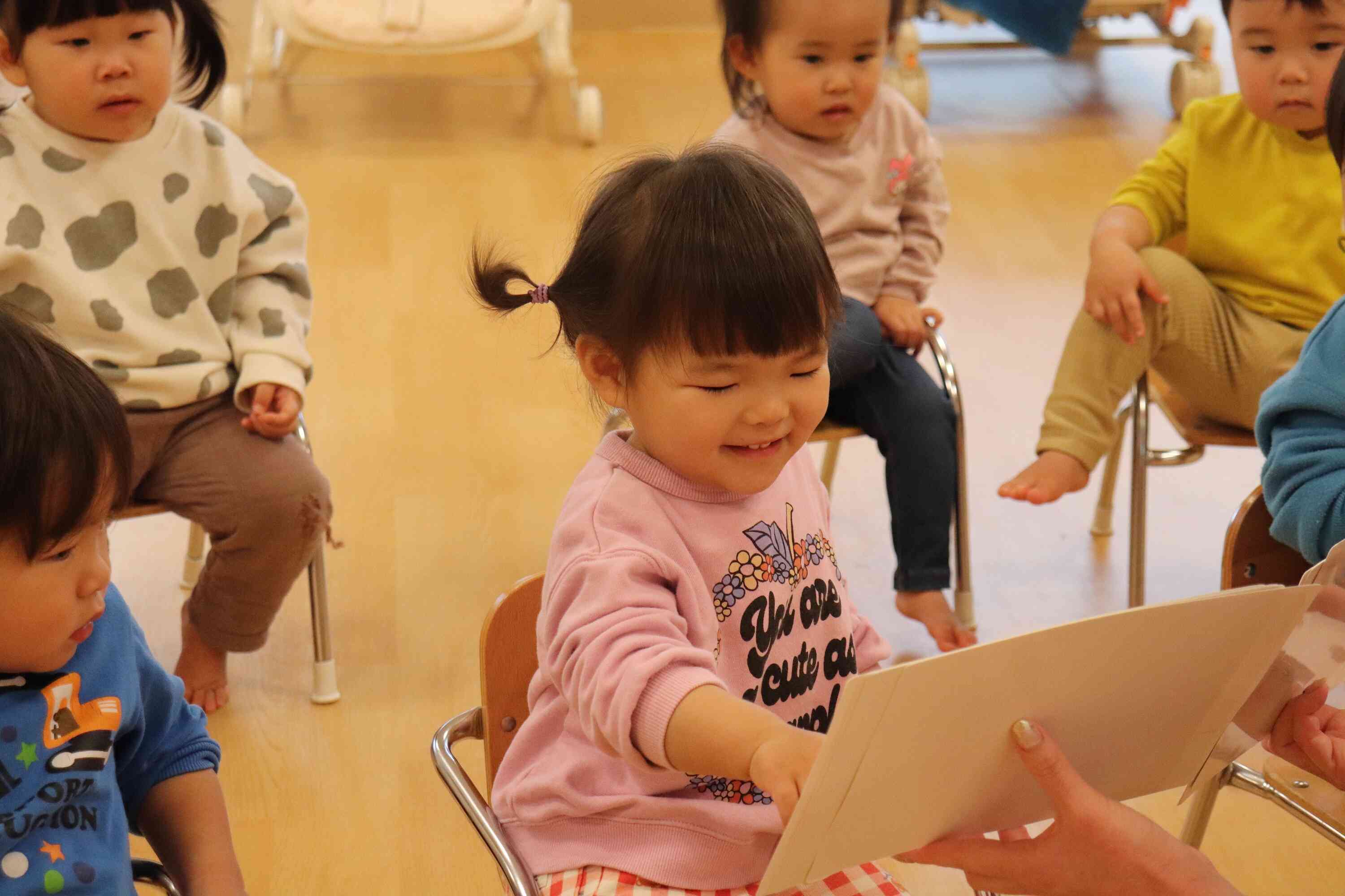 体を動かすゲームや簡単なやり取り遊びも取り入れています。隠された玩具を探したり、カードを使ったゲームで順番を待つ経験をしたりと、友達や先生と一緒に笑いあいながら取り組むことで「英語って楽しい!」という気持ちが育めるようにしています。