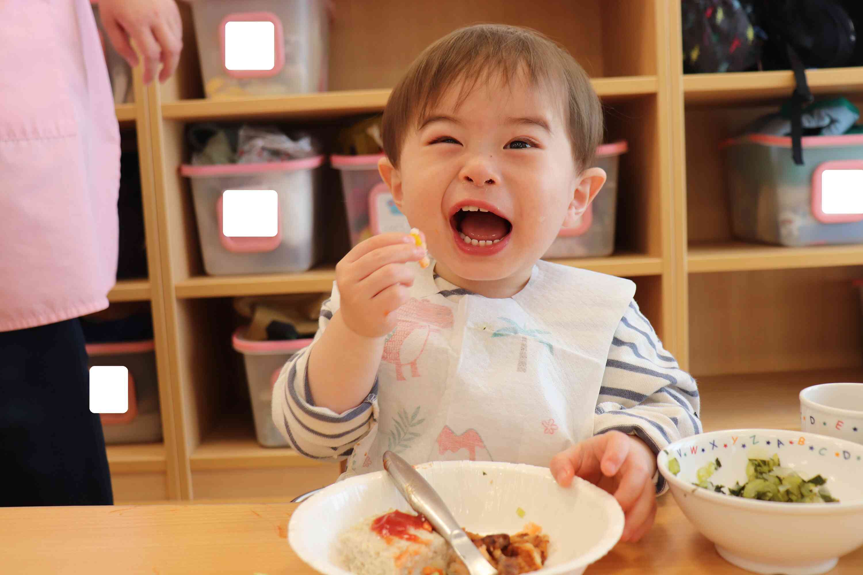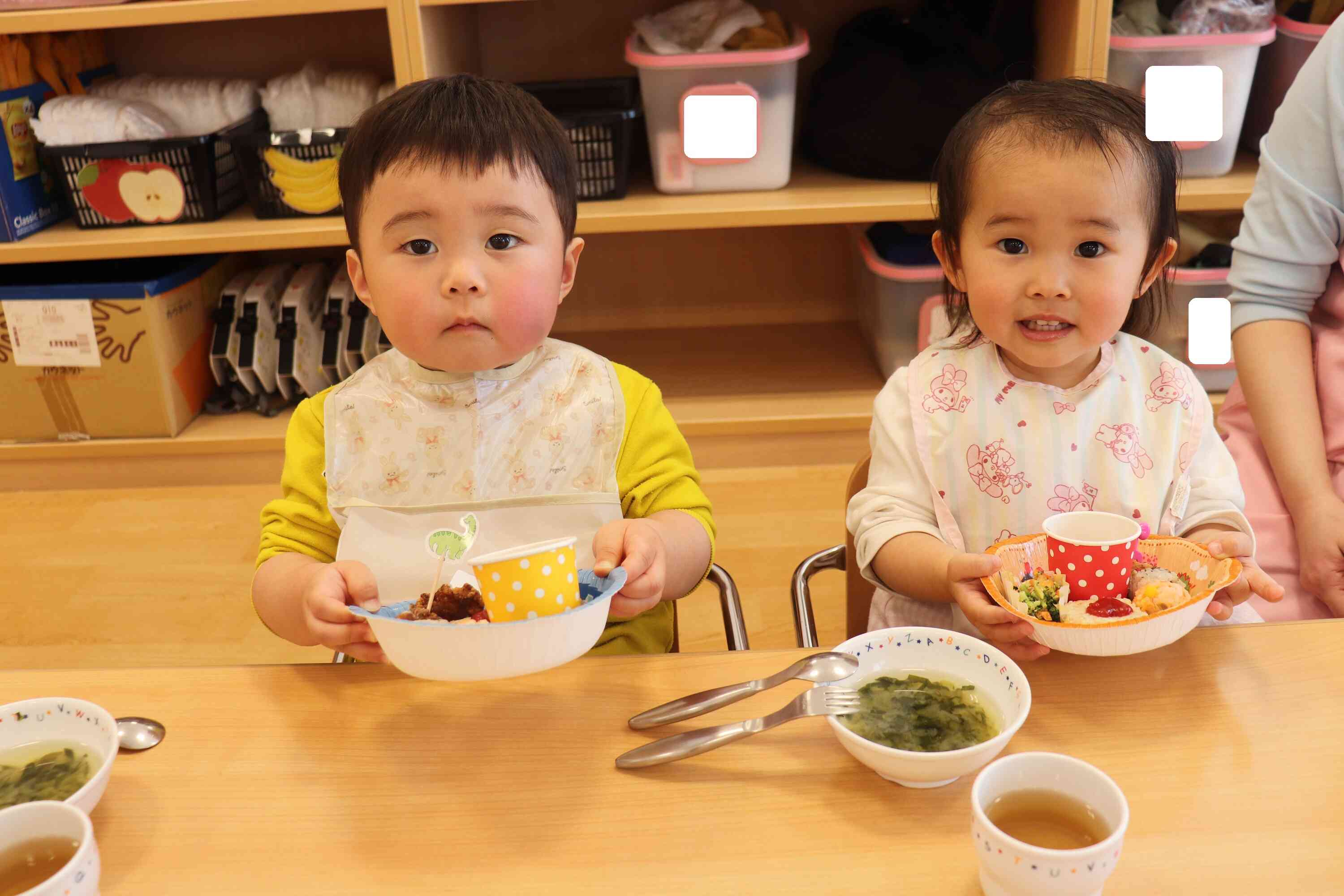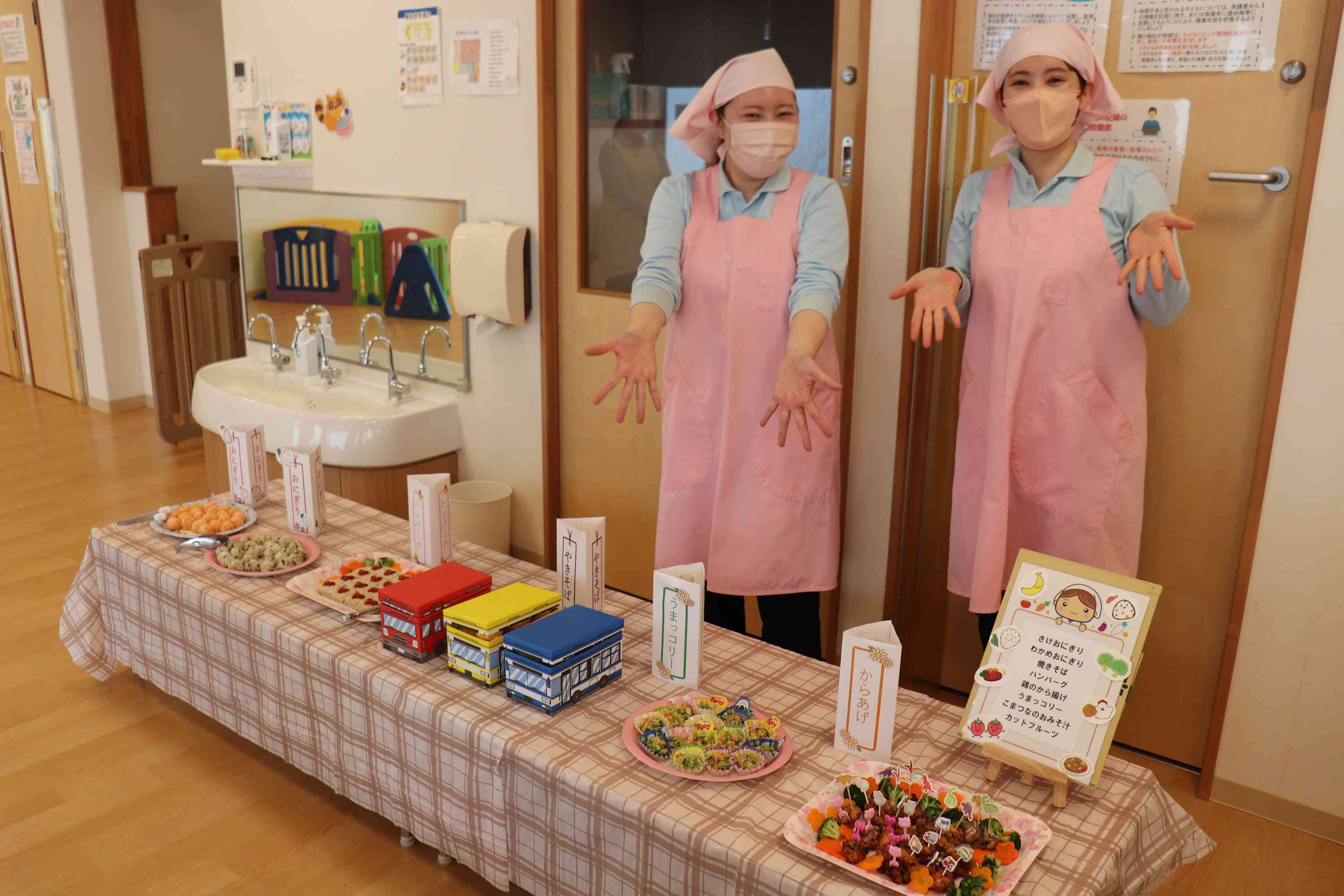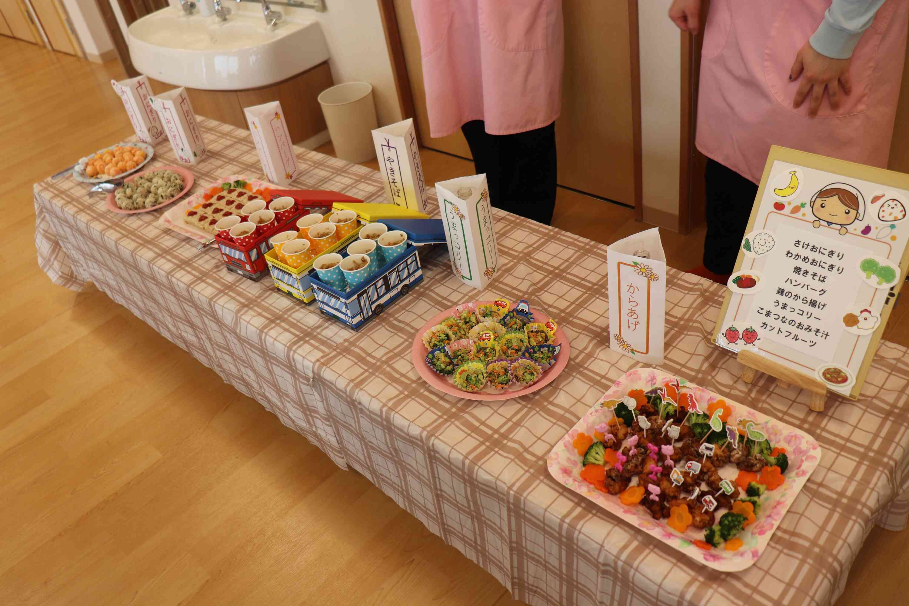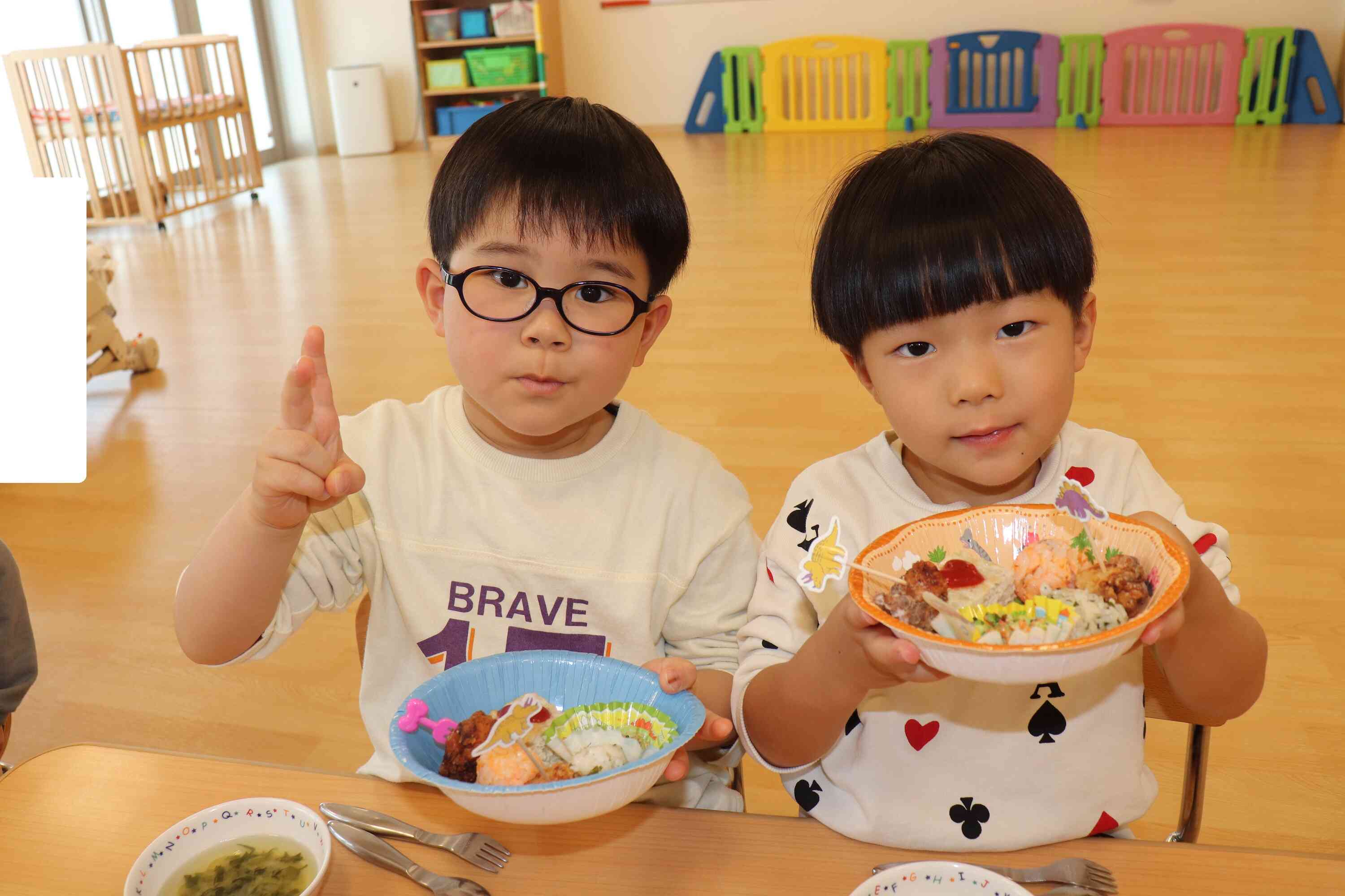 いよいよおかずやおにぎりなどが次々に運ばれてくると、「わあ!おいしそう!」「お肉にきょうりゅうがいる!」と歓声が上がり、目を輝かせながら喜ぶ姿が見られました。