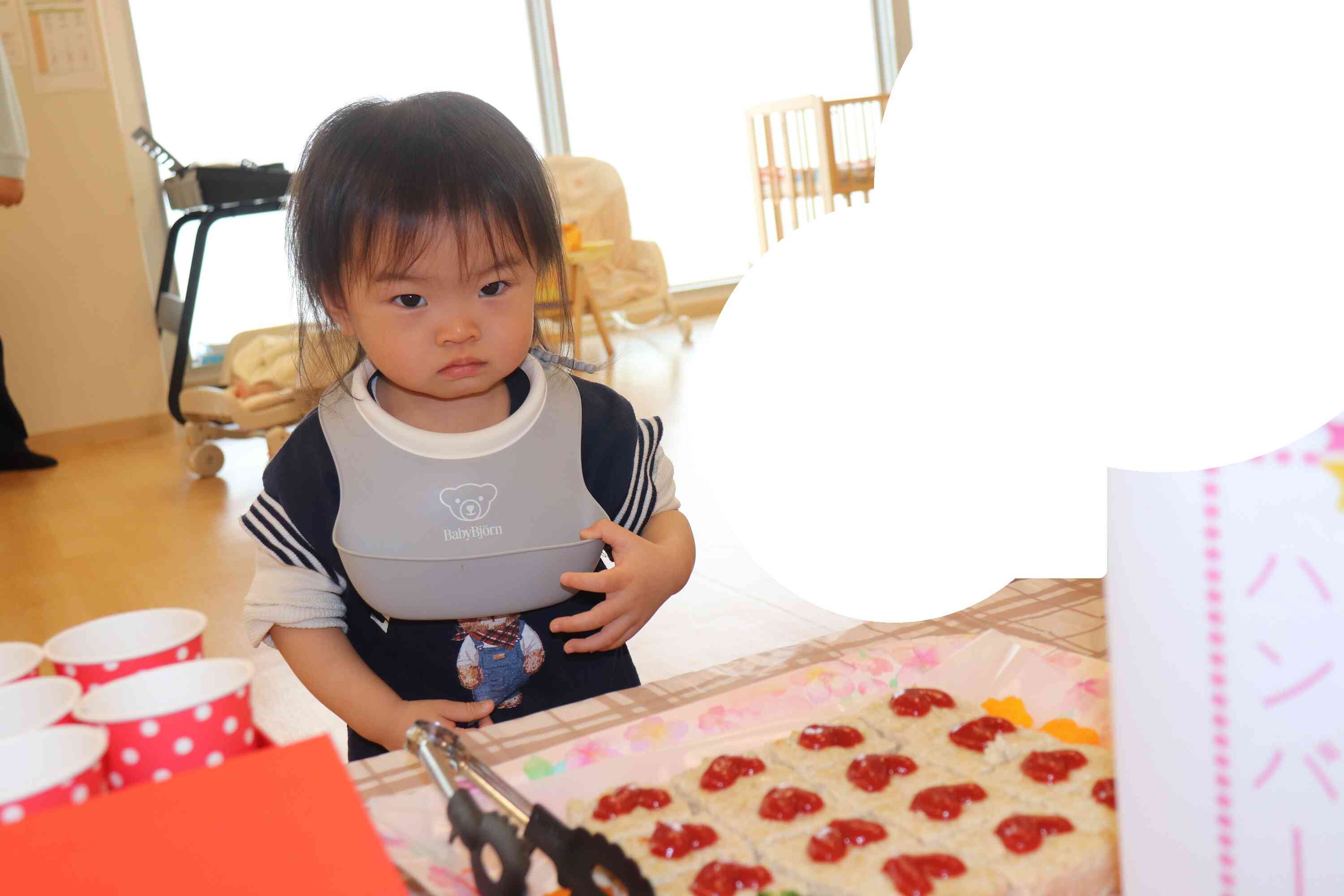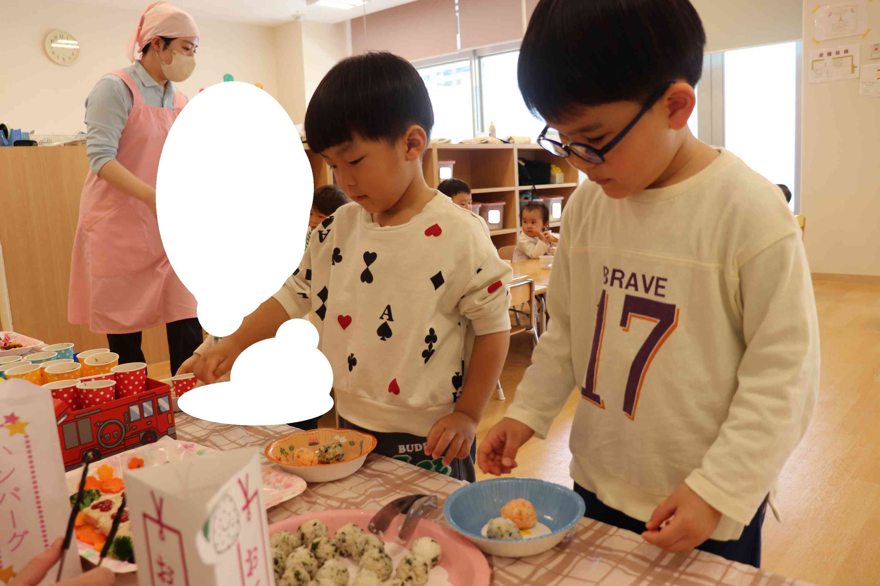 ビュッフェでは、一人ひとりが保育者と一緒に並び、すきなおかずやおにぎりを選んでお皿に取っていきました。「これにする!」「こっちもいいな」と楽しそうに選ぶ様子からは、自分で選ぶ喜びや特別感をしっかりと感じていることが伝わってきました。
