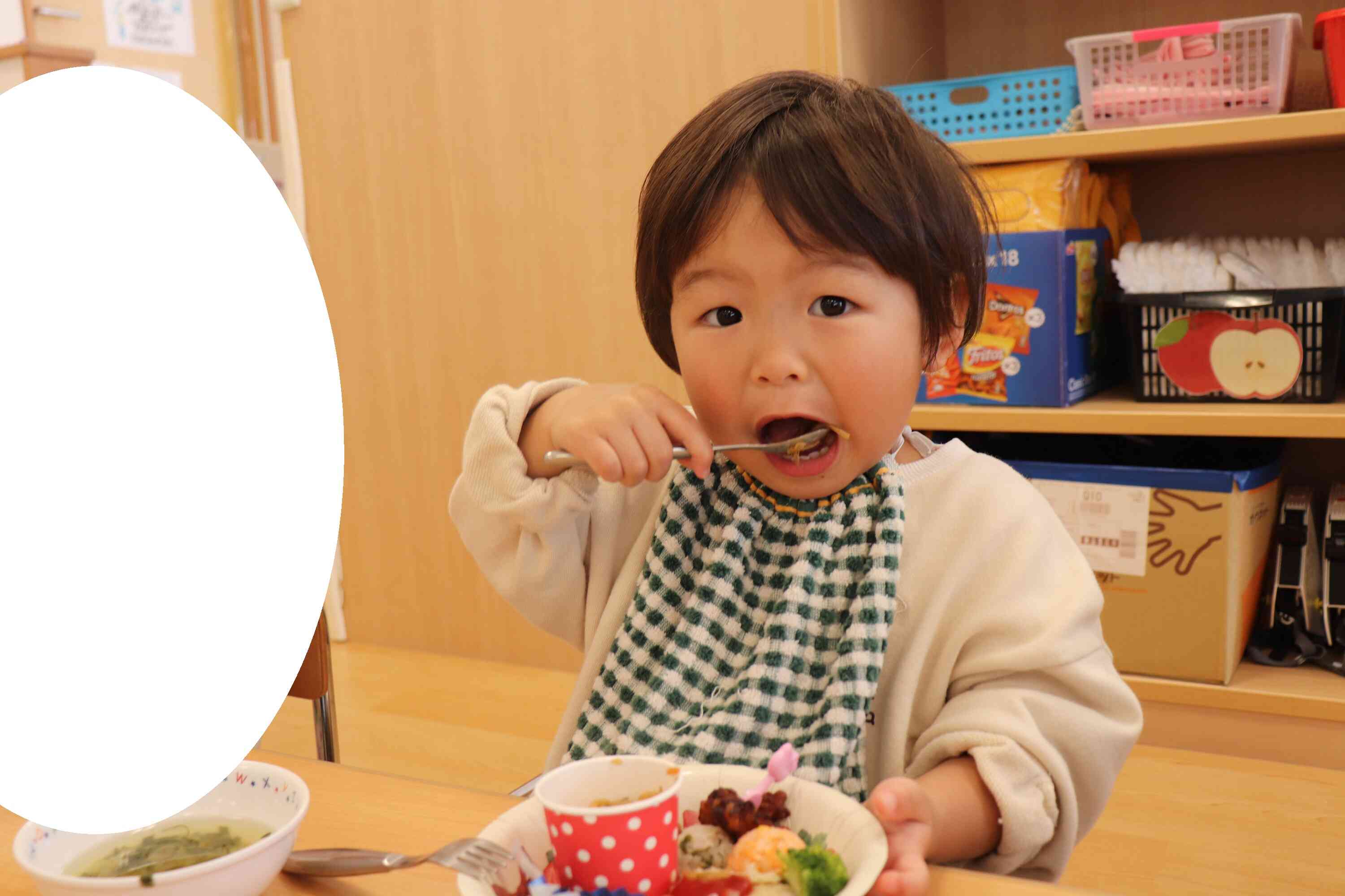 席に戻ると、友達と見せ合いながら嬉しそうに食べ始め、「おいしいね!」と笑顔いっぱいでいつも以上に会話も弾んでいました。普段よりも食が進み、あっという間に完食する子が多く、おかわりを楽しむ姿も見られました。