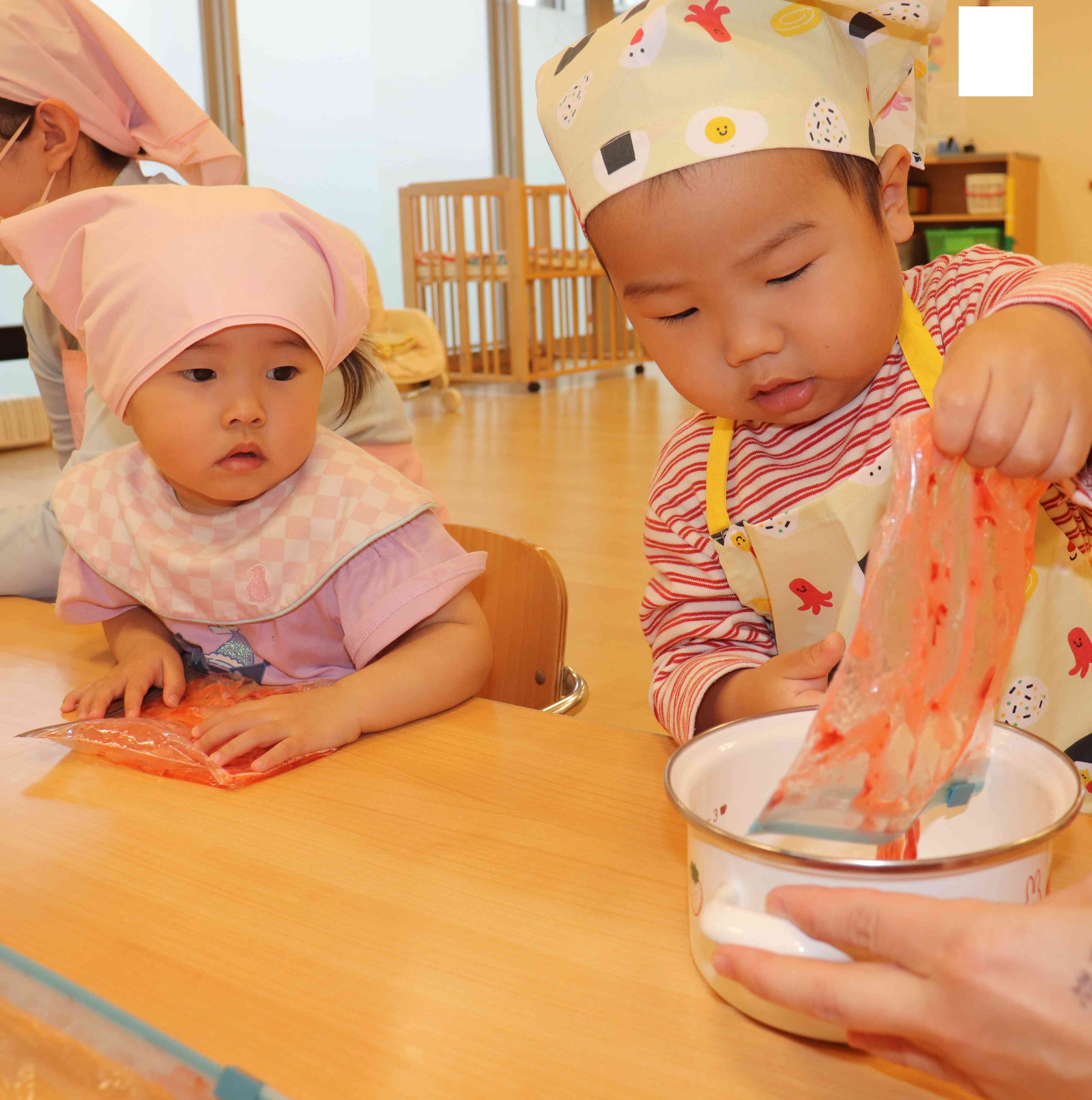 いちごを一粒ずつつぶす子どもや手のひらで豪快につぶすなど個性豊かな子ども達でした♪