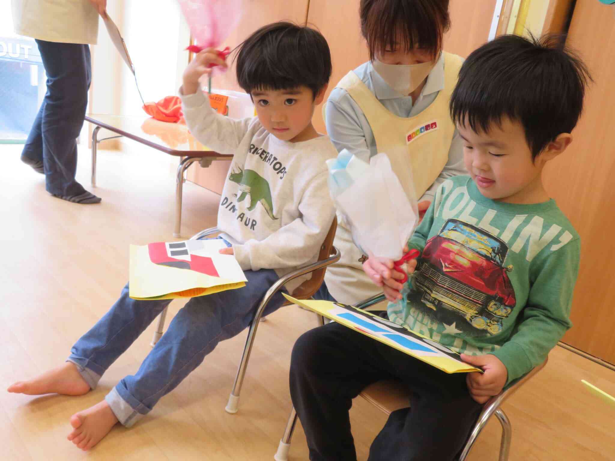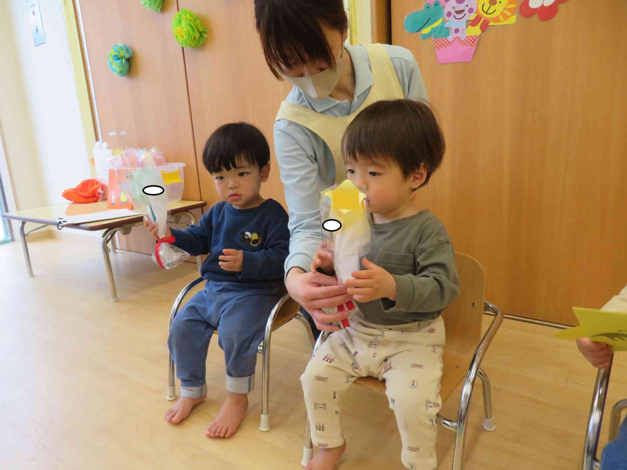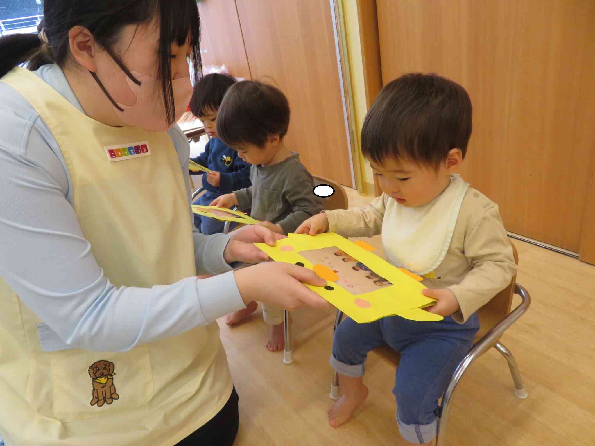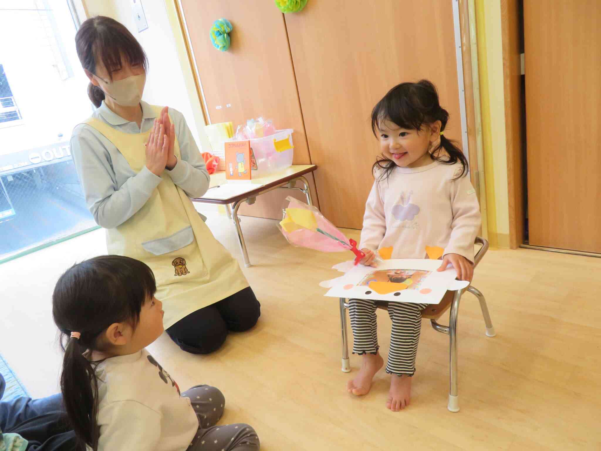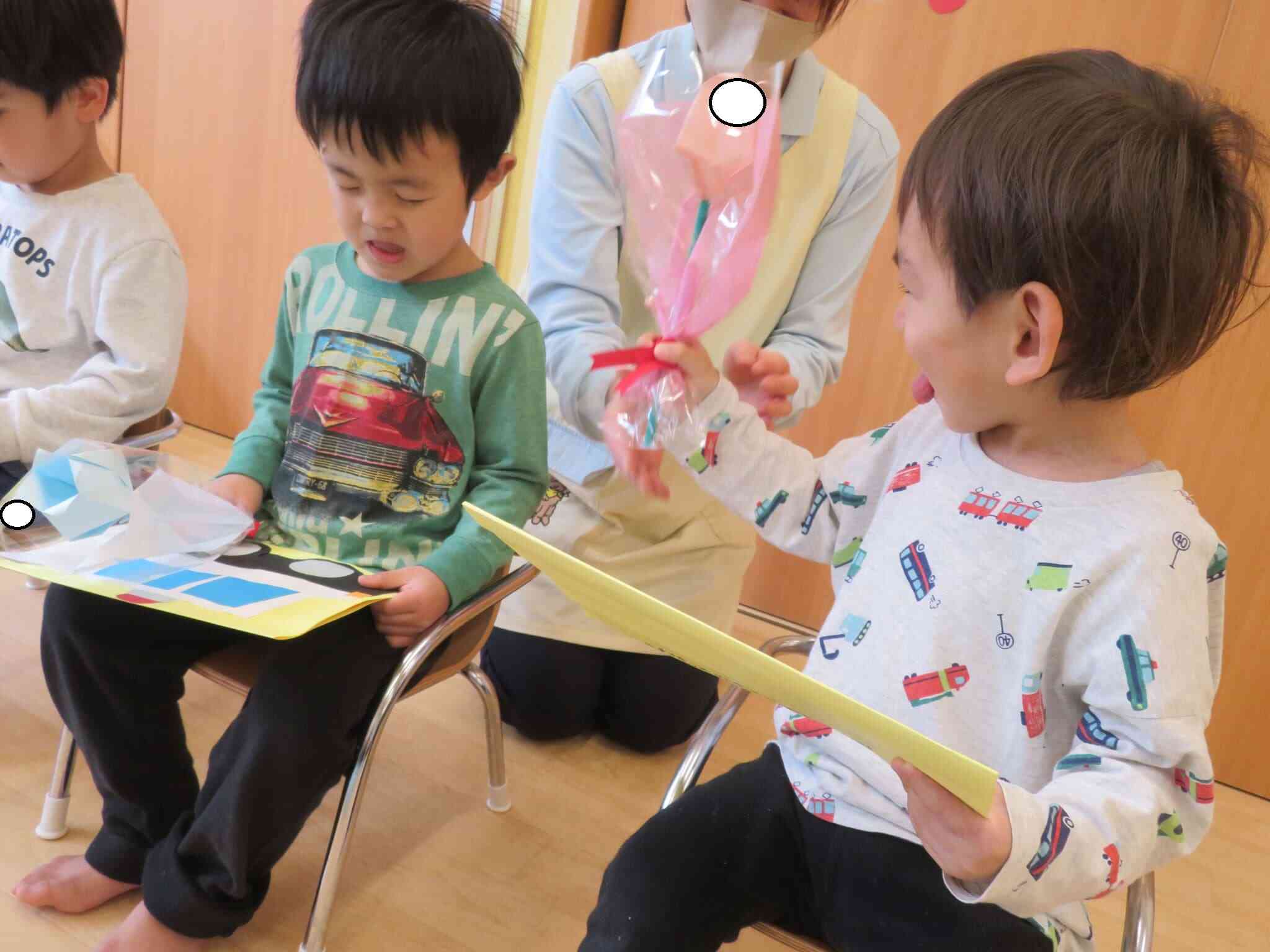 続いてあひる組のみんなです。先生たちからメッセージカードとお花のプレゼントです。