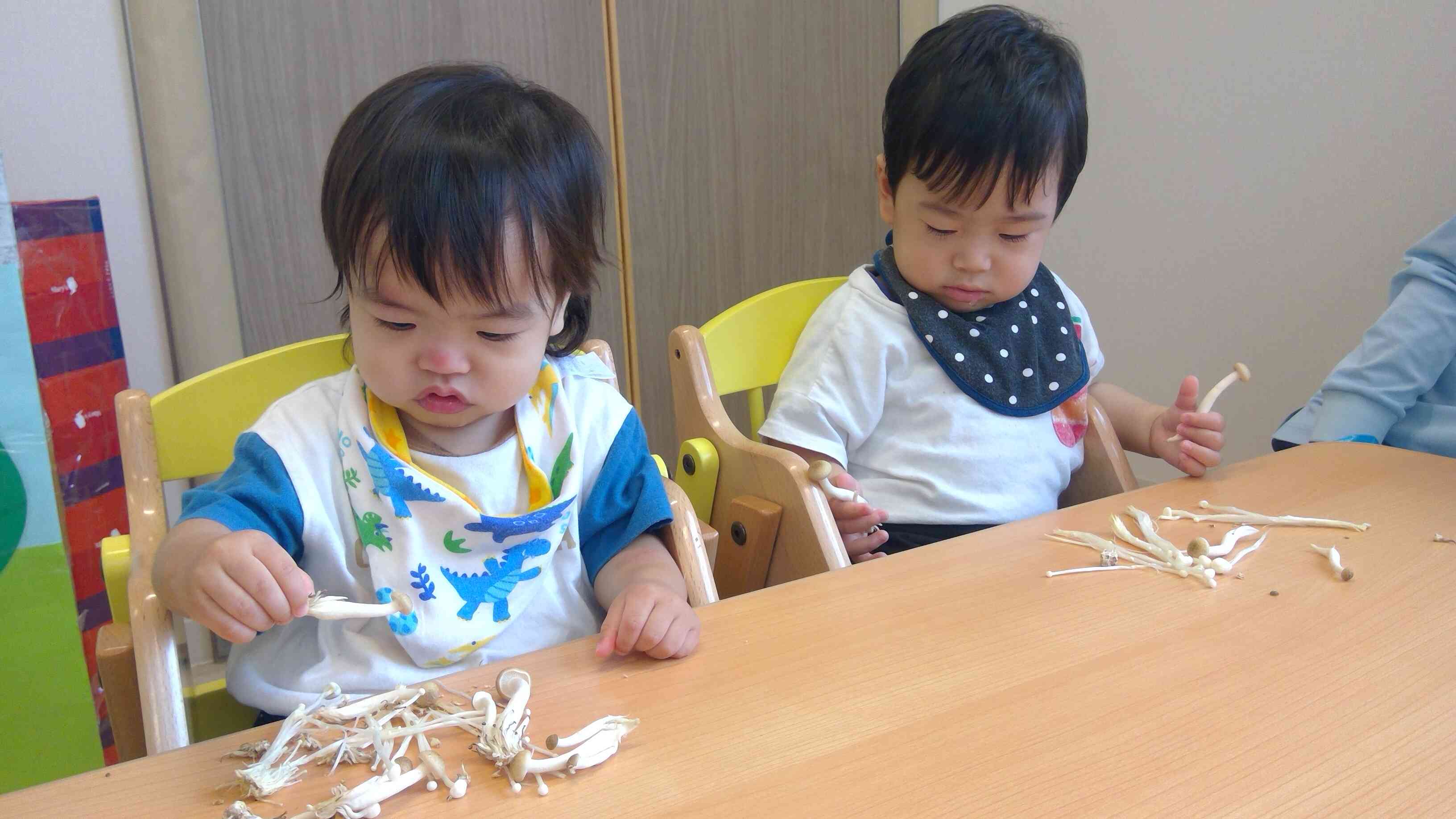 1歳クラスは、きのこの頭を取ったり細かくさいたりして皆楽しそうでした!