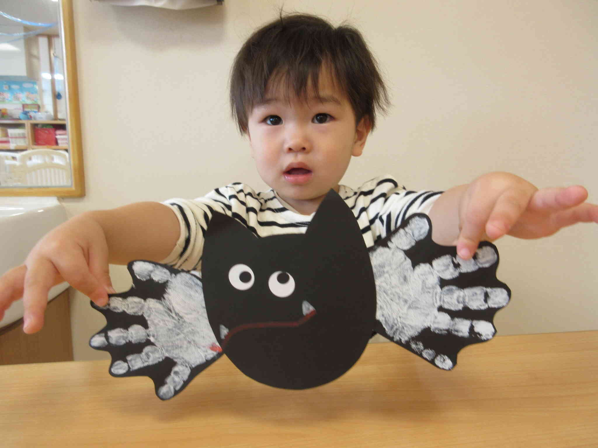 こちらはハロウィンの製作物の一つ。かわいらしいおててが翼になっているコウモリさんは、作るお友達によって表情もそれぞれ。個性が出ていて楽しいですね。