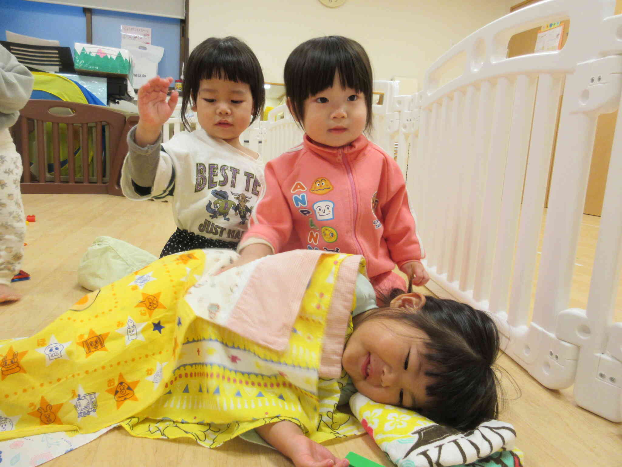 1・2歳児クラスでは、寝込んでいるお友達を看病中(実際は元気です!)。