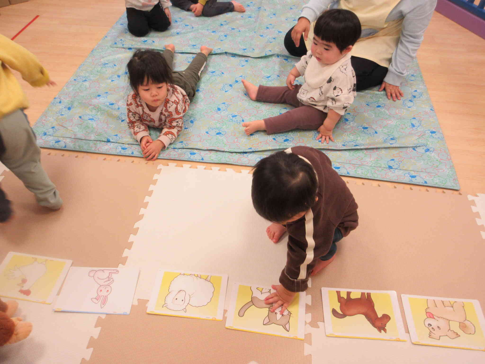 動物カードを見せられると、指さして応える0歳児クラスのお友達。