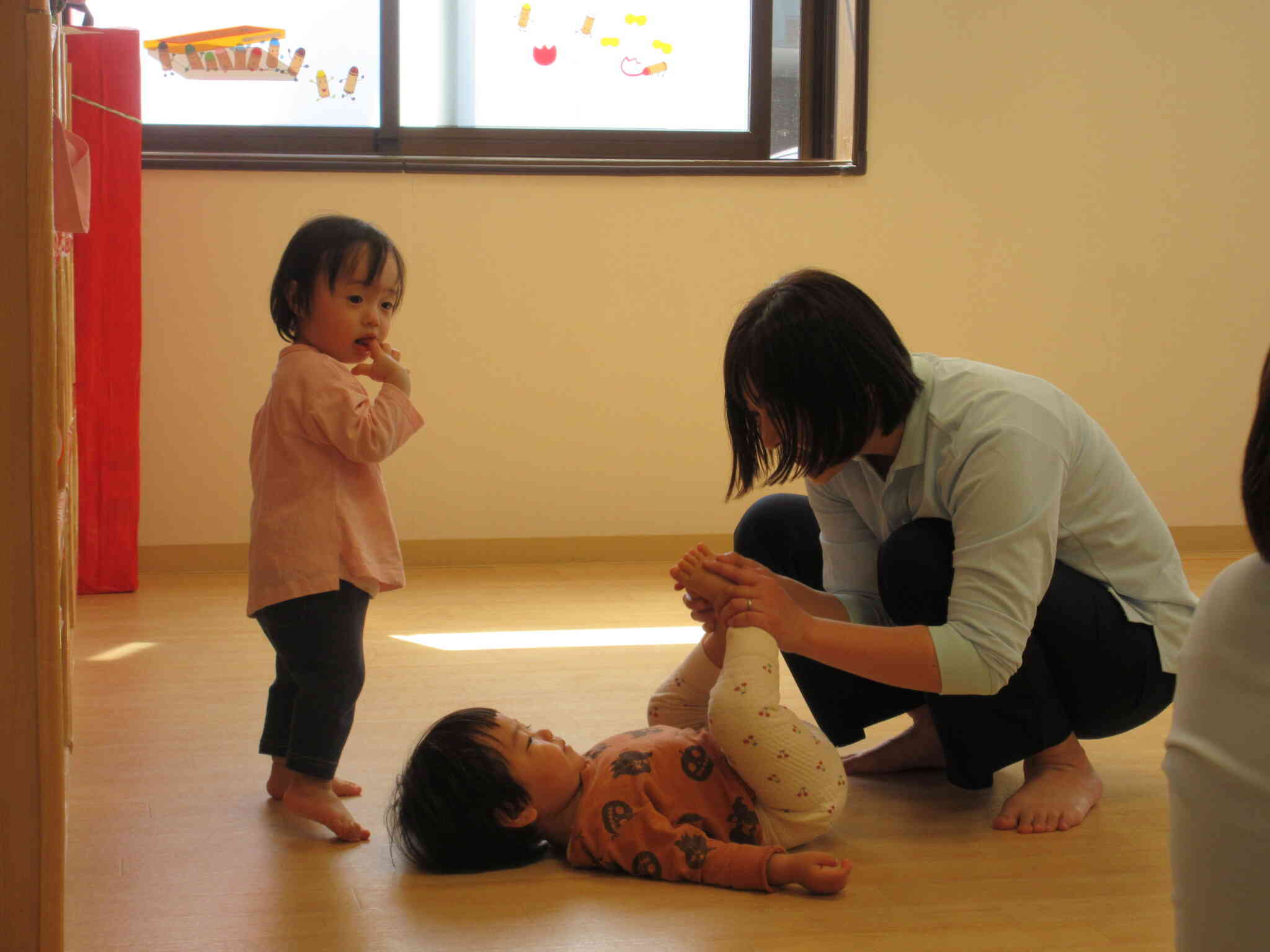 1歳児クラスのあひる組さんたちは、先生たちと歩く練習。