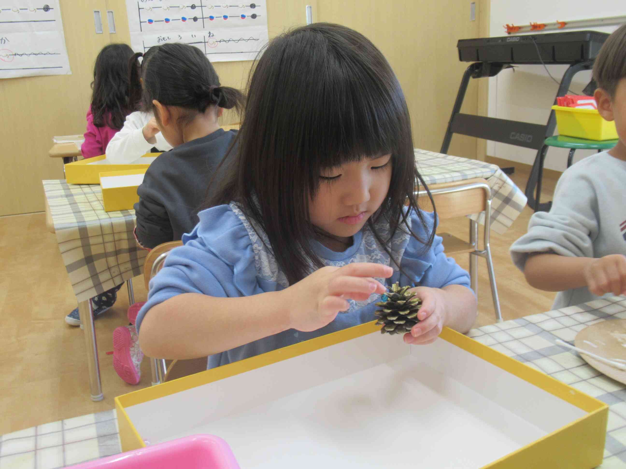 steamでは、松ぼっくりのリース飾りを作りました。天気の良い日に飾りになりそうなきれいな松ぼっくりを公園に探しに行き、製作スタート!