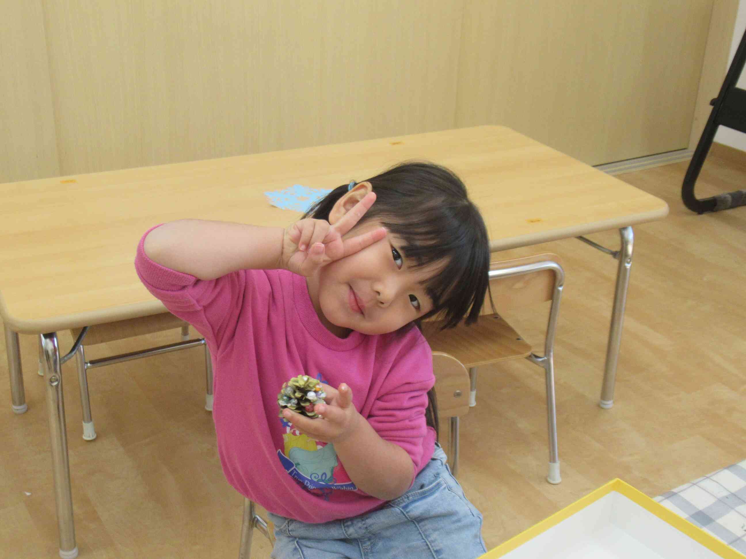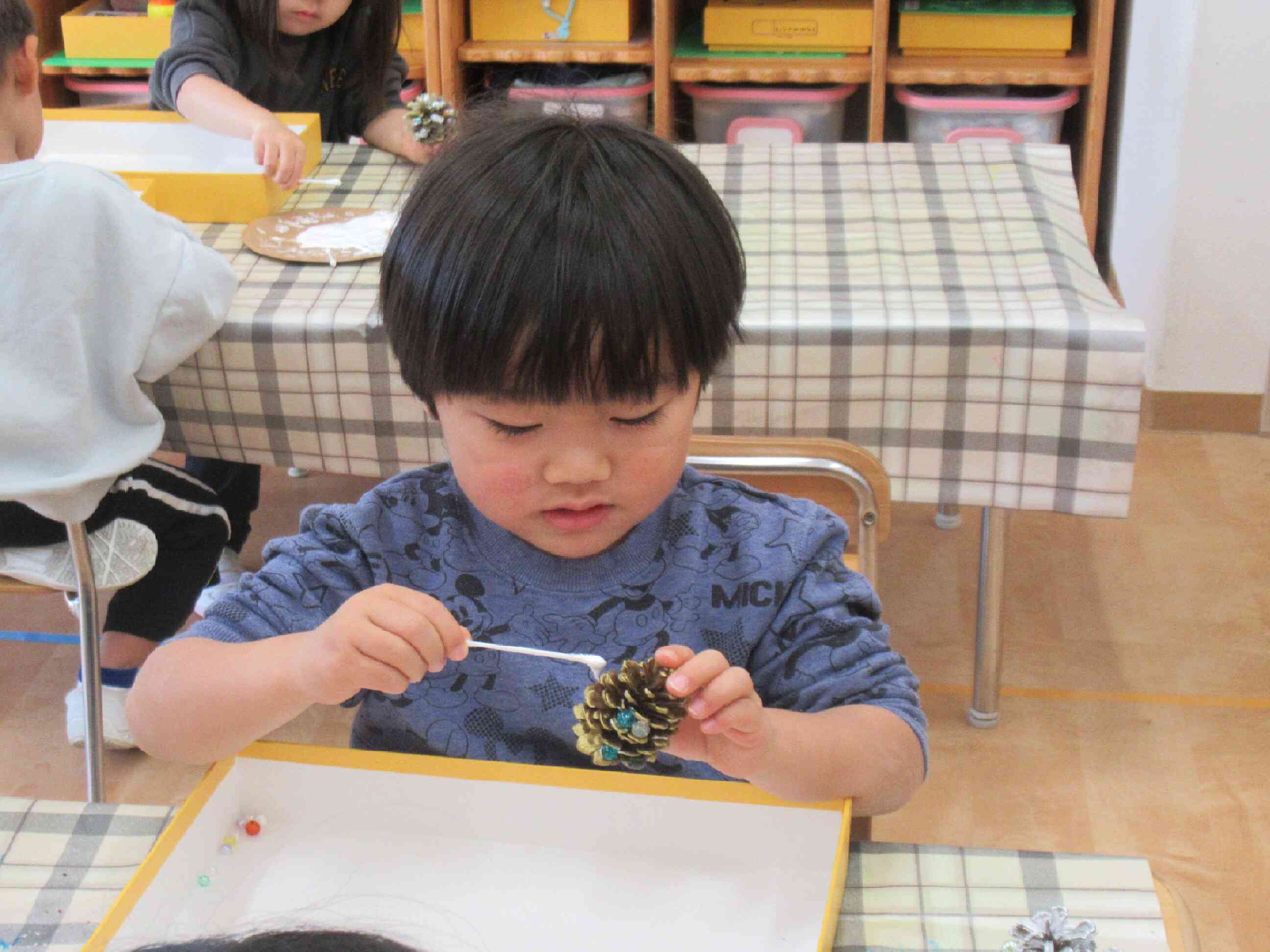 好きな形の松ぼっくり、好きな色のビーズを選び、ボンドでくっつけました。出来上がった作品を見て