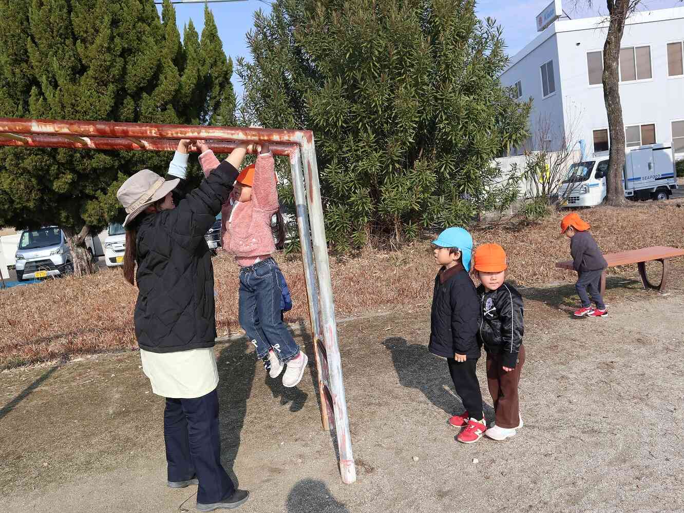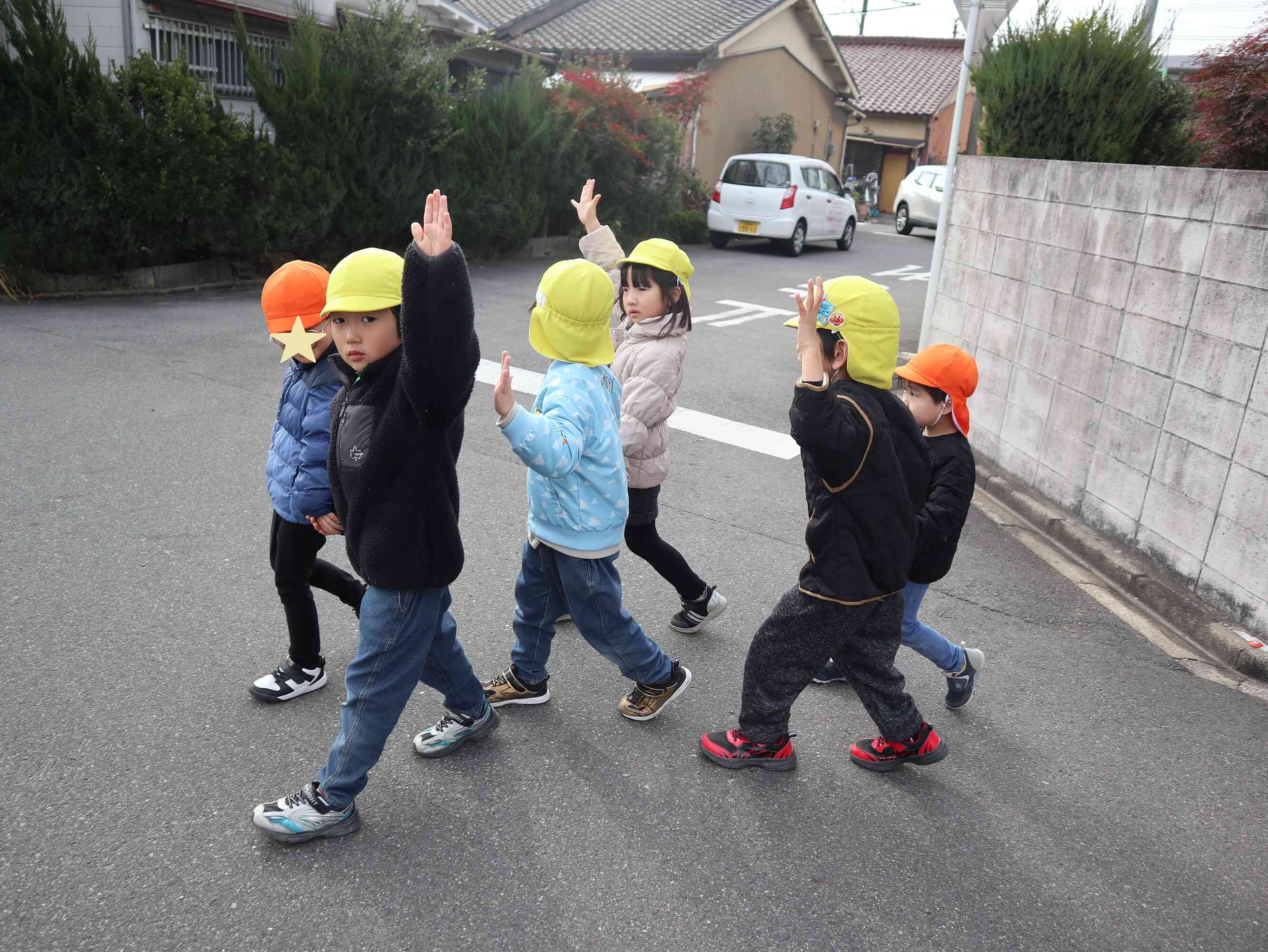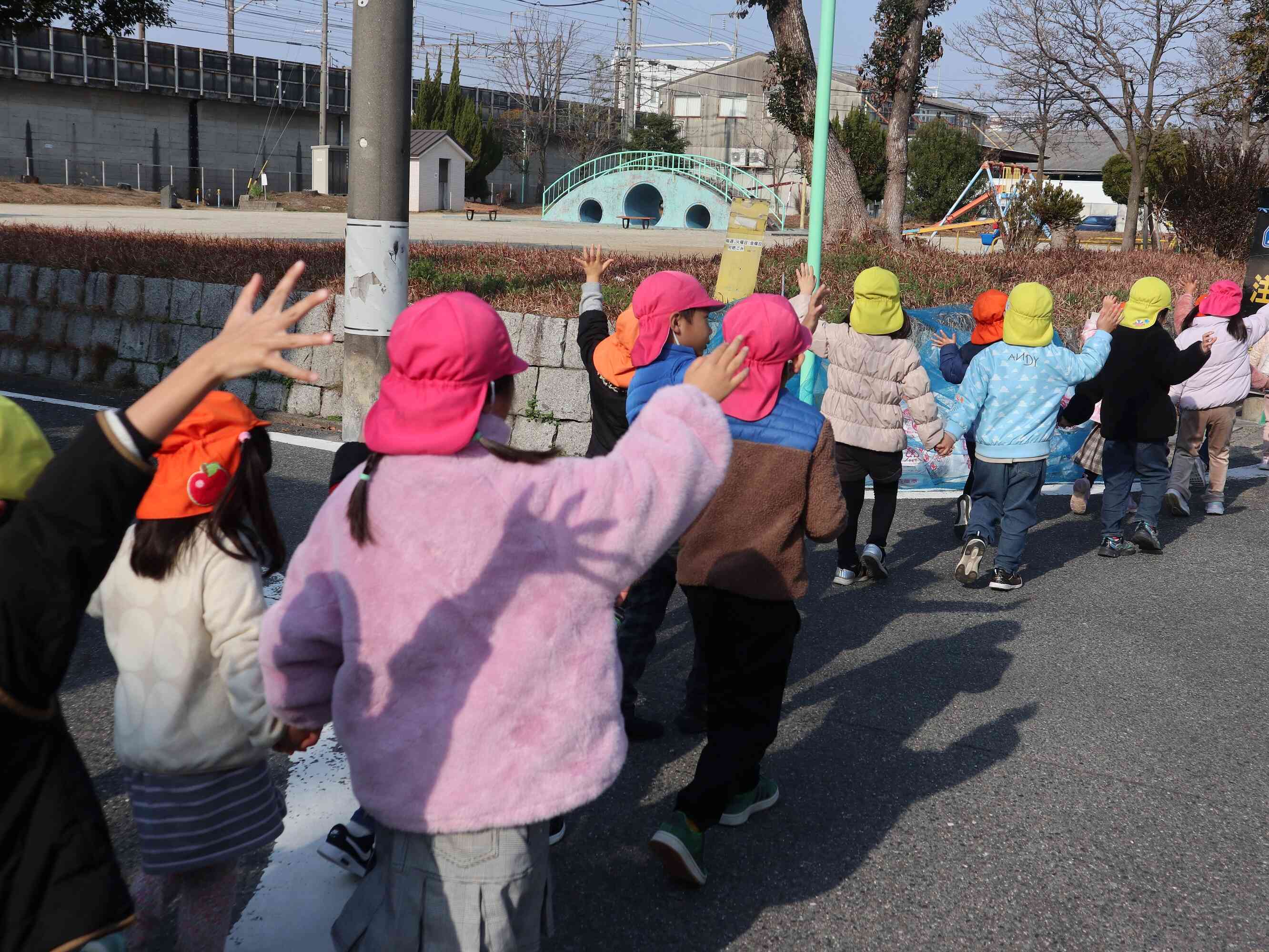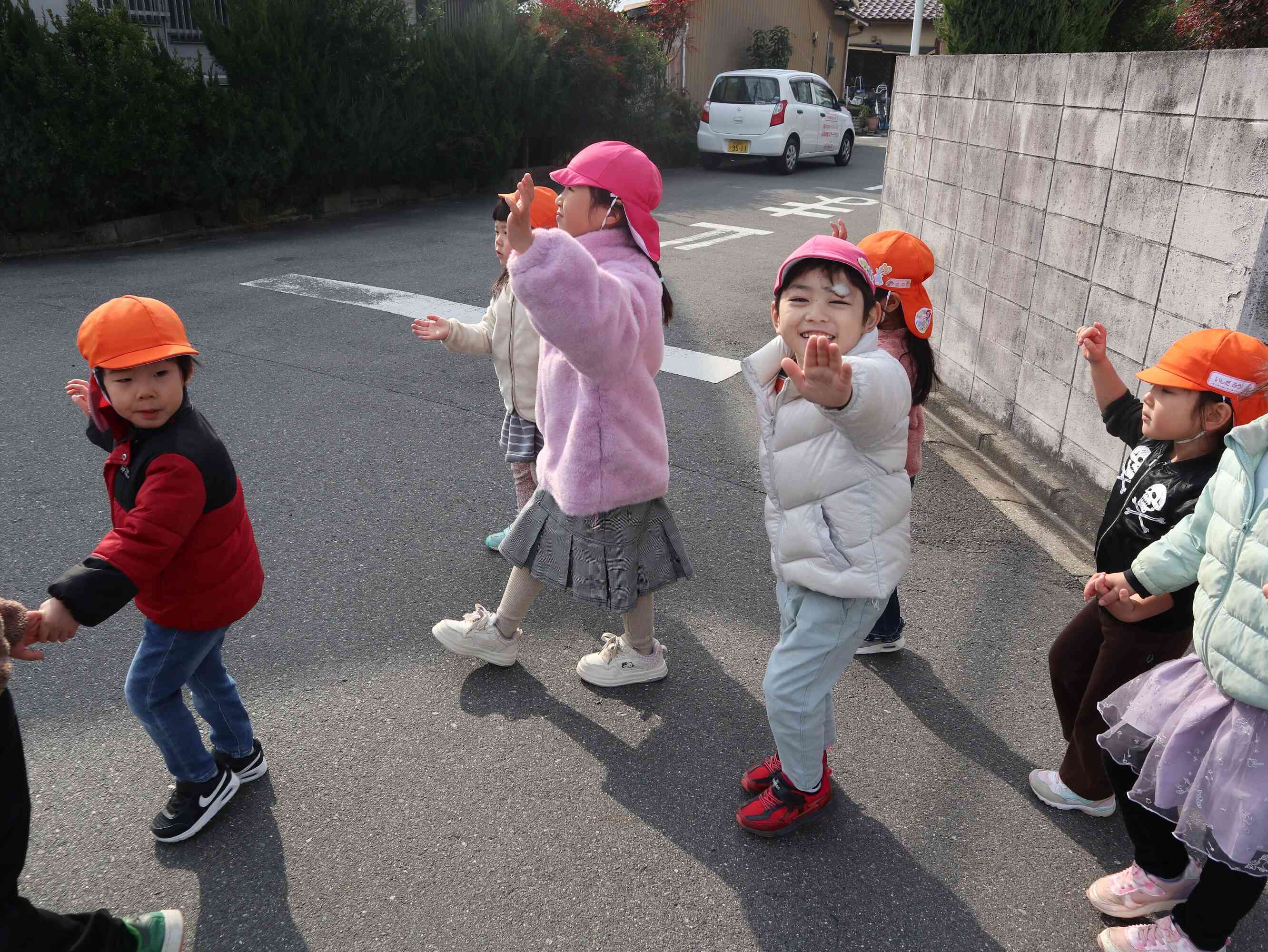 幼児組3クラスで、近くの神社へ初詣に出かけました。鳥居の前に並び、順番にくぐります。「失礼します」と念じながら、一礼をしてくぐりました。
