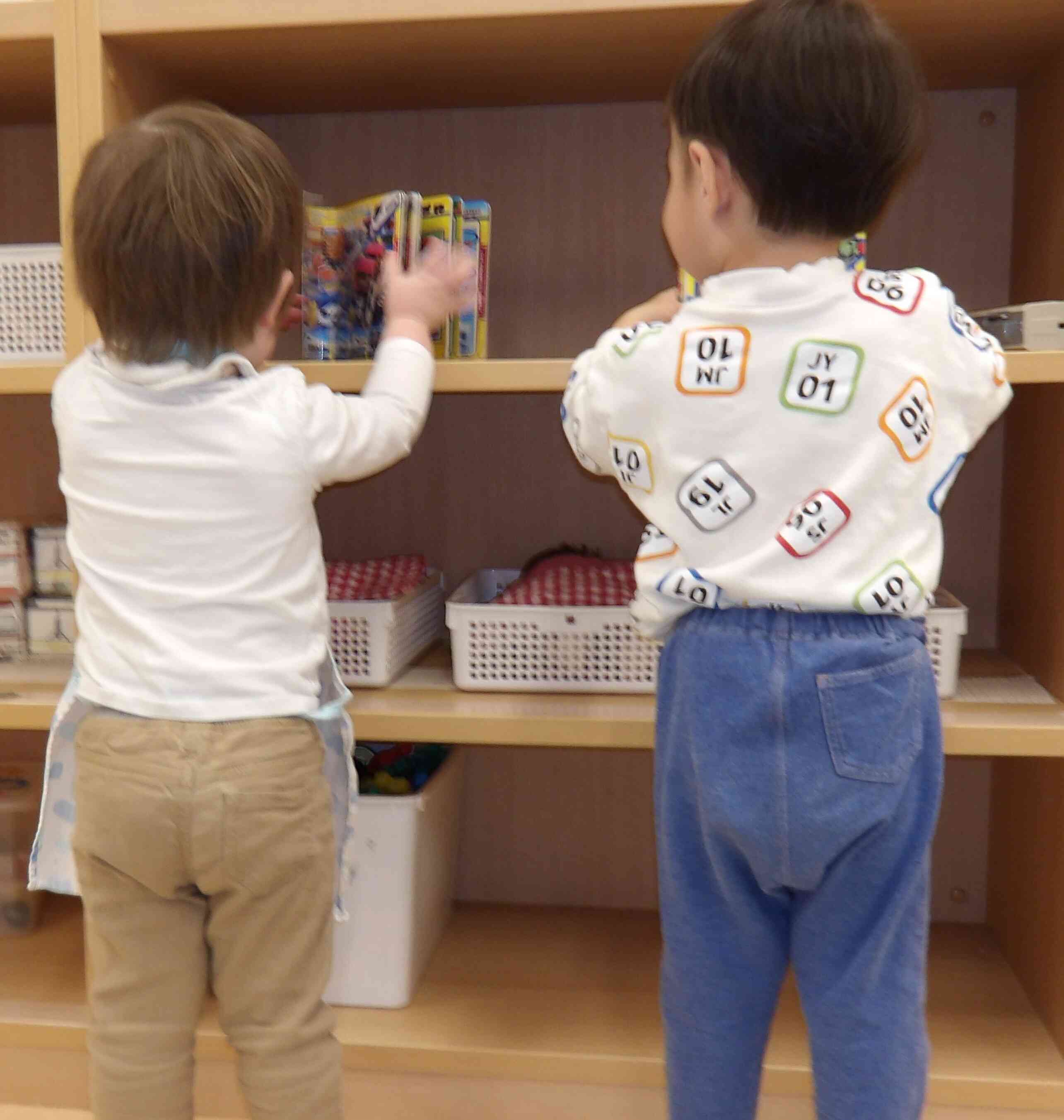 仲良く二人で棚に向かって何かをやっていたので、何をやっているのかな?と覗いてみると・・・!