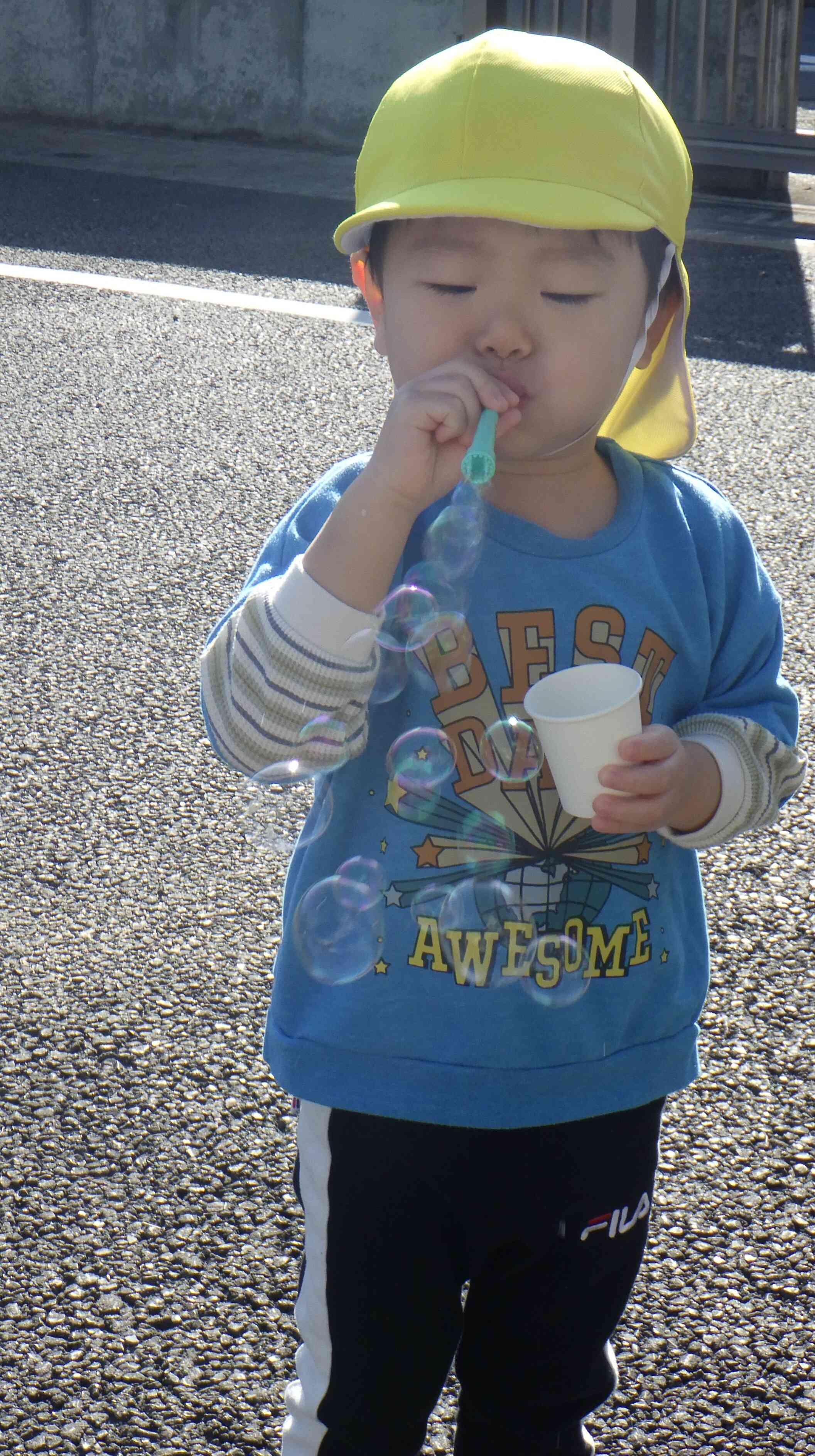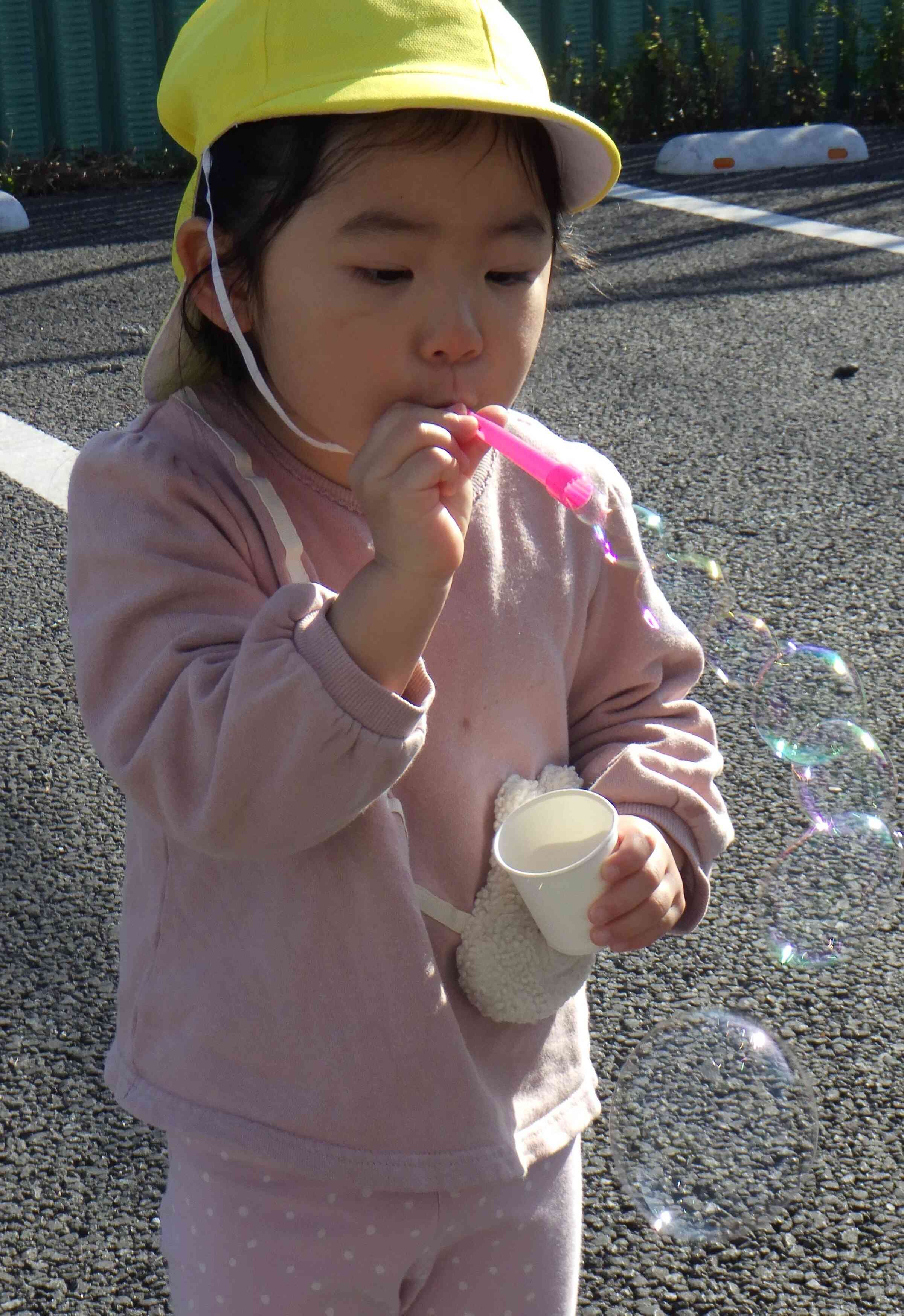シャボン玉を膨らませるのが上手になり、楽しんでシャボン玉を飛ばしています♪息の入れ具合が難しくすぐにパチンと割れてしまいう時もありますが、何度も何度もチャレンジすることで上手になりました!