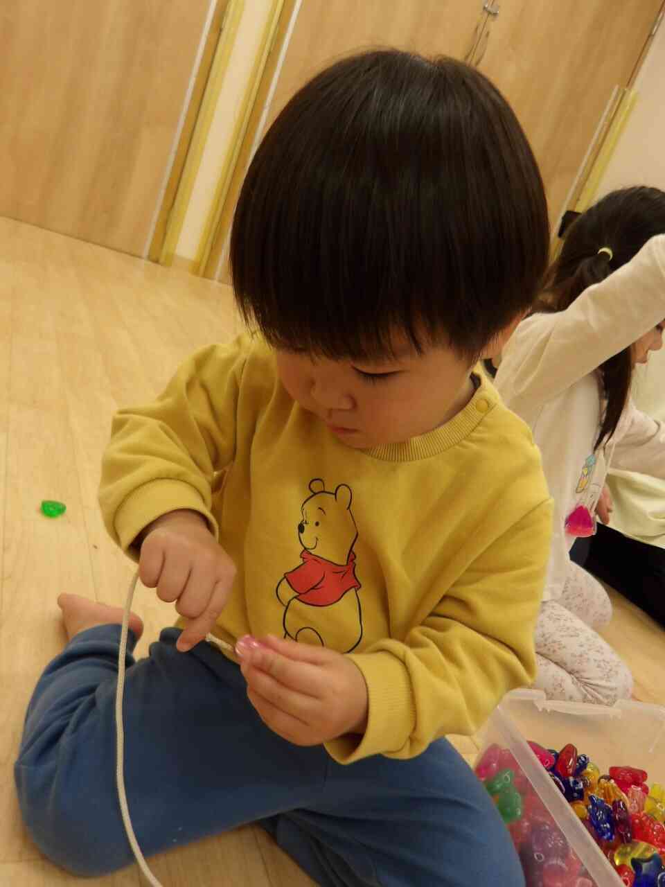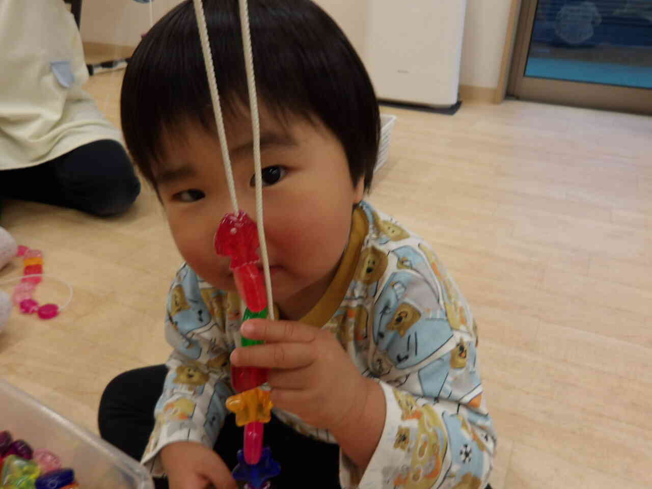 ひも通しに夢中な1歳児さん☆小さな穴にひもを入れるので集中しながら頑張っています!「せんせい、できないよ~」と苦戦している子もいますが、少しお手伝いをすると上手にできて「できたね!」ととっても嬉しそうでした♬手先を使った遊びも楽しんでいますよ!