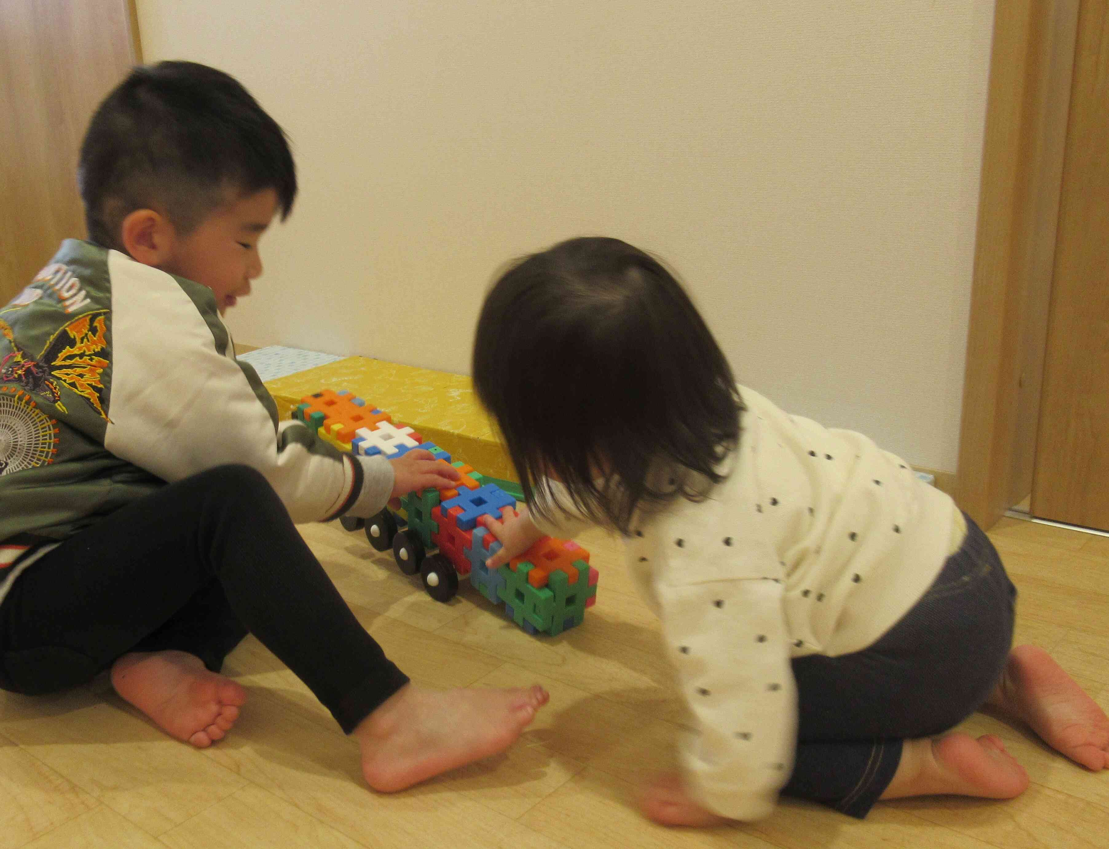 お兄さんの作った大きな車が気になってみていると「いっしょにやる?」と優しい一言♬一緒に仲良く車を走らせて楽しんでいました!