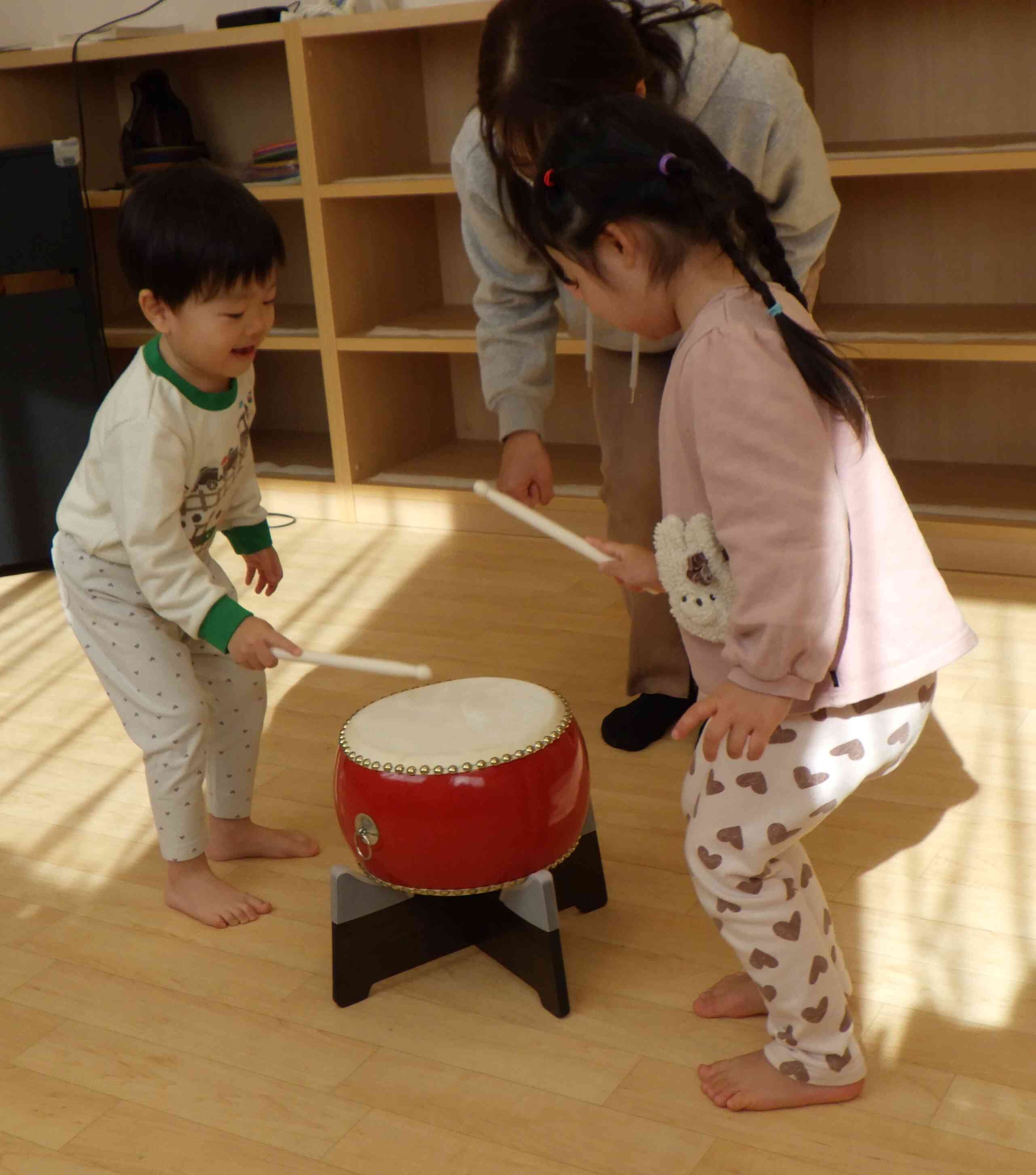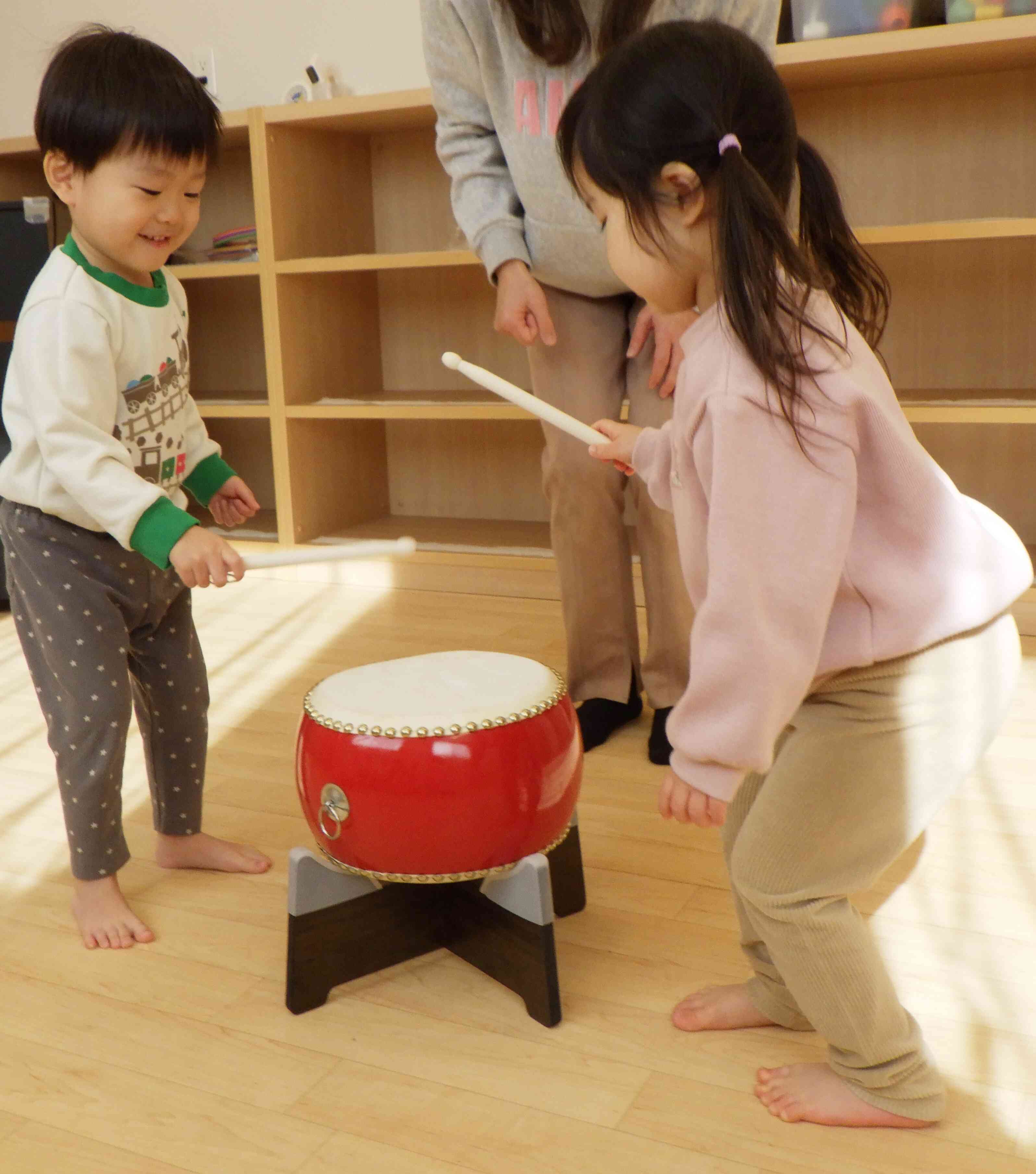 二人組でトントンと交互に太鼓を叩く練習をしています♪なかなかリズムに合わせて叩くのは難しい様子でしたが、二人でニコニコ楽しく叩いていました!
