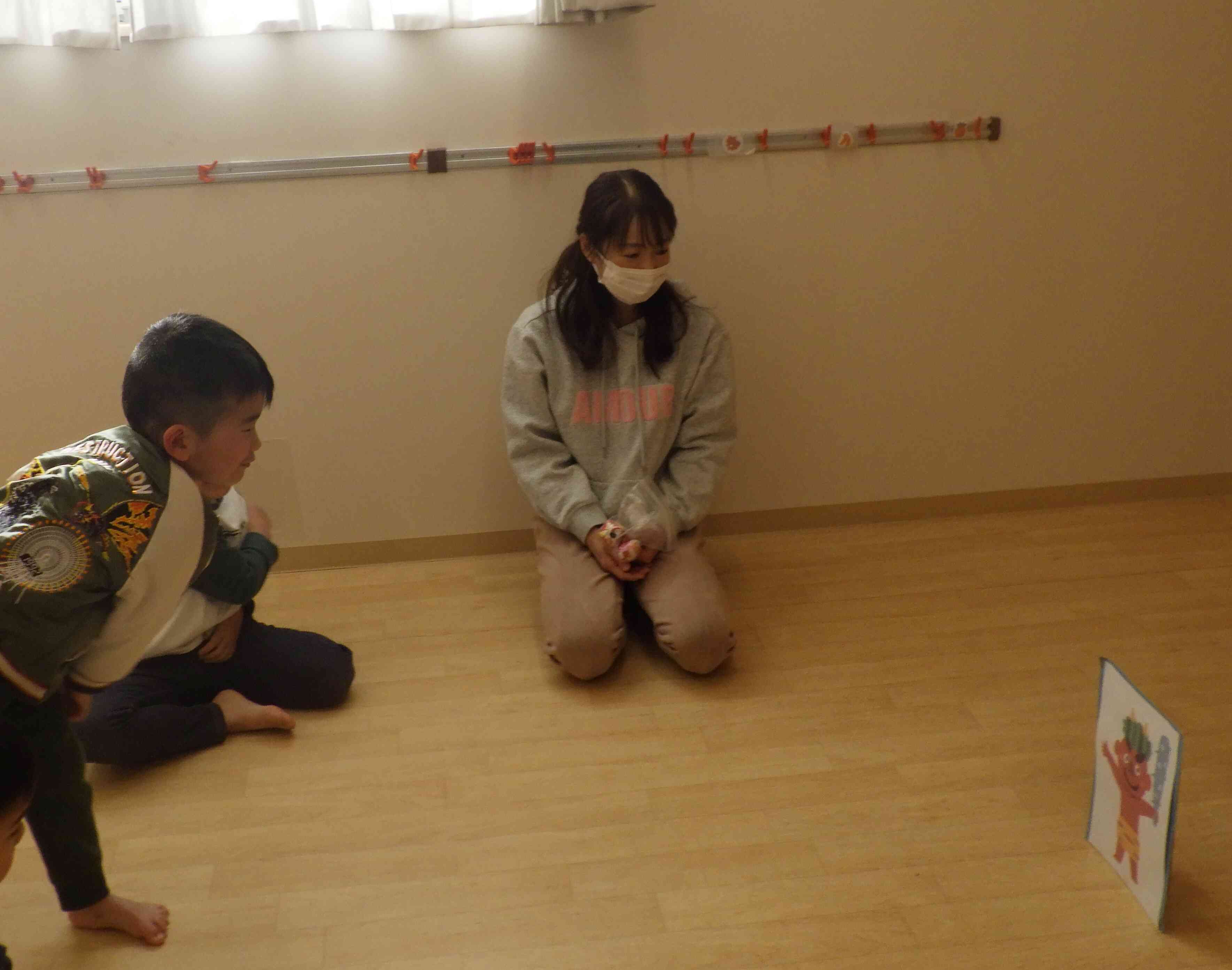 節分ということで先生が作ってくれた鬼に向かってお手玉ボールを投げて鬼退治もしましたよ☆「鬼は外~福は内~♬」とみんなで歌を歌いながら楽しめました!