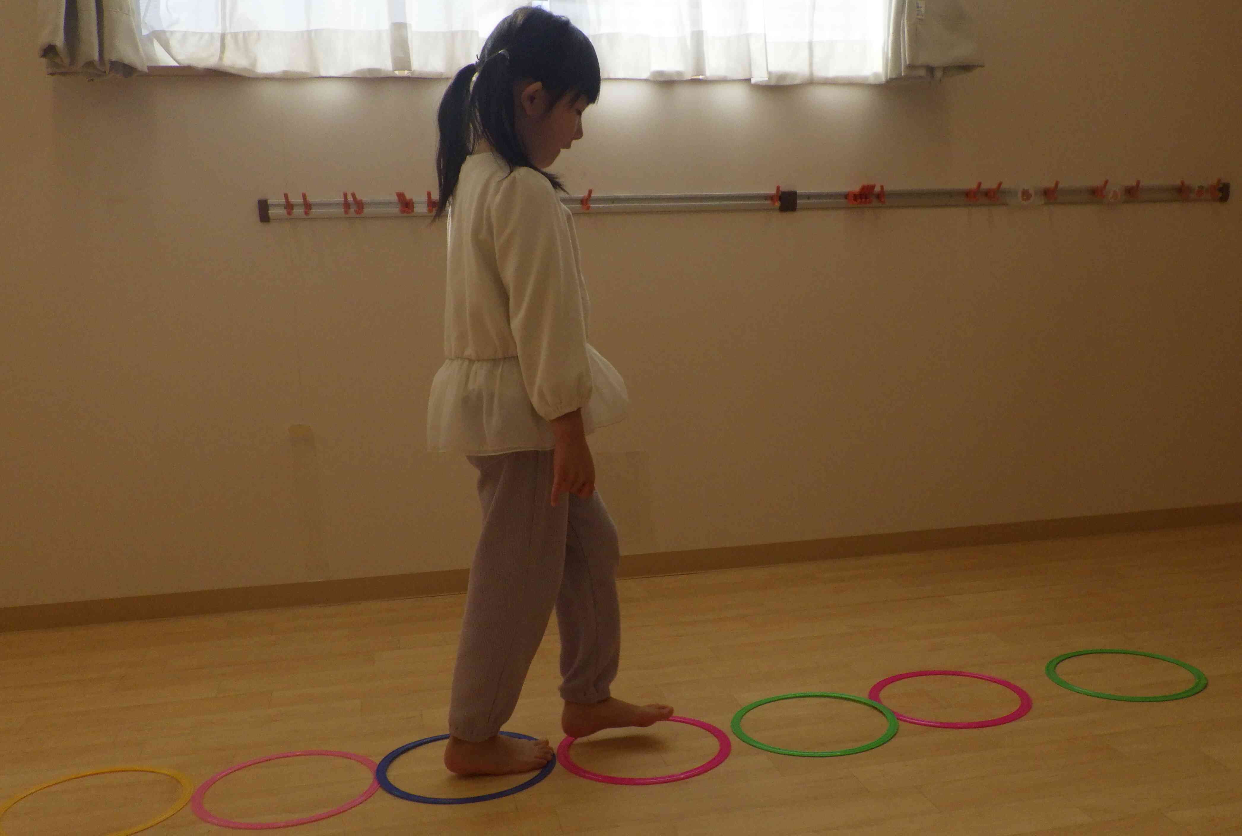 丸の輪っかを並べてピアノのリズムに合わせて「ドレミファソラシド♬」と輪っかを進んでいきます!ピアノの音を聞きながら輪っかを一個一個進むのが難しいようで苦戦している子もいましたが、「できるよ!」と自信満々な子もいました!幼児組さんになるといろいろなことができるようになりますね☆