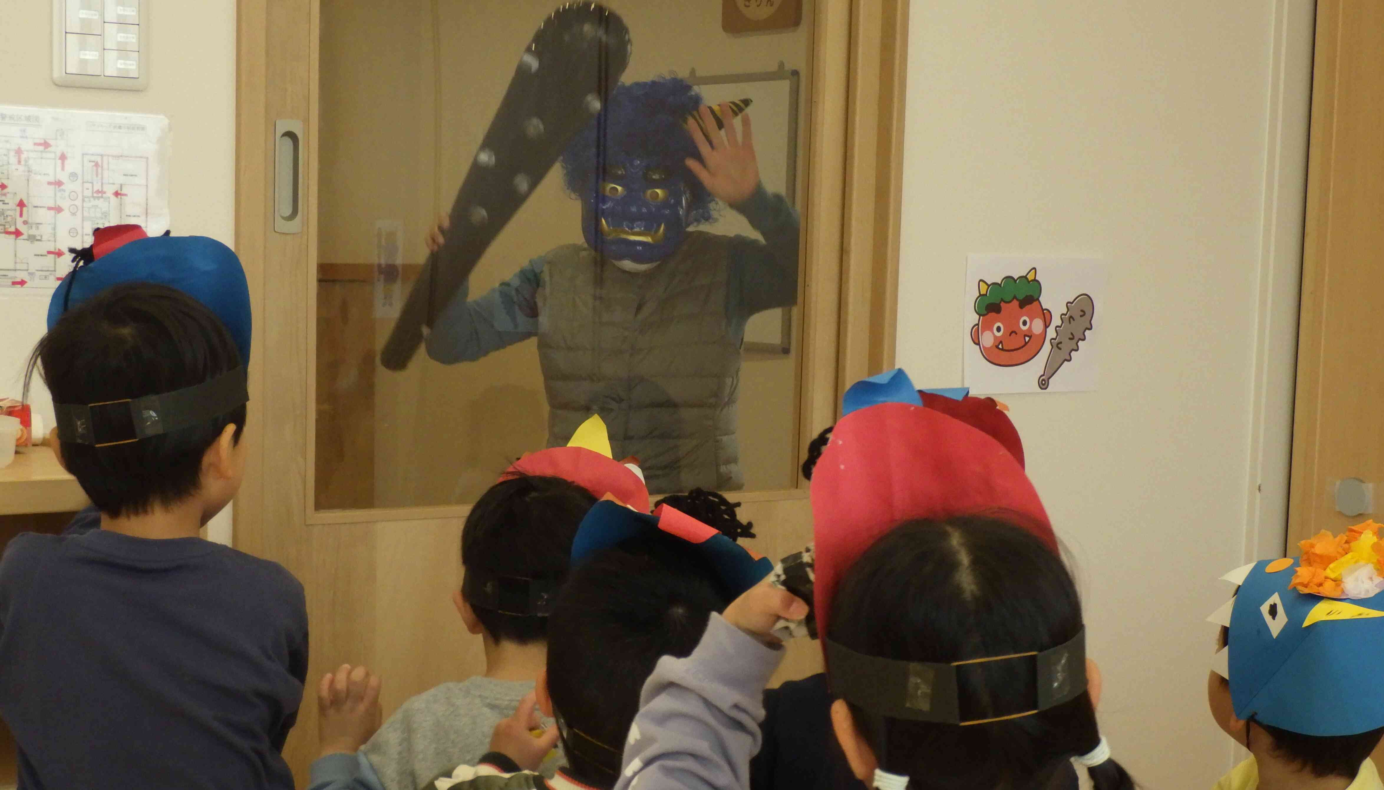 2歳児と幼児組にも鬼がやってきました!鬼がドアのところから顔を出すと「鬼だ!」と言いながら新聞紙で作ったボールを一生懸命ぶつける子もいれば、怖くて泣いてしまう子もいました!乳児クラスでは可愛いらしい鬼さんでしたが、2歳児・幼児クラスすには金棒を持った鬼がやってきて迫力満点でしたよ☆