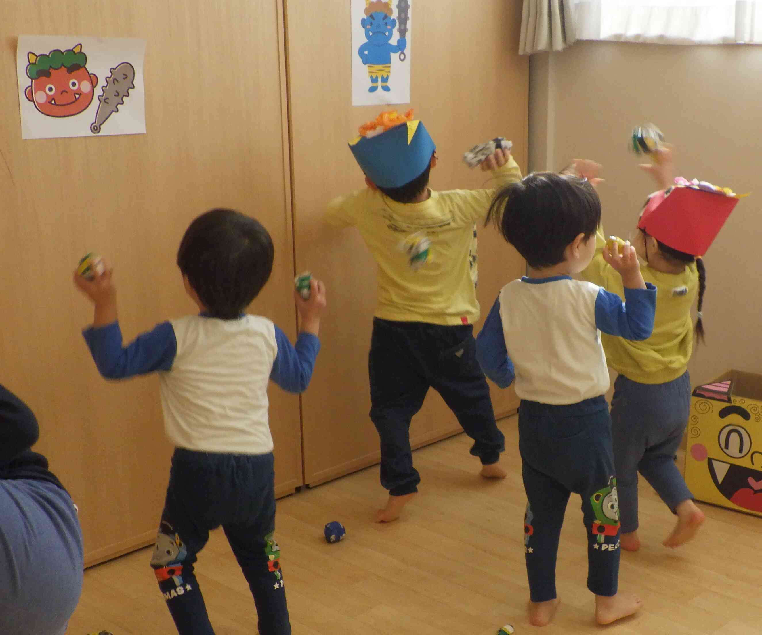 「鬼は外~福は内~!」と力強くボールを投げる姿がかっこよかったです!「どんな鬼さんを退治したの?」と聞くと「イライラ鬼!」「メソメソ鬼!」とみんなそれぞれ退治したかった鬼が自分の中にいたようです!