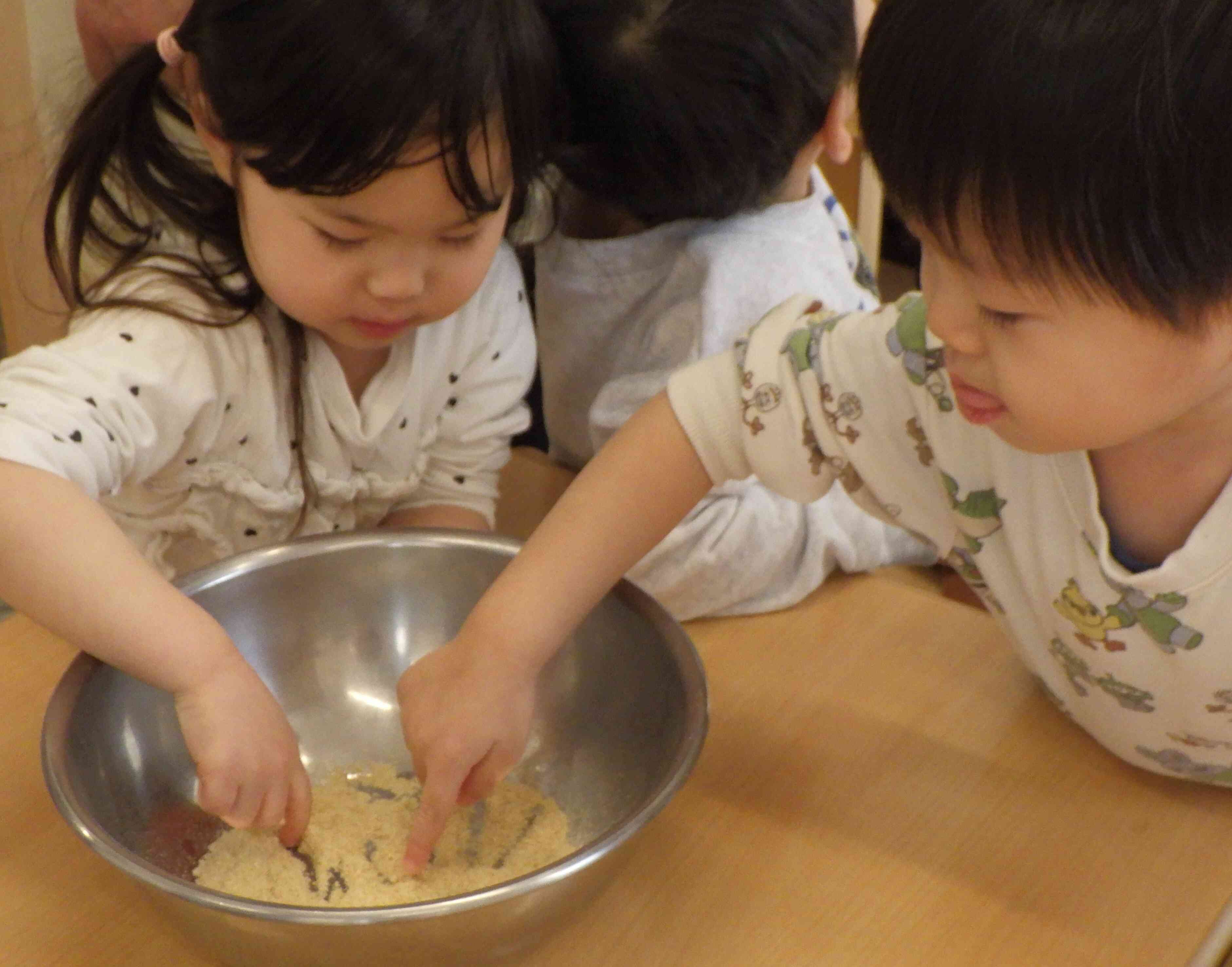 きなこは大豆から出来ていることを知り、みんなで触ったり匂いを嗅いでみたり観察しました!