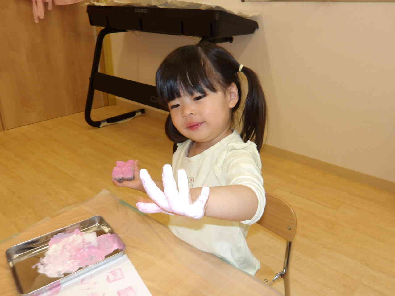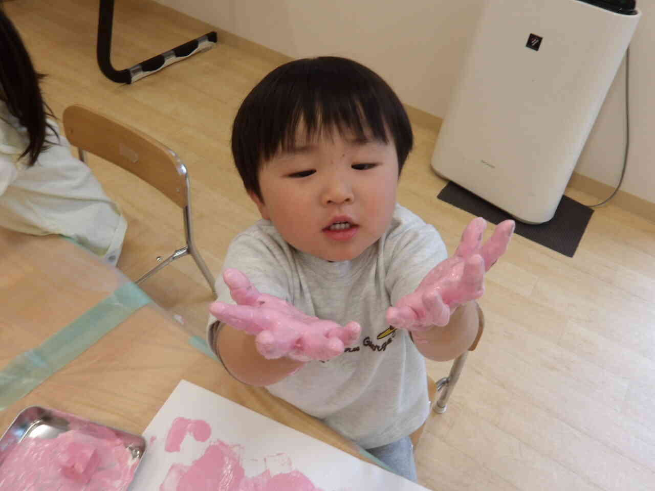 ピンクと白の絵の具をまぜまぜ~!ダイナミックに手で絵具をかき混ぜて画用紙にペタペタ~♬「みてみて~!」ととっても楽しんでいました!