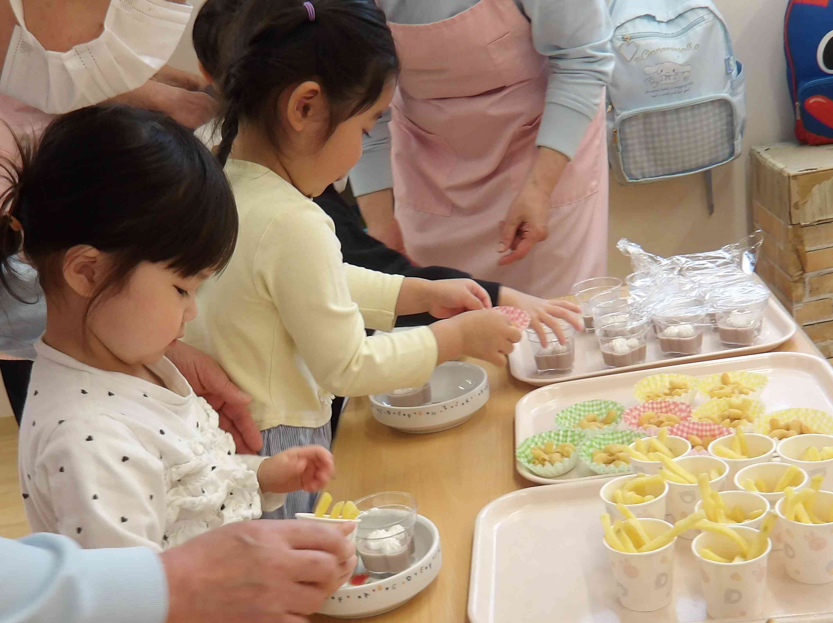年長児さんがもう少しで卒園してしまうので、みんなで思い出作りとしておやつバイキングを楽しみました☆おやつはみんなの人気のメニューを4つ!!栄養士さんが一生懸命作って準備してくれました♬栄養士さんのお話をみんなで聞いて、おやつバイキングのスタートです!