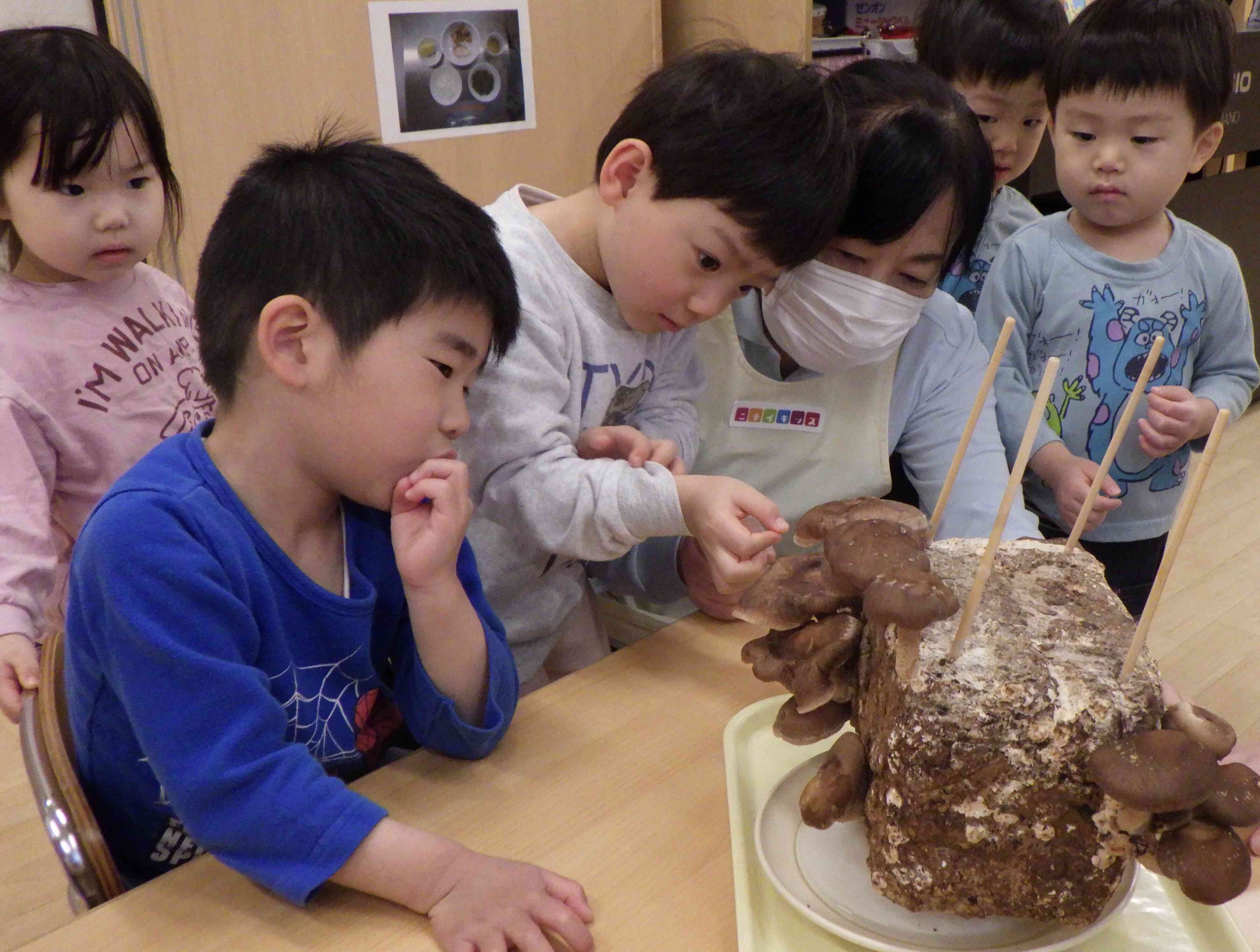 食育でしいたけの栽培を行いました!霧吹きで毎日水をかけて「おおきくな~れ!」と観察しています☆