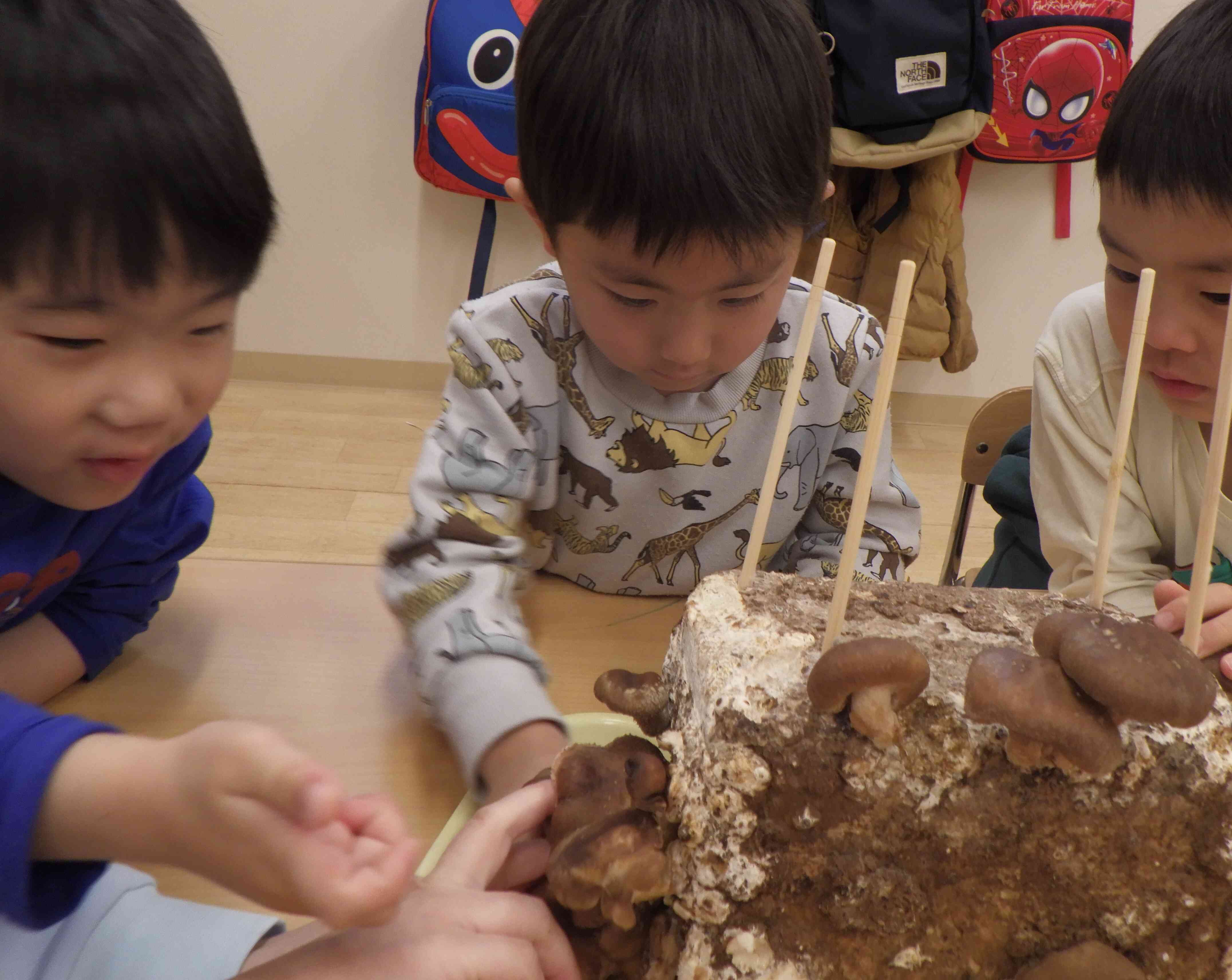 「しいたけってこんな風にできるんだね!」「きのこの匂いがすごい!」などと観察しながら楽しみました♬野菜の収穫体験とってもいい経験ですね☆