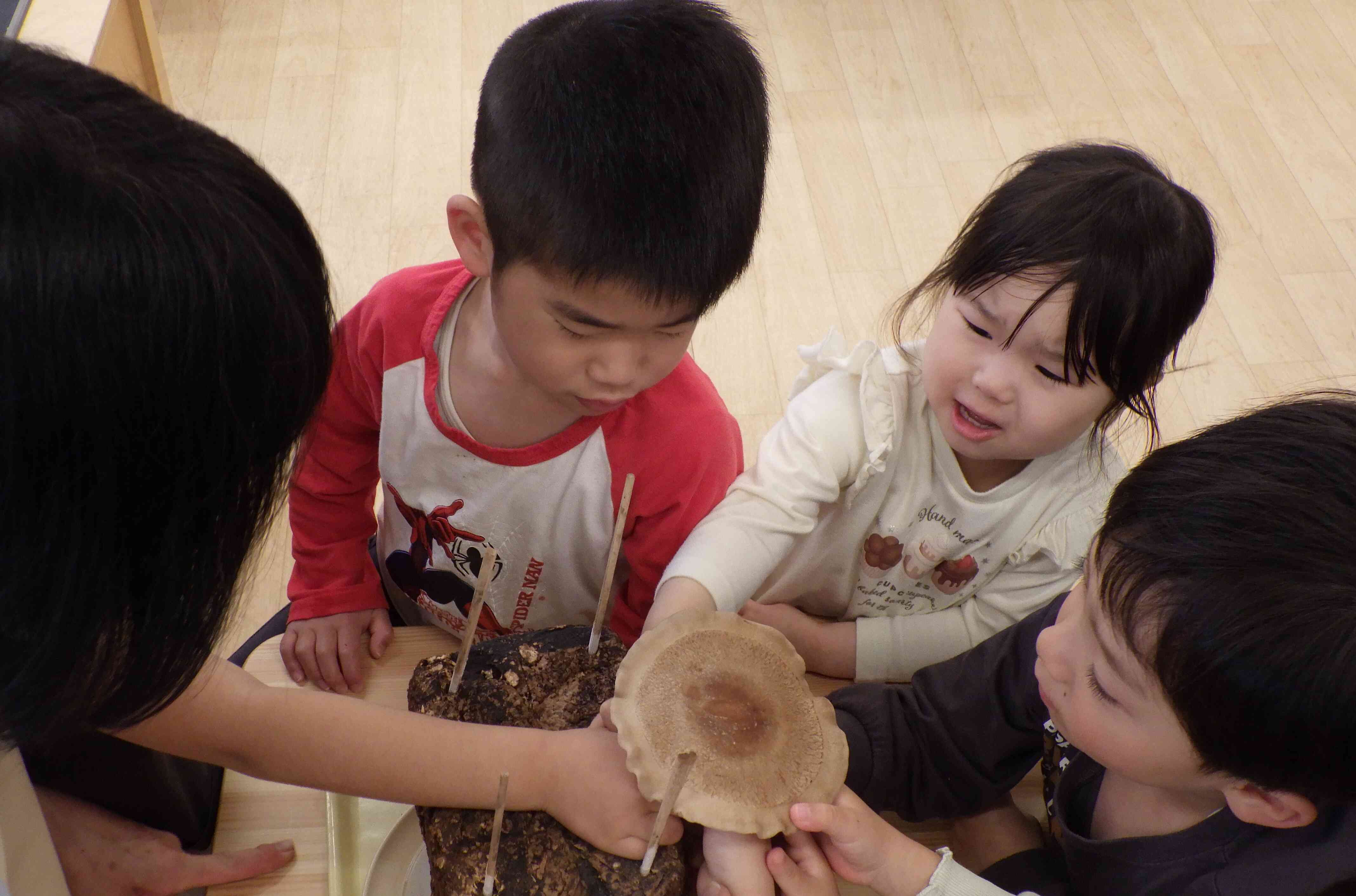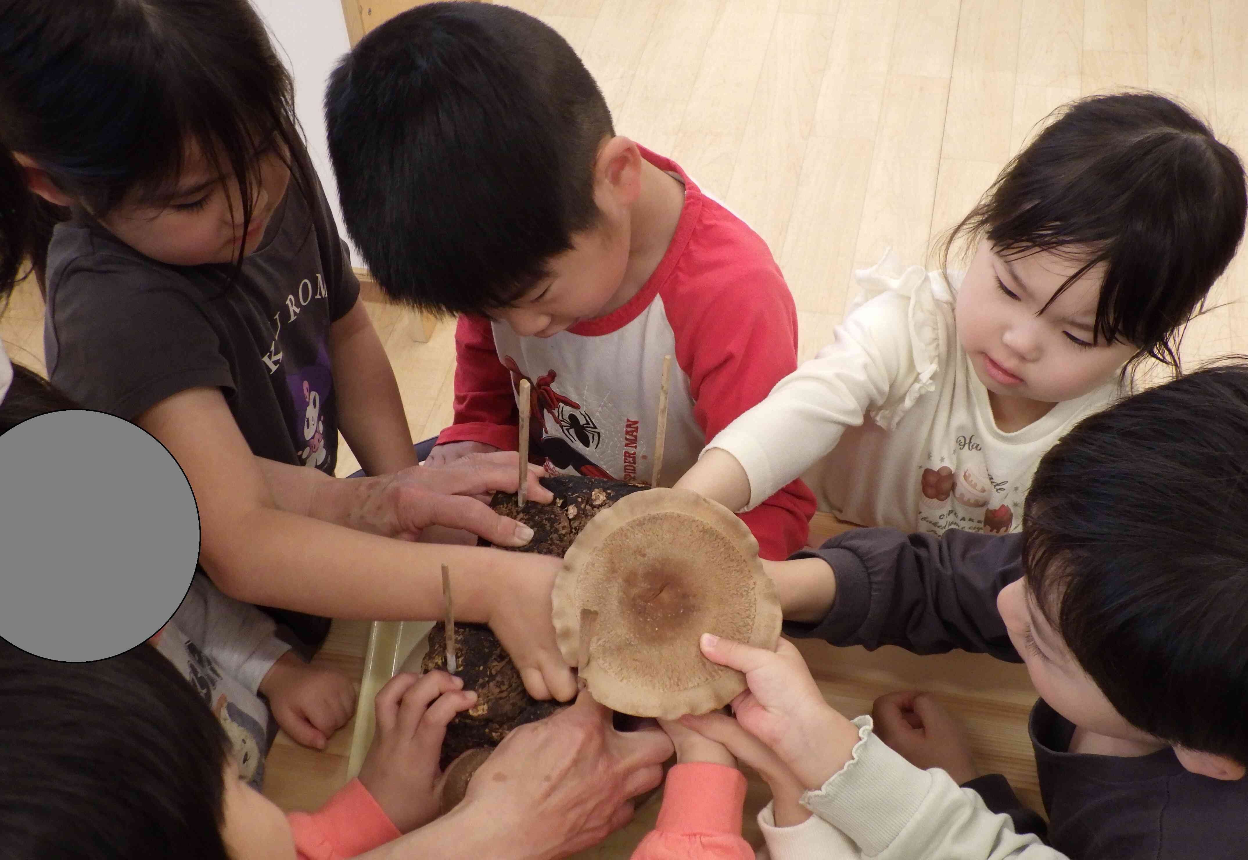 おおきくなったシイタケをみんなで収穫しました!「大きくなりすぎ!」「きのこの匂いがする~」「おばけしいたけみたい!」とワイワイ楽しみました♬