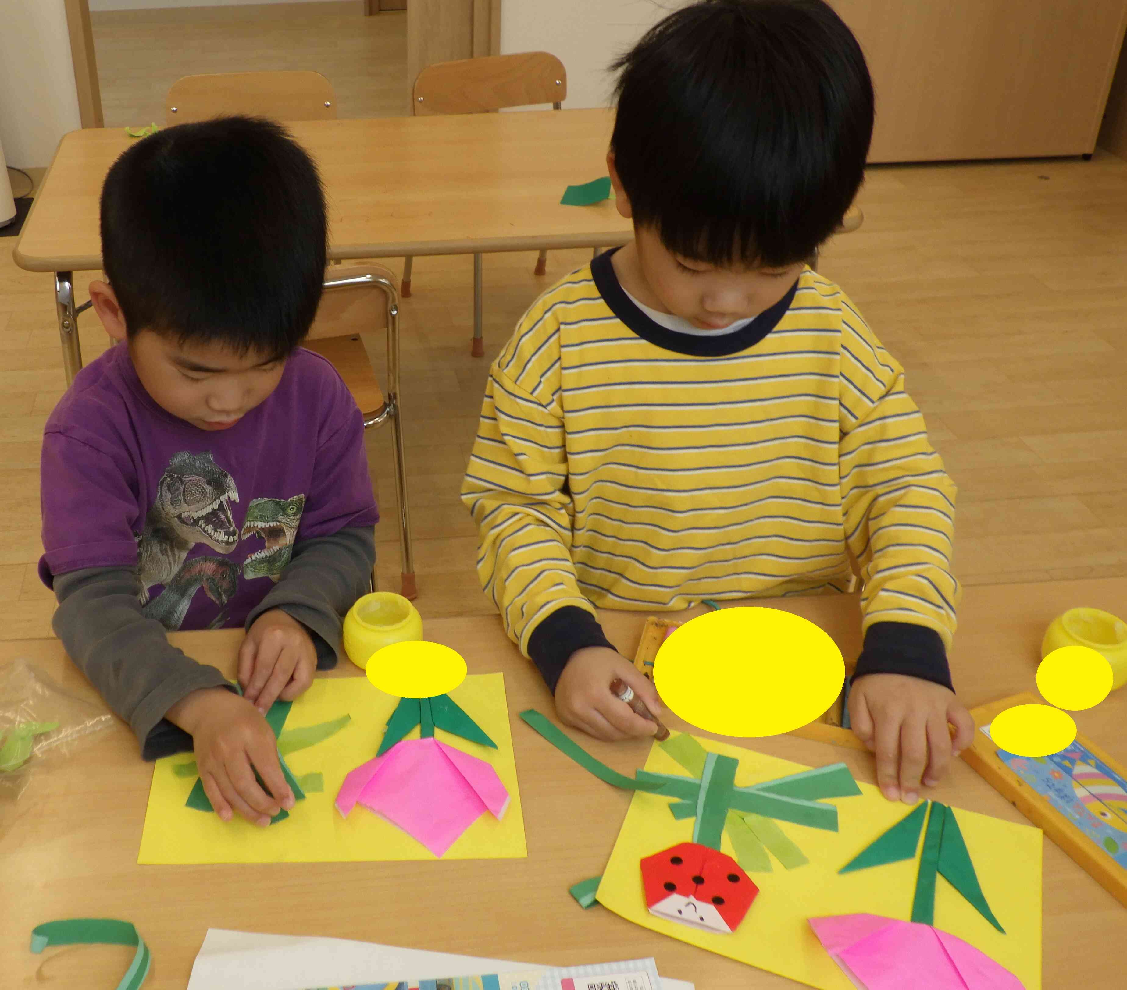 4月の製作のテーマは【てんとう虫】です!折り紙でてんとう虫とチューリップを折りました♬「難しいな~」といいながらも一生懸命な子どもたちの姿を見てさすが幼児組さんだなと成長を感じることが出来ました★