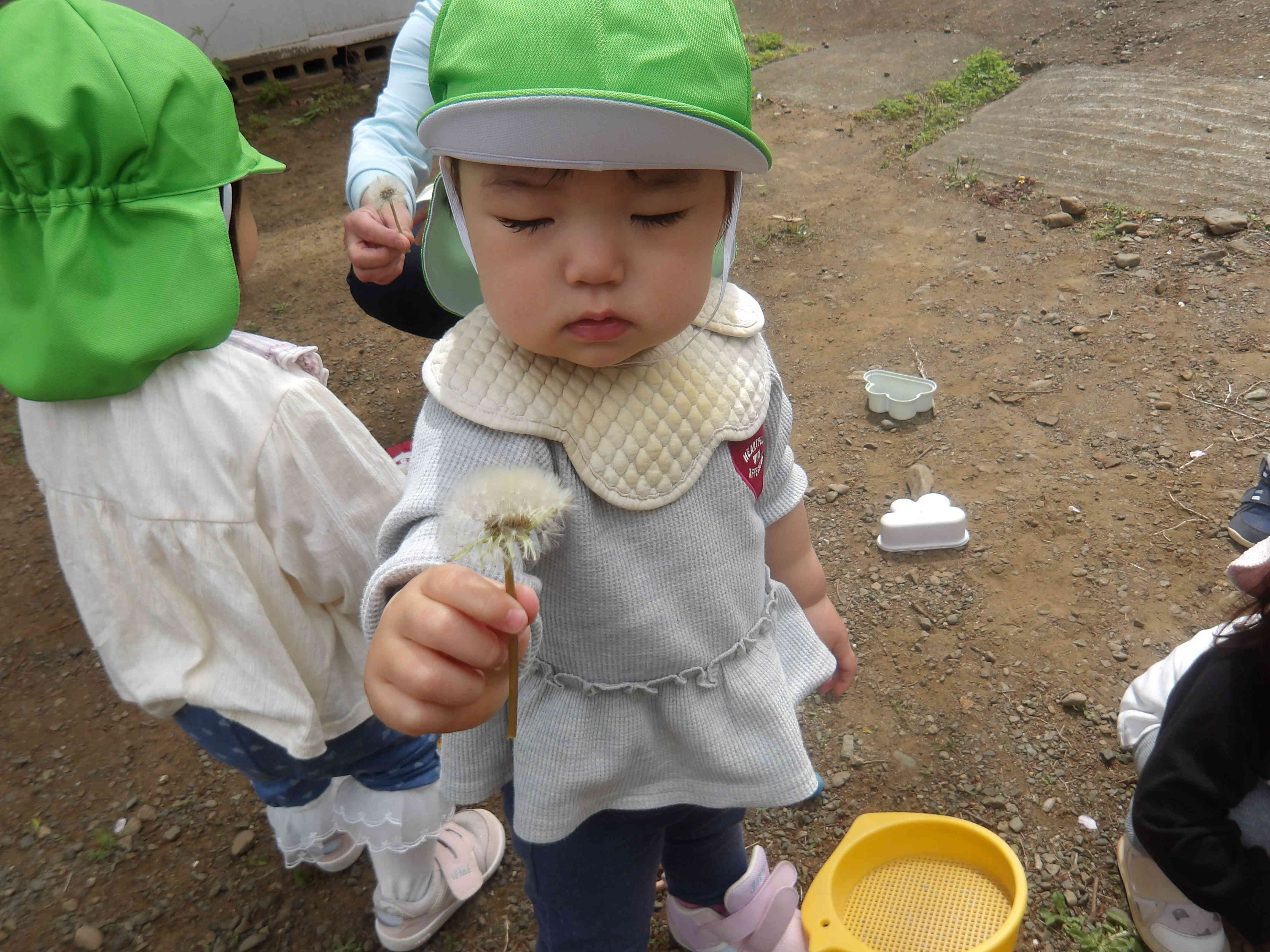 たんぽぽの綿毛を嬉しそうに持ちながら「せんせ~」と見せてくれました☆