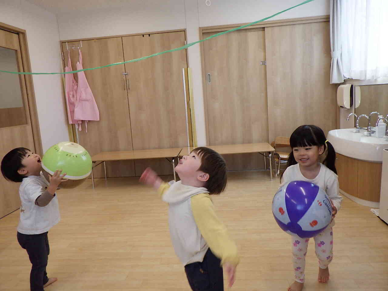 雨の日は戸外に出ることが出来ないので残念ですよね!子どもたちも「お散歩行きたいな~」といっていますが、雨の日のお楽しみもあります!風船遊びやマット運動、鉄棒、跳び箱など雨の日の室内遊びも楽しめています☆二歳児クラスでは、風船&ビーチボール遊びを楽しんでいました♬高いところに風船を吊るし、それを狙ってビーチボールを投げていたのですが、なかなか難しかったようで「よいしょ!」「当たれー!」などと元気な掛け声をかけながら一生懸命でした!