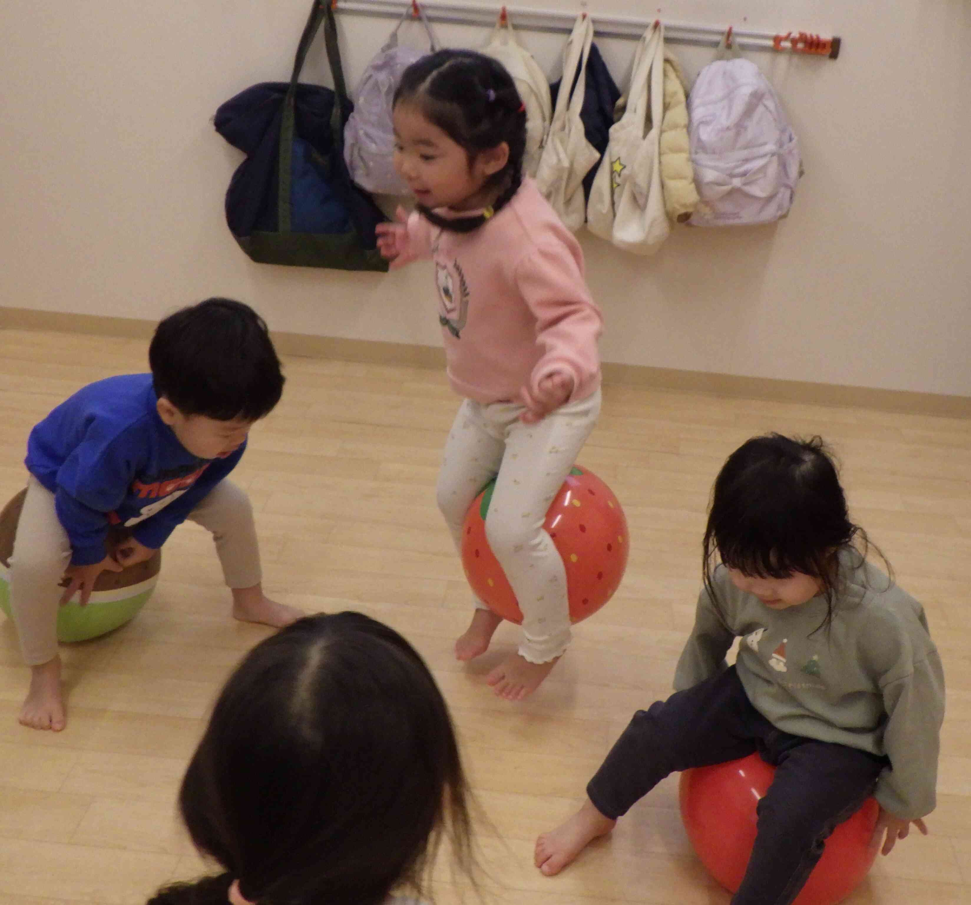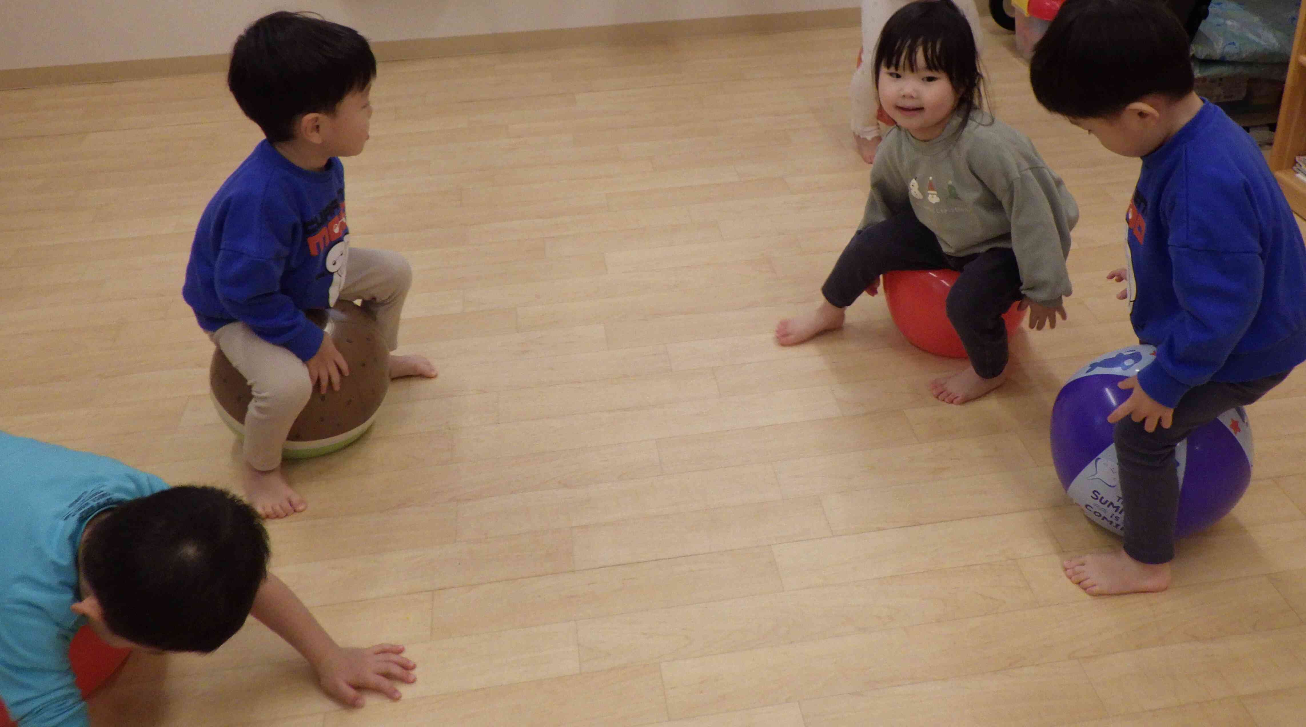 戸外で遊ぶボールとは大きさも硬さも違うのでまた違った楽しみがあるようです♬「みてみて~!上手に足で挟めるよ~☆」「ビーチボールって楽しいね!」と大喜びな子ども達です♬