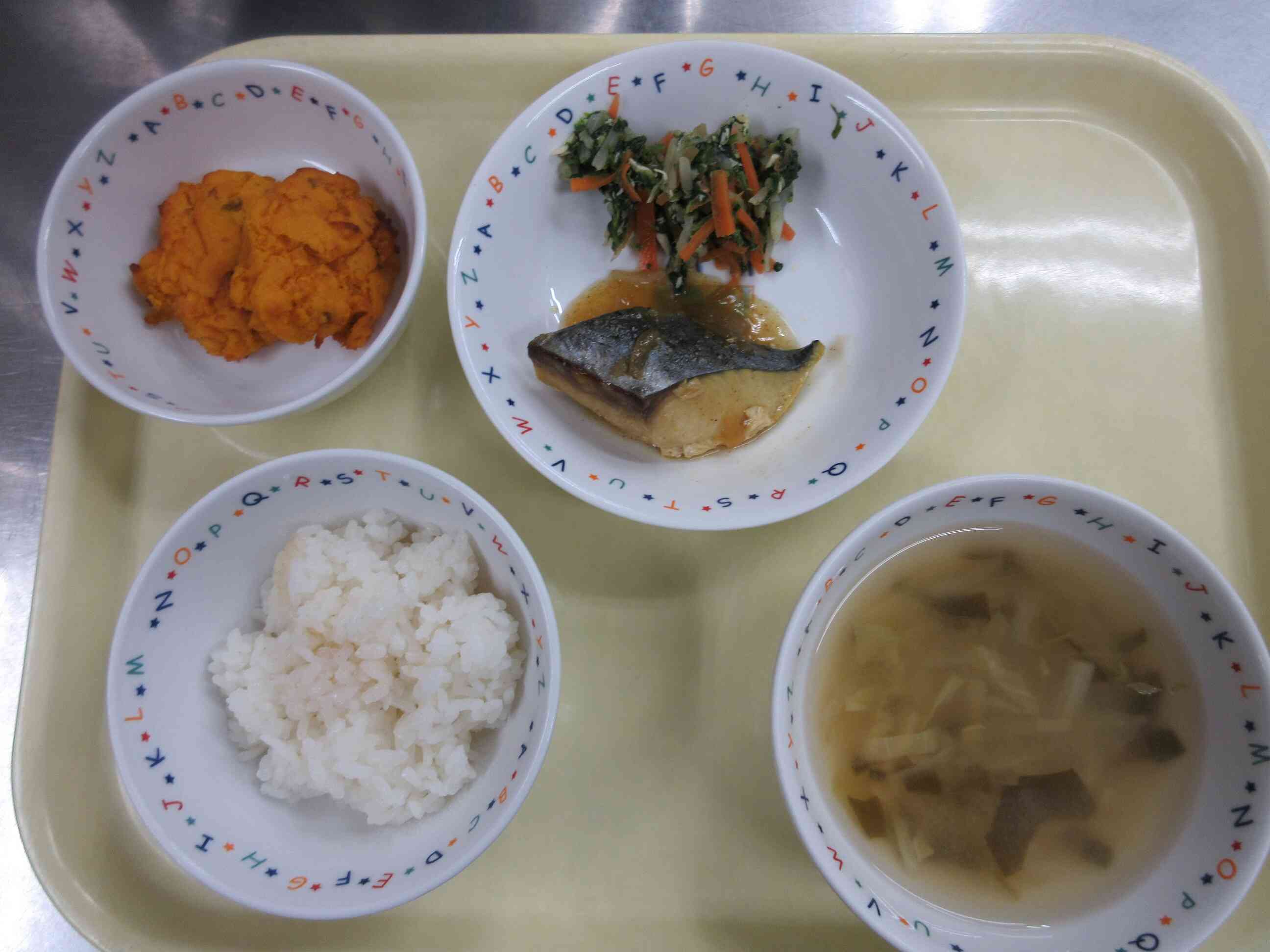 お昼:高野豆腐のそぼろ丼、もやしのおみそ汁、かぼちゃサラダ おやつ:だいこんのおやき ★完食の子どもが多く、人気のメニューとなりました。