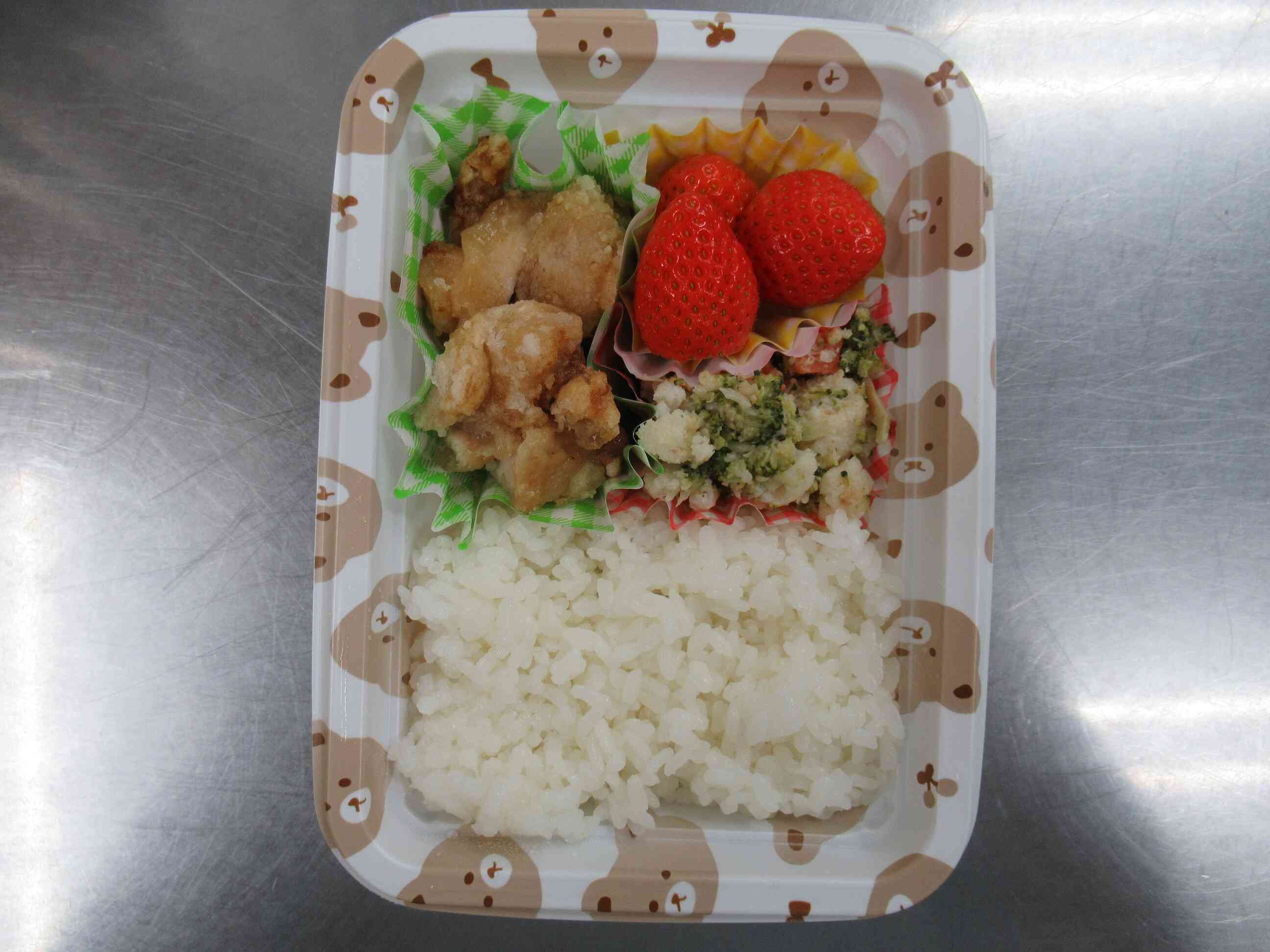 完了期のお昼:軟飯、キャベツのおみそ汁、鶏肉のソース照り煮、ベイクドポテト、ジャクソンフルーツ(苦みの少ないグレープフルーツの仲間) ★完了期の食事では、幼児食を小さくカットして提供しています。クラスの担任の先生と相談しながら、発達に合わせて、食べやすい大きさにカットしています。