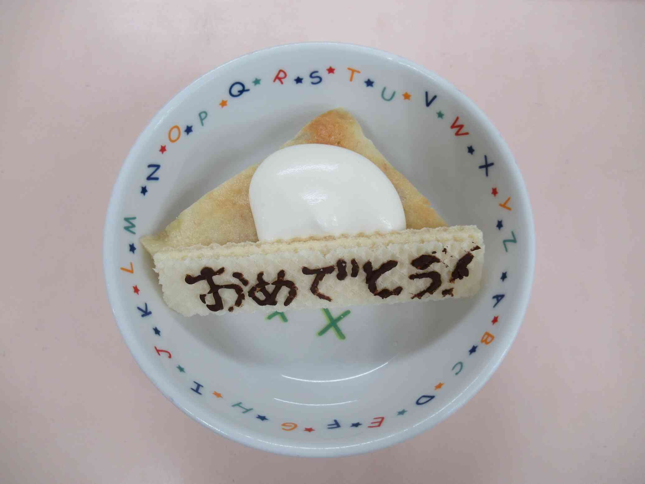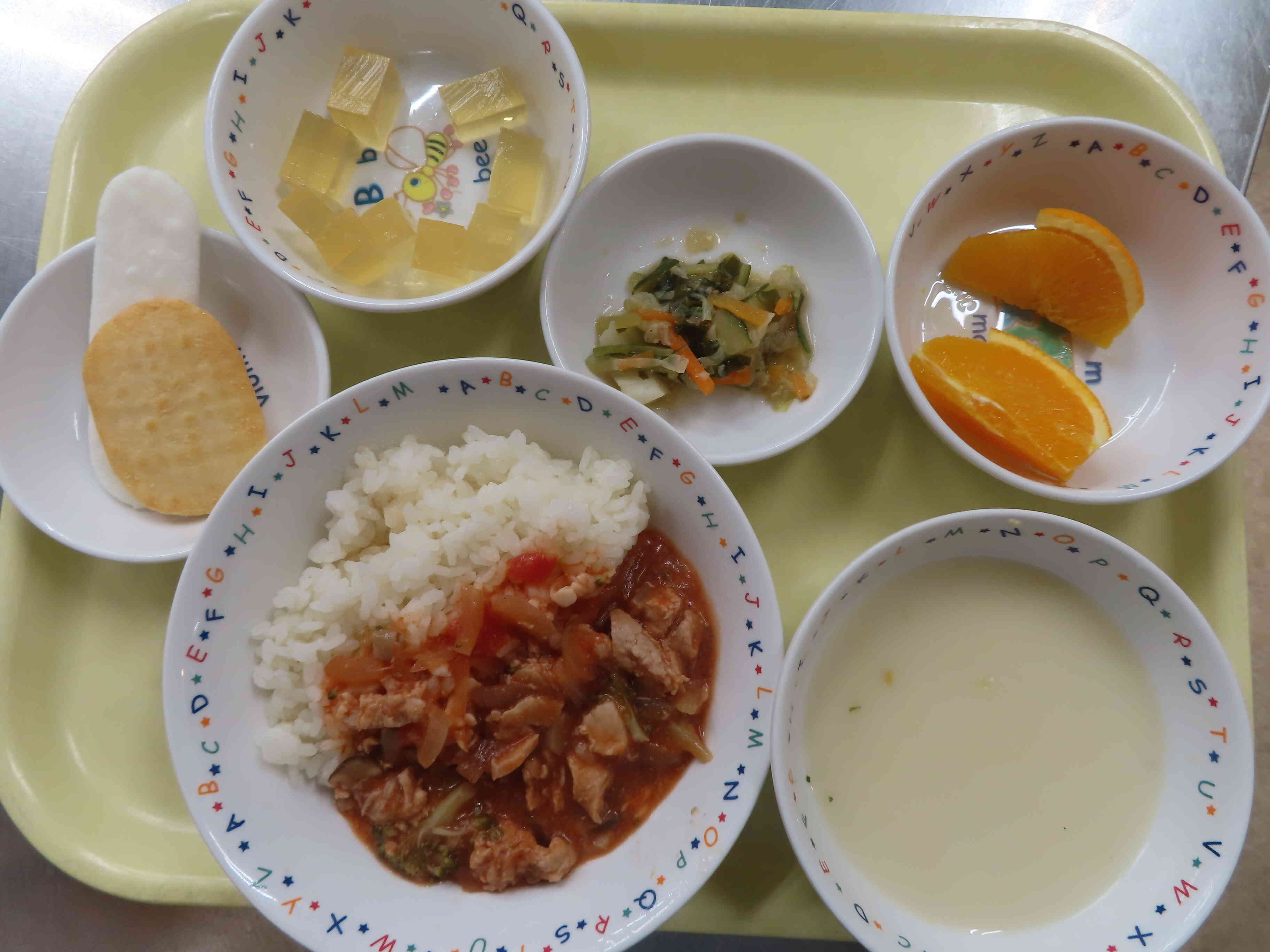 • お昼:ハヤシライス、クリームコーンスープ、わかめサラダ、オレンジ おやつ:牛乳、りんご寒天、おせんべい ハヤシライスは、トマトベースの味で酸味が苦手な子どももいましたが、5歳クラスではたくさんおかわりしました。