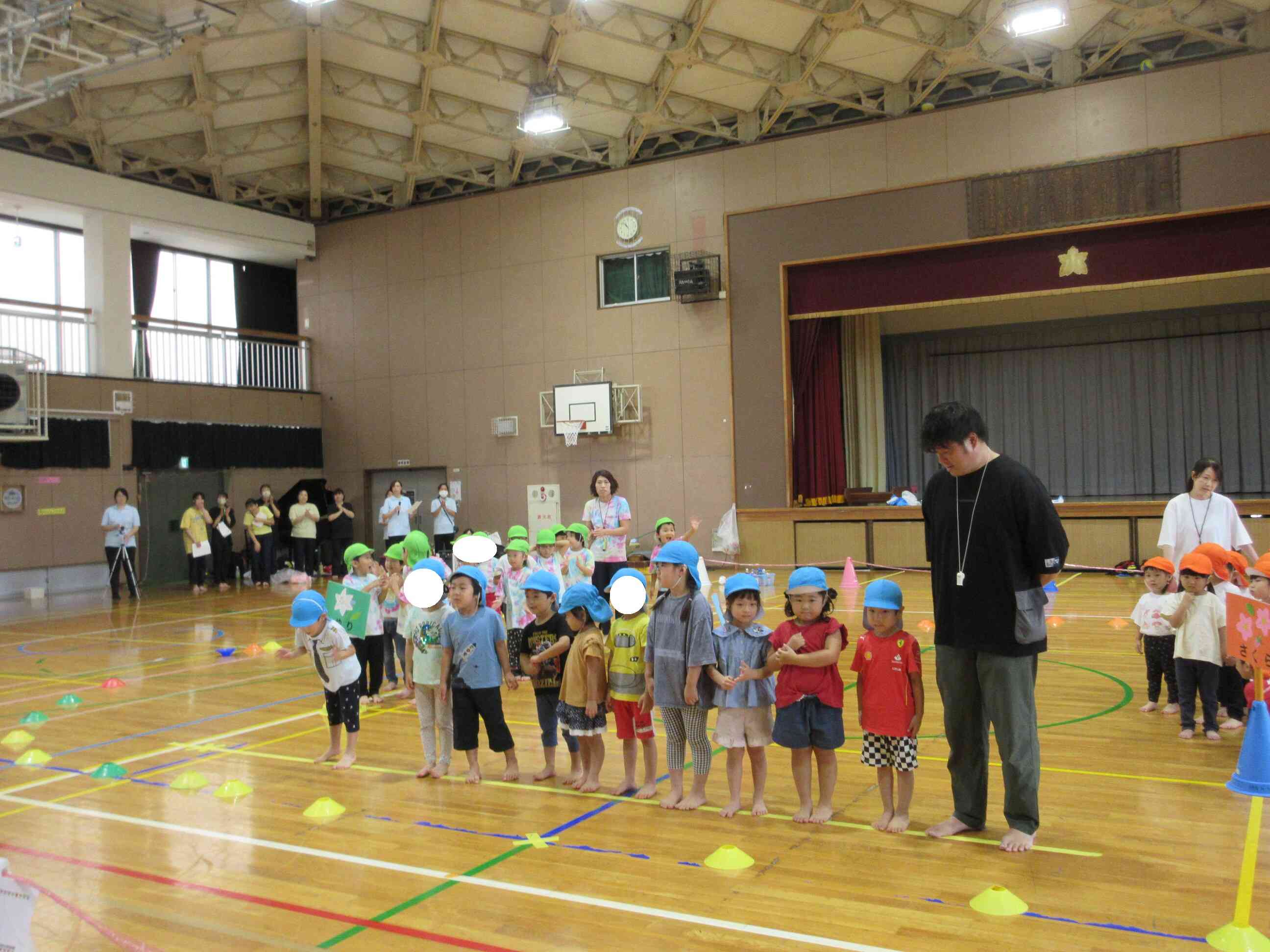 皆ドキドキワクワクの中で始まった開会式では4歳児クラスのお友達の「始めの言葉」を聞き、準備体操をしました。子ども達みんなクラス競技を頑張ります!