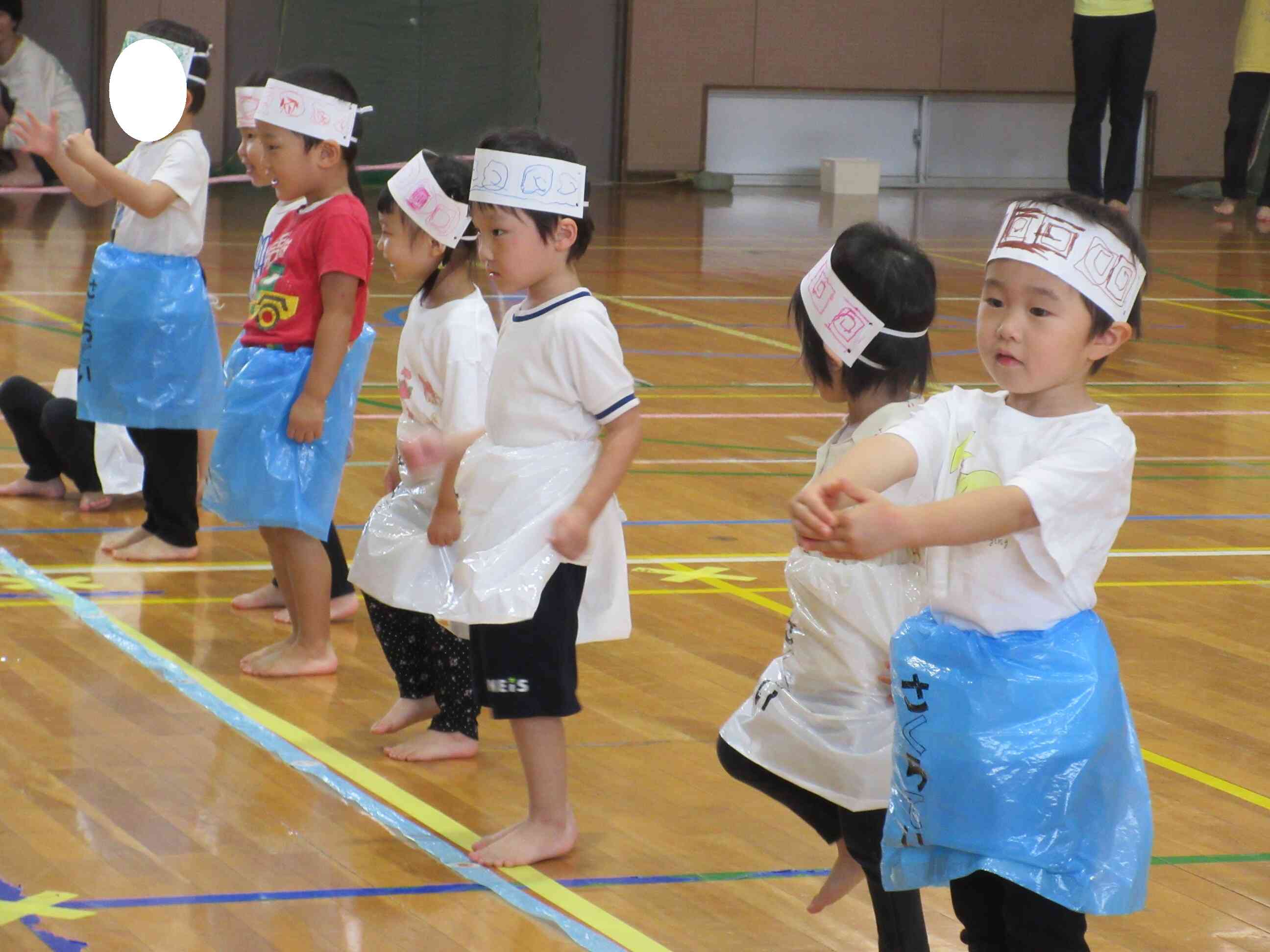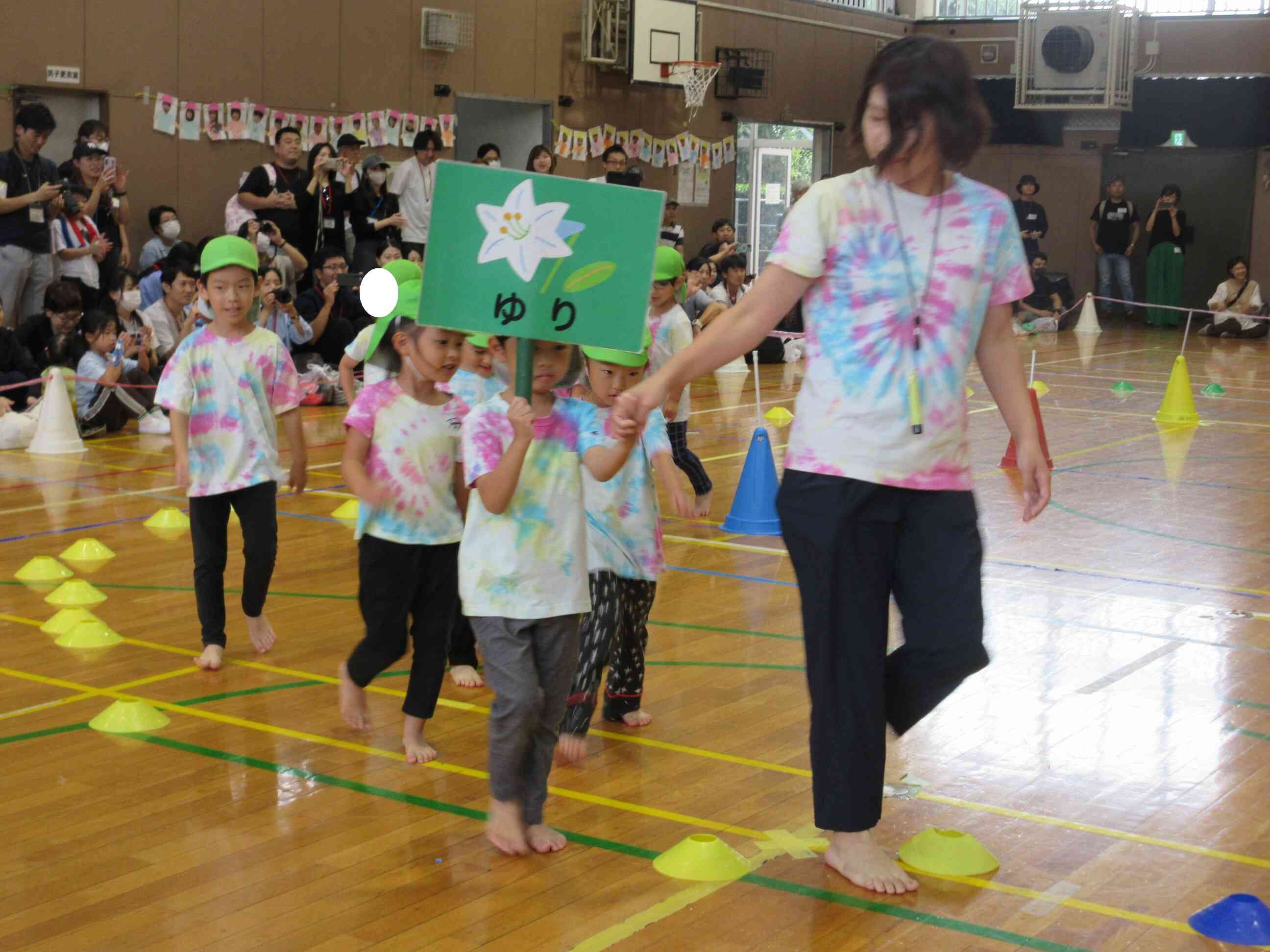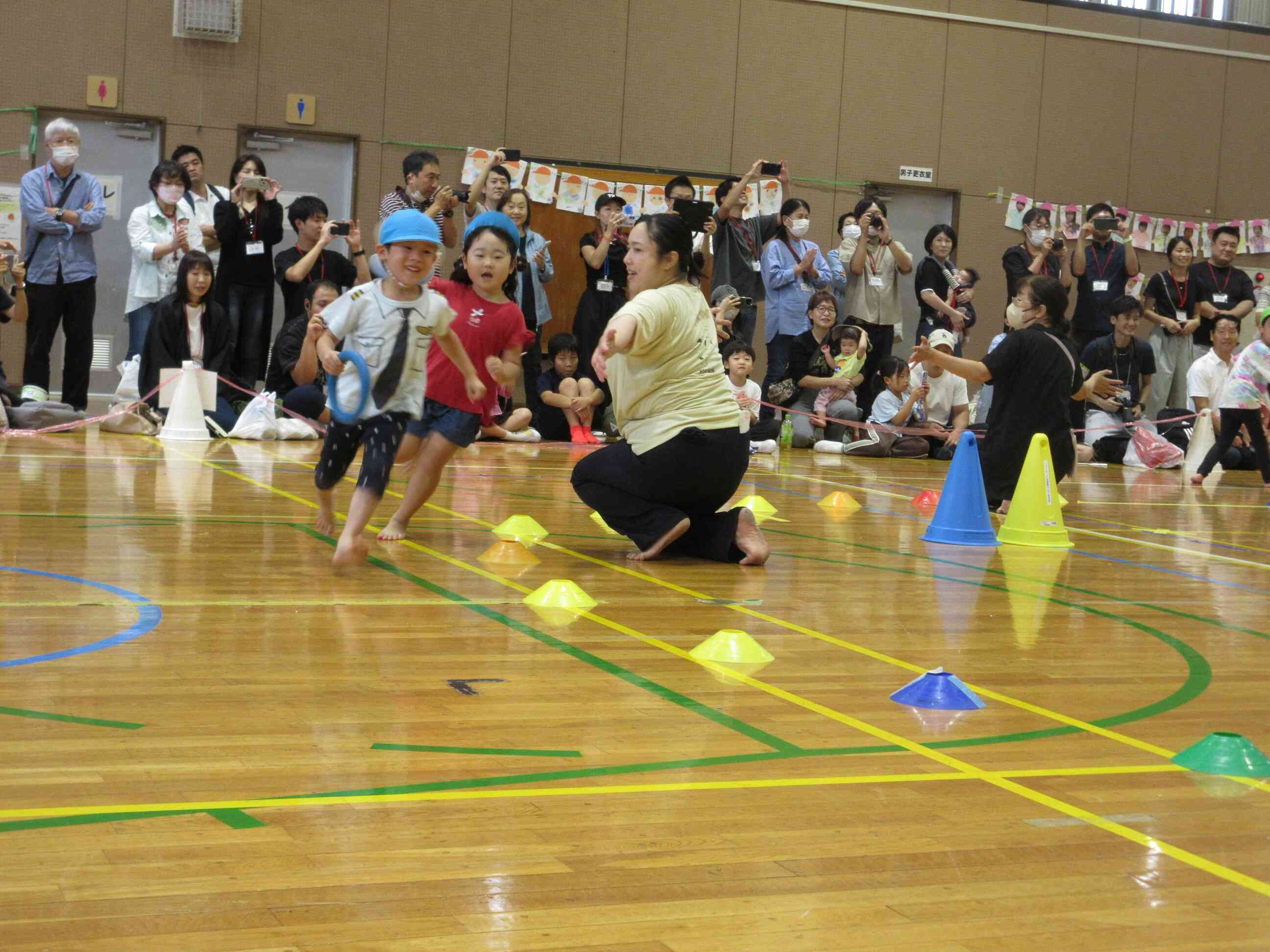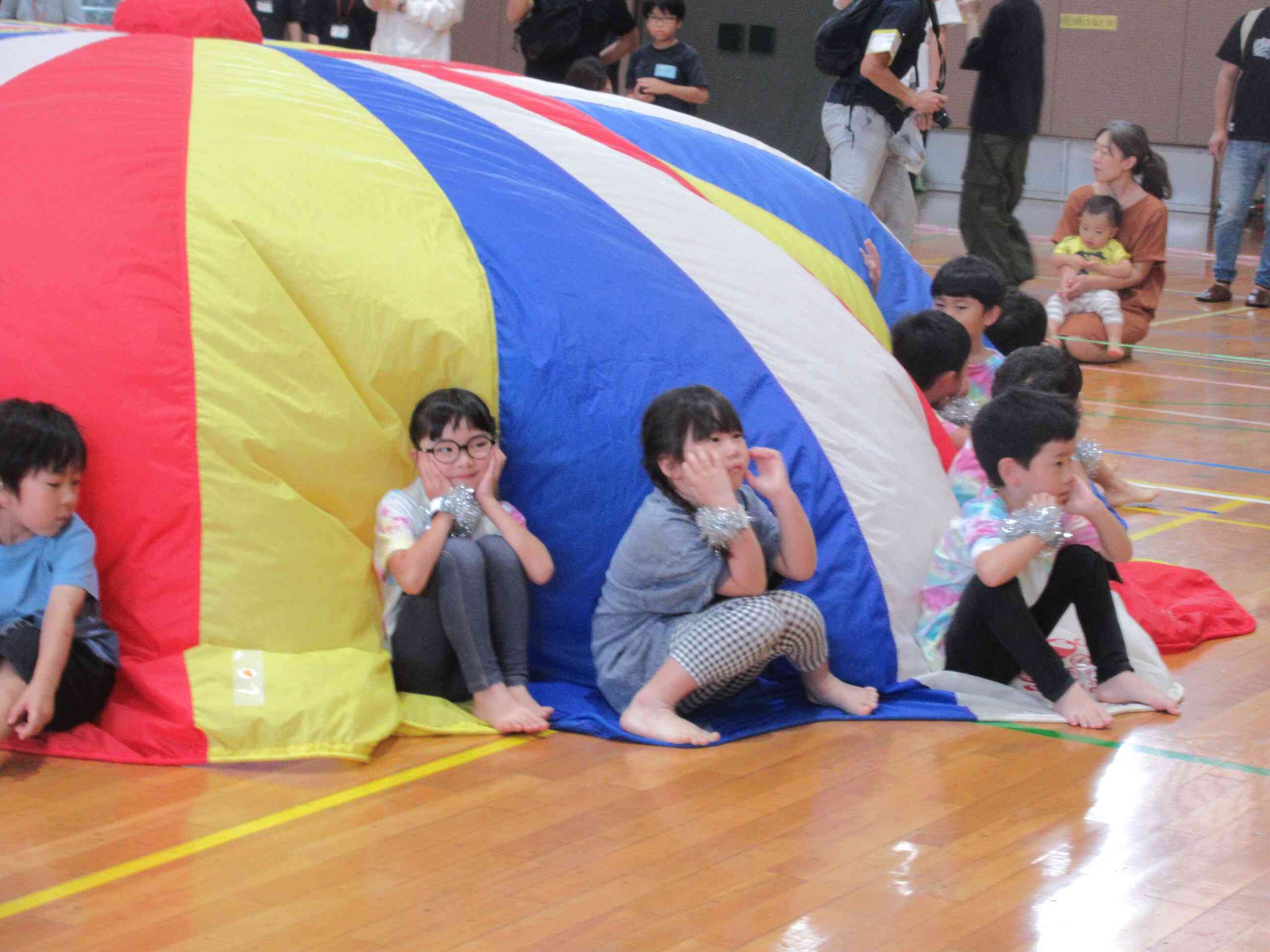 4歳、5歳児クラスで行うパラバルーン。猛暑で外に出られないときは室内で練習をしてきました。運動会当日ではお父さんお母さんに見守られる中でたくさんの技を披露することが出来ました!