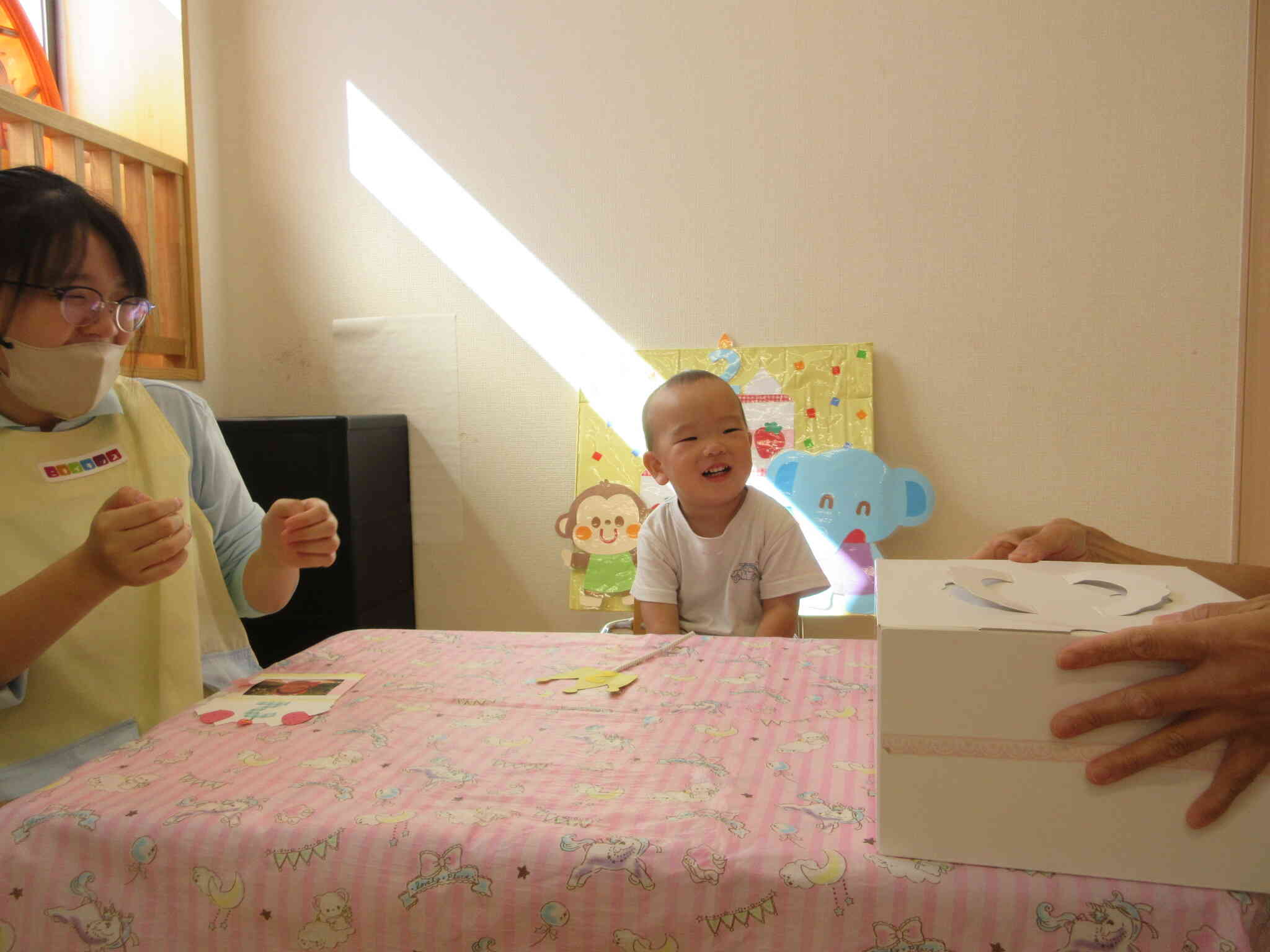 最初は少し緊張した表情でしたが、プレゼントやカードをもらったり