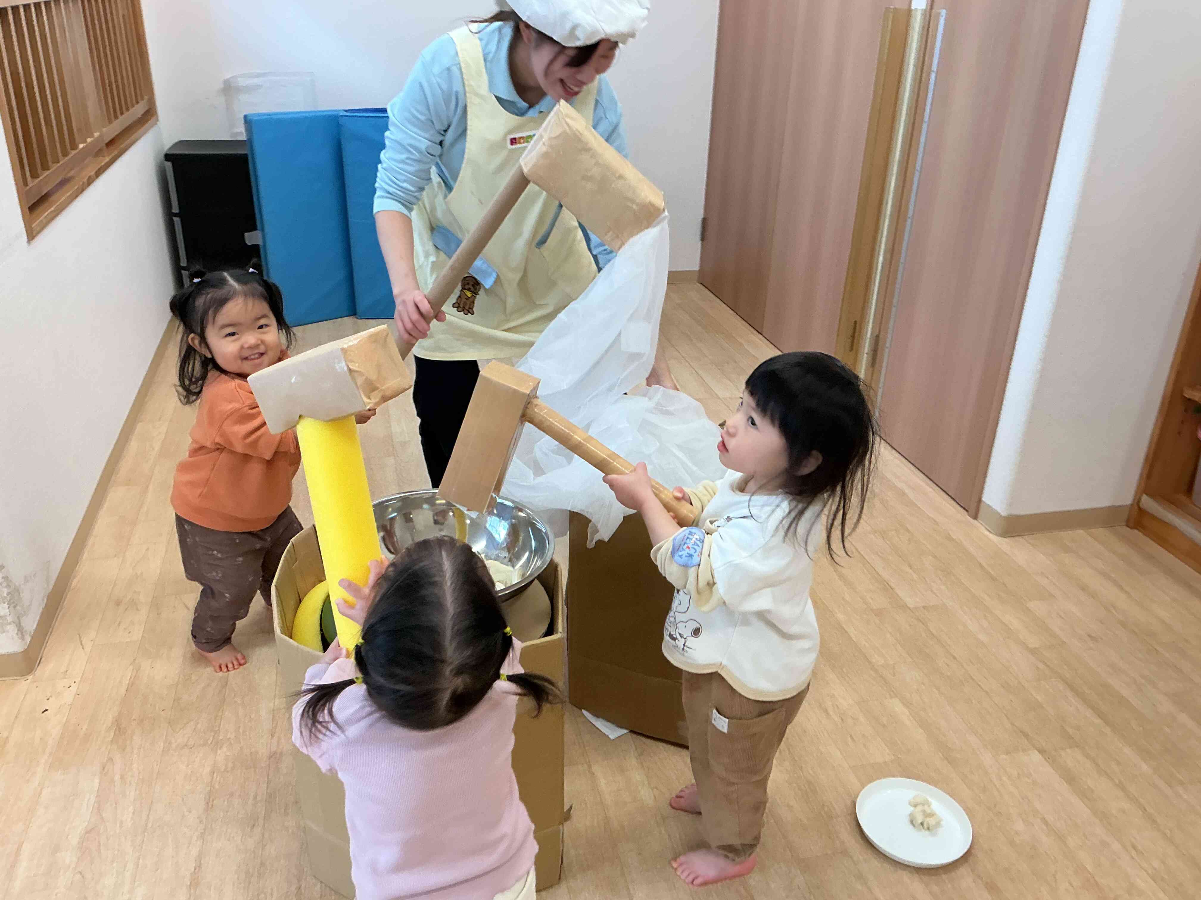 もちもちビヨーンとした感触を触ってみたり、お餅をつくと、、、?