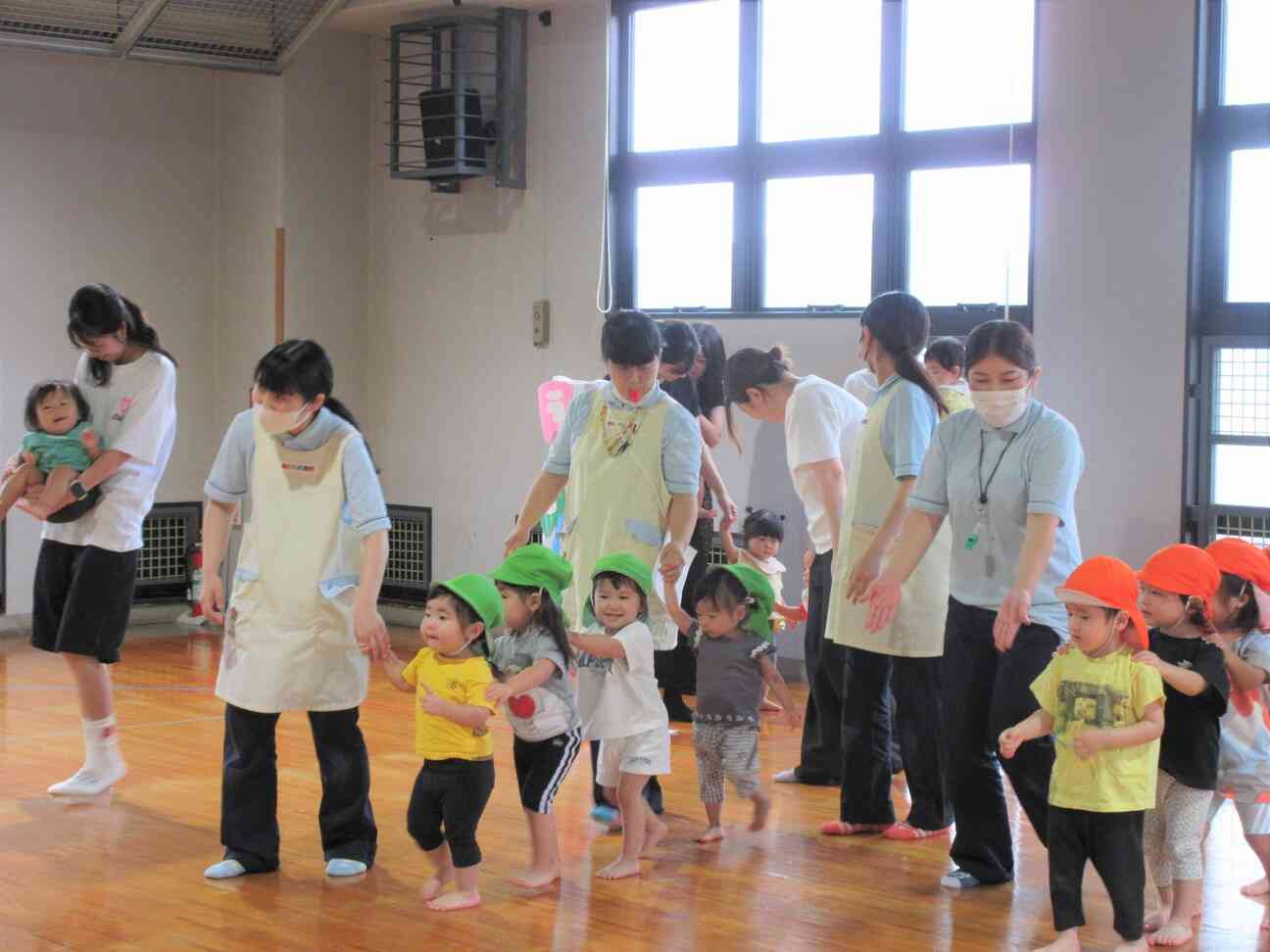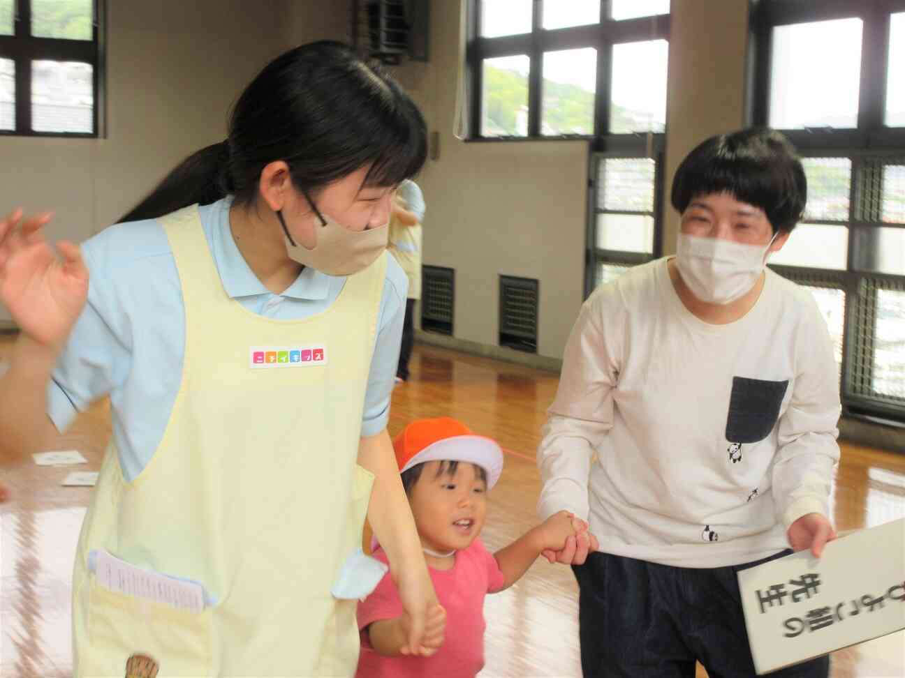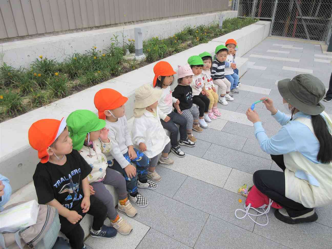 在園児さんの新入園児さんの近くに行ったり、顔を覗いたり、遊びに誘ったりと興味津々な様子が微笑ましいです。