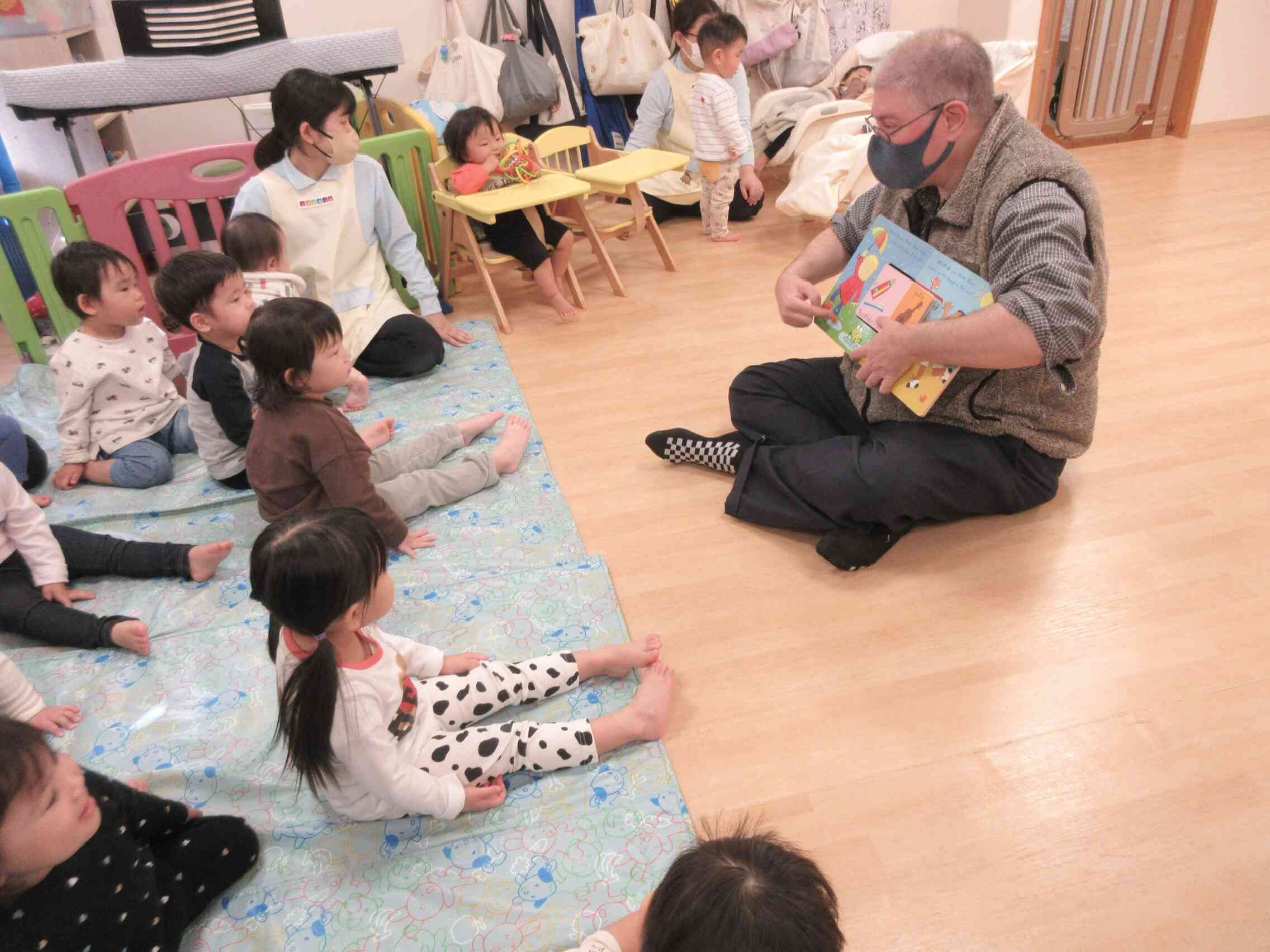 先生が読んでくれる絵本を興味津々に見つめる子どもたちです。