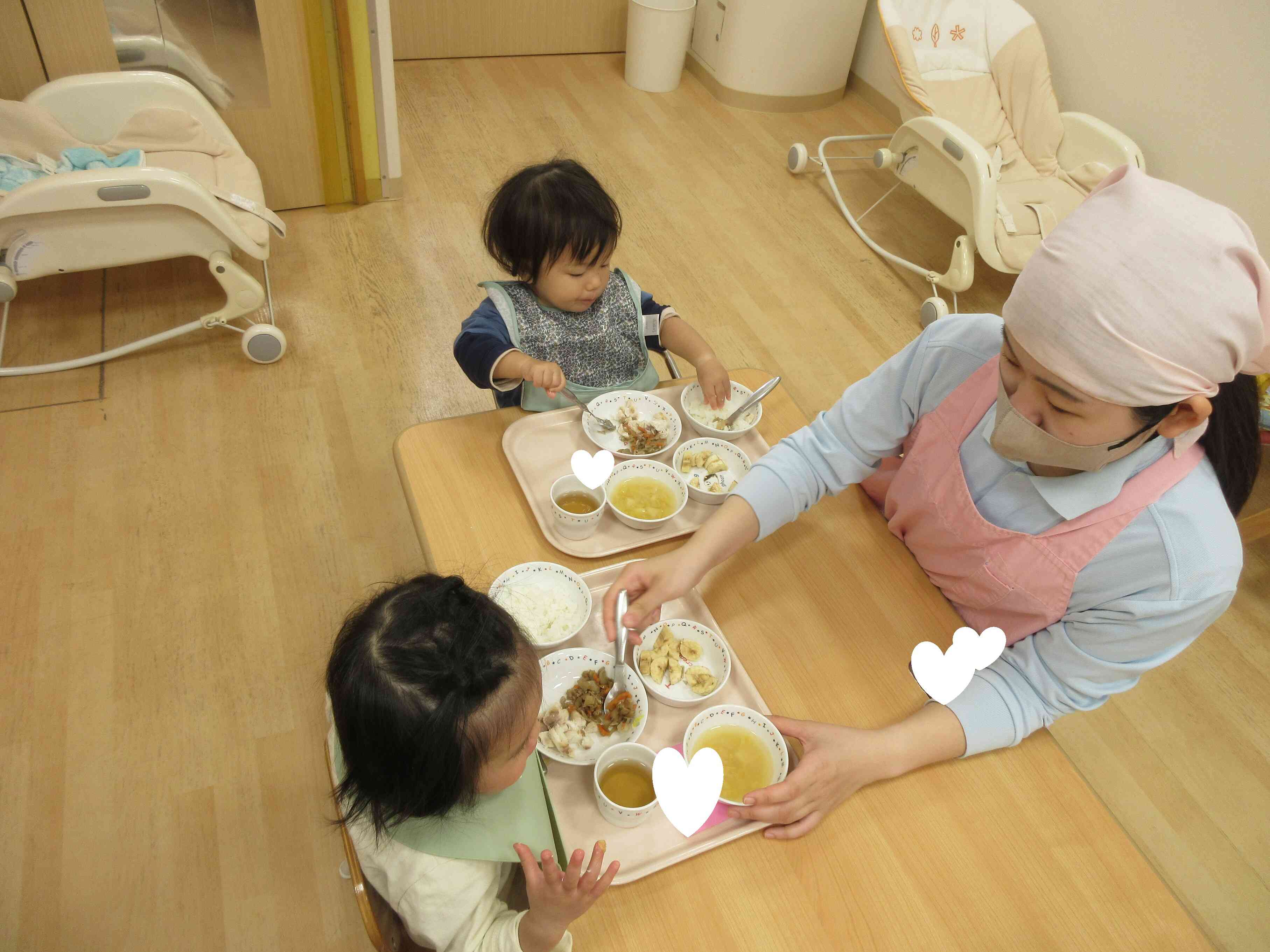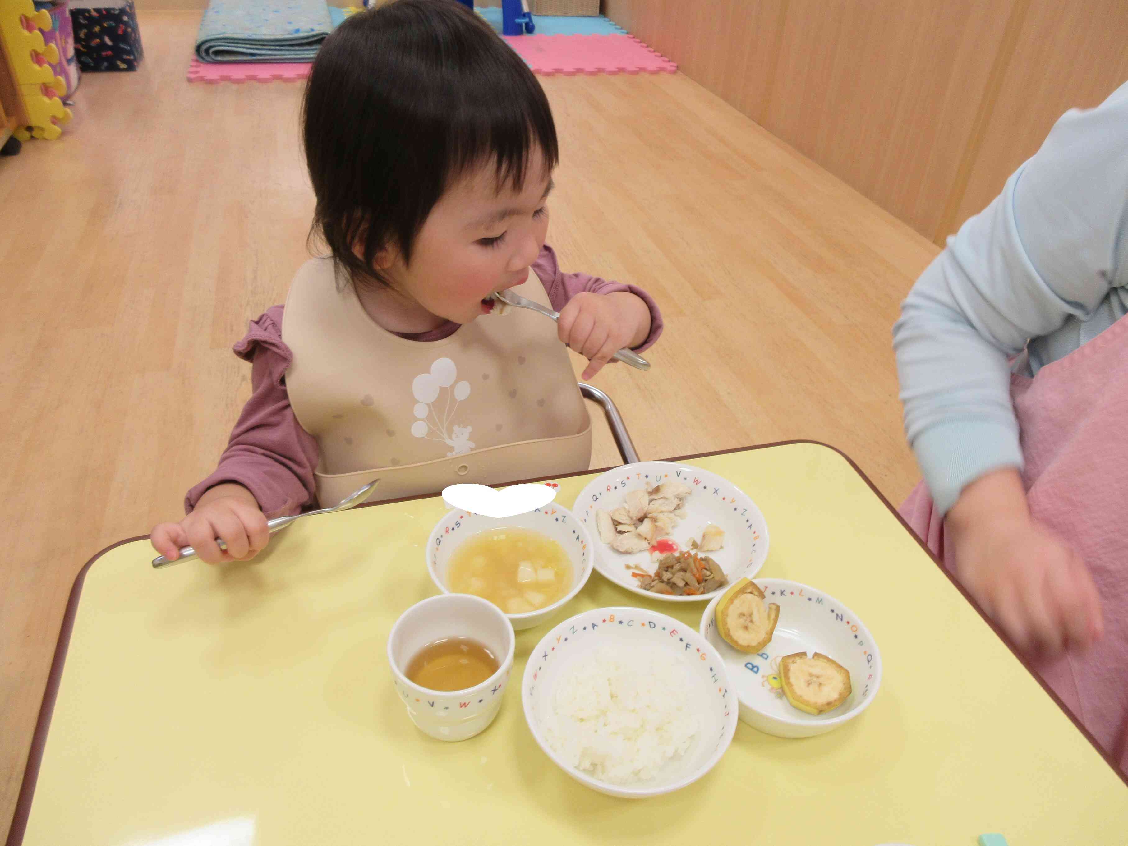 給食の時間が待ち遠しいお友だち!「いただきます」のご挨拶をすると、勢いよく食べてるよ♪