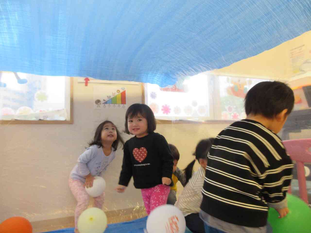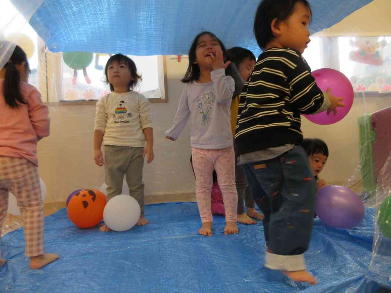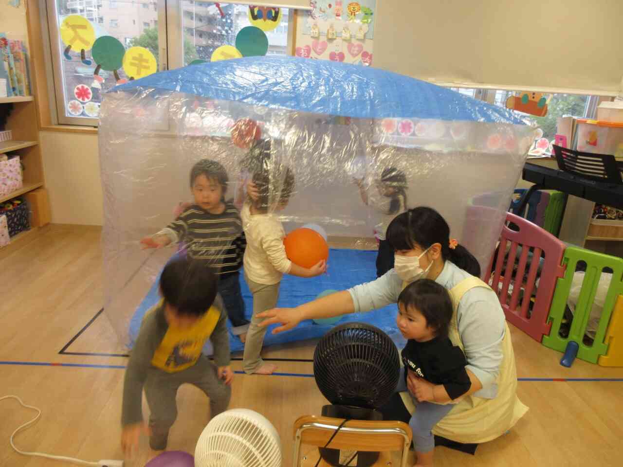レジャーシートを使ったハウスの中で風船を飛ばして遊びます。