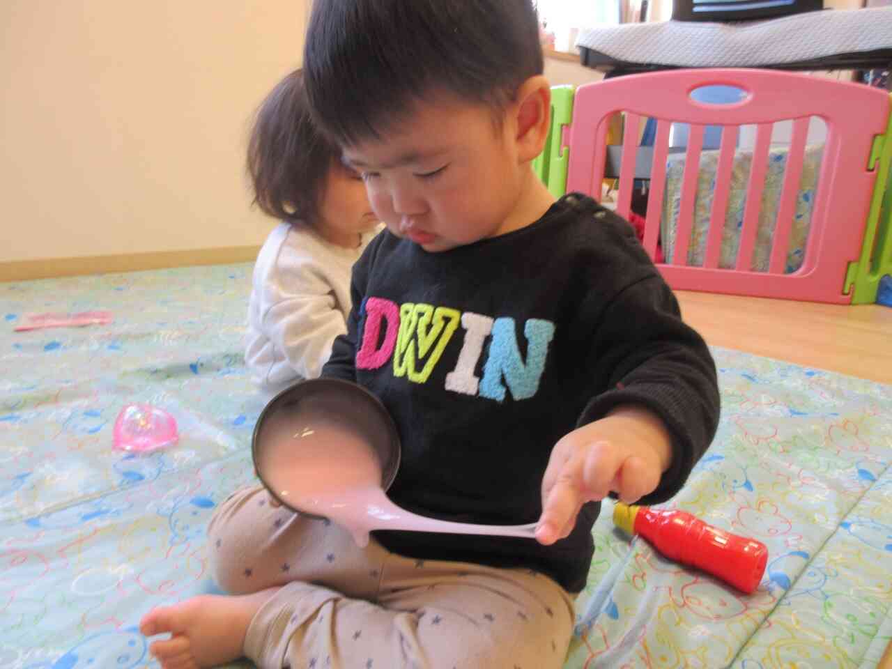スライムを容器に移して感触を楽しんでいました!