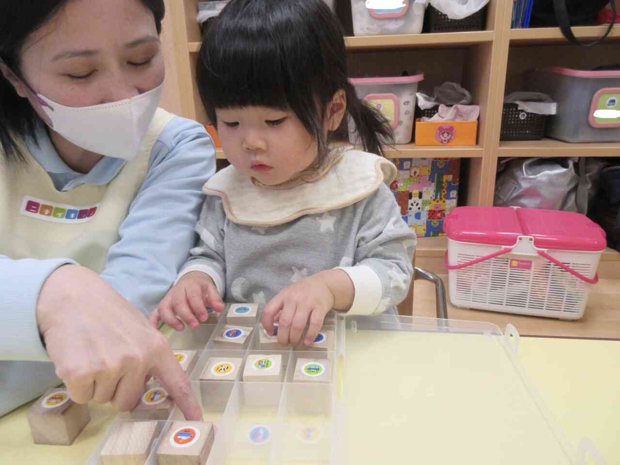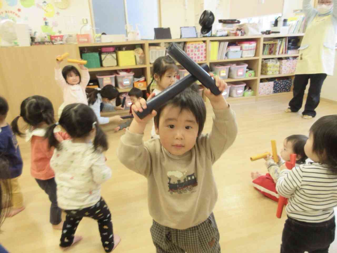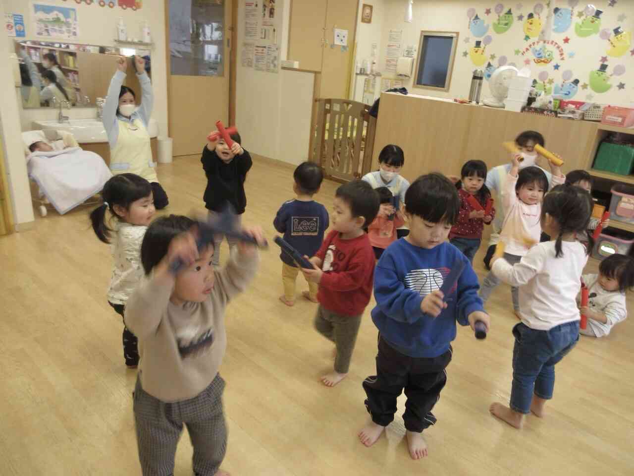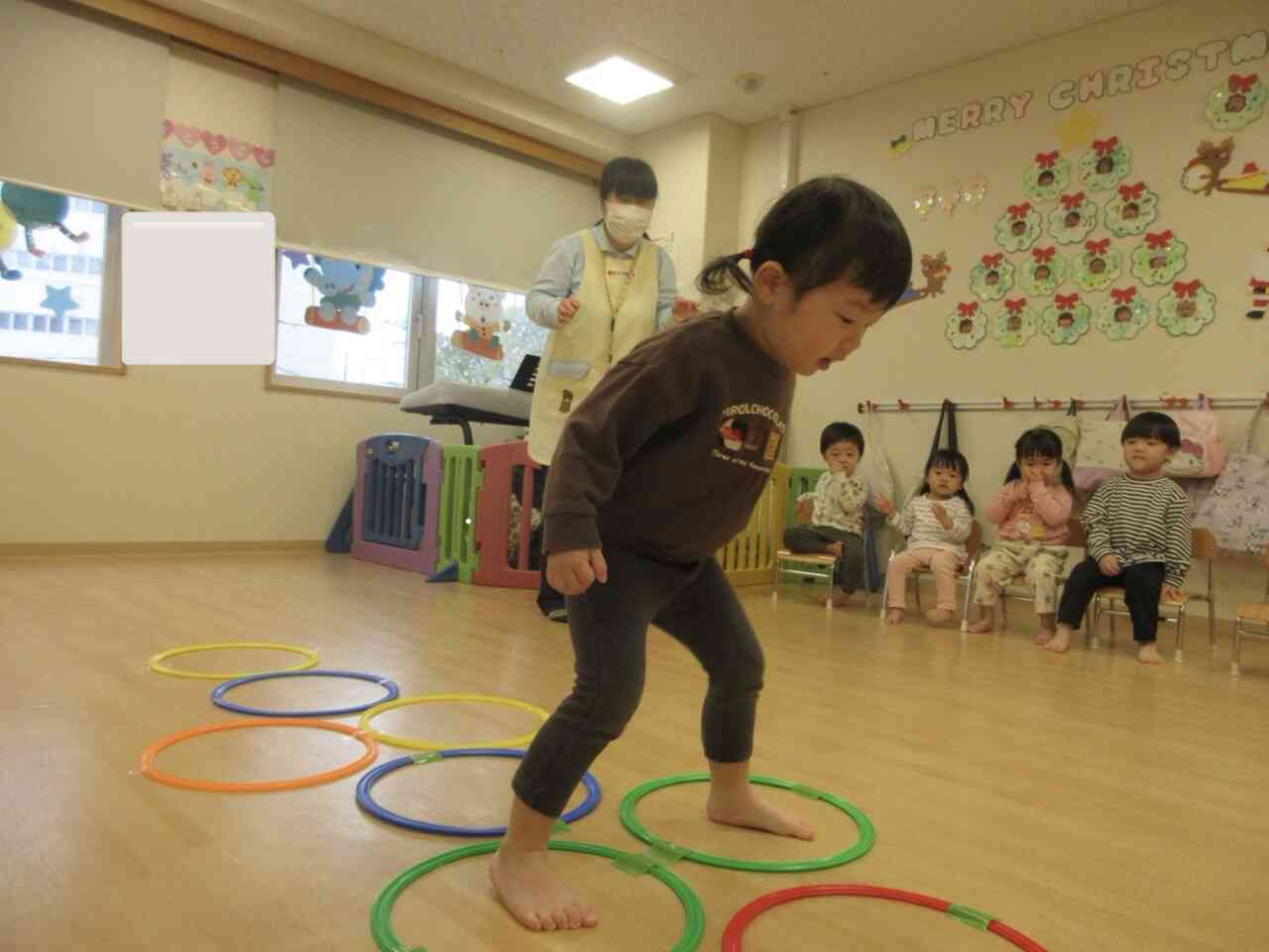 寒さが厳しく戸外での活動が厳しい日には、お部屋の中でリズム遊び、運動遊びや、指先遊びなどの活動に取り組みました。