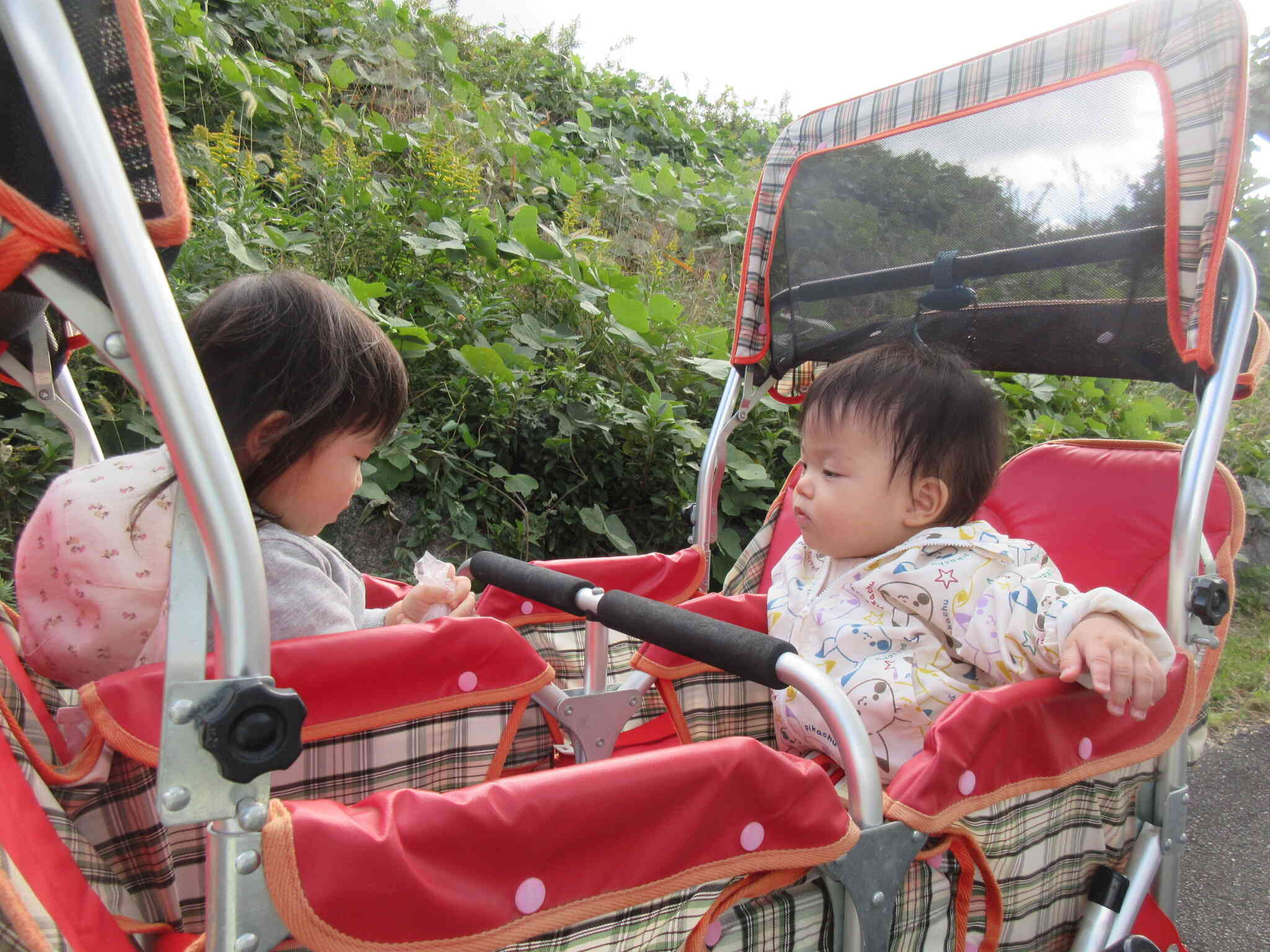 ベビーカーに乗ったり保育士とてをつないで歩いたり・・・